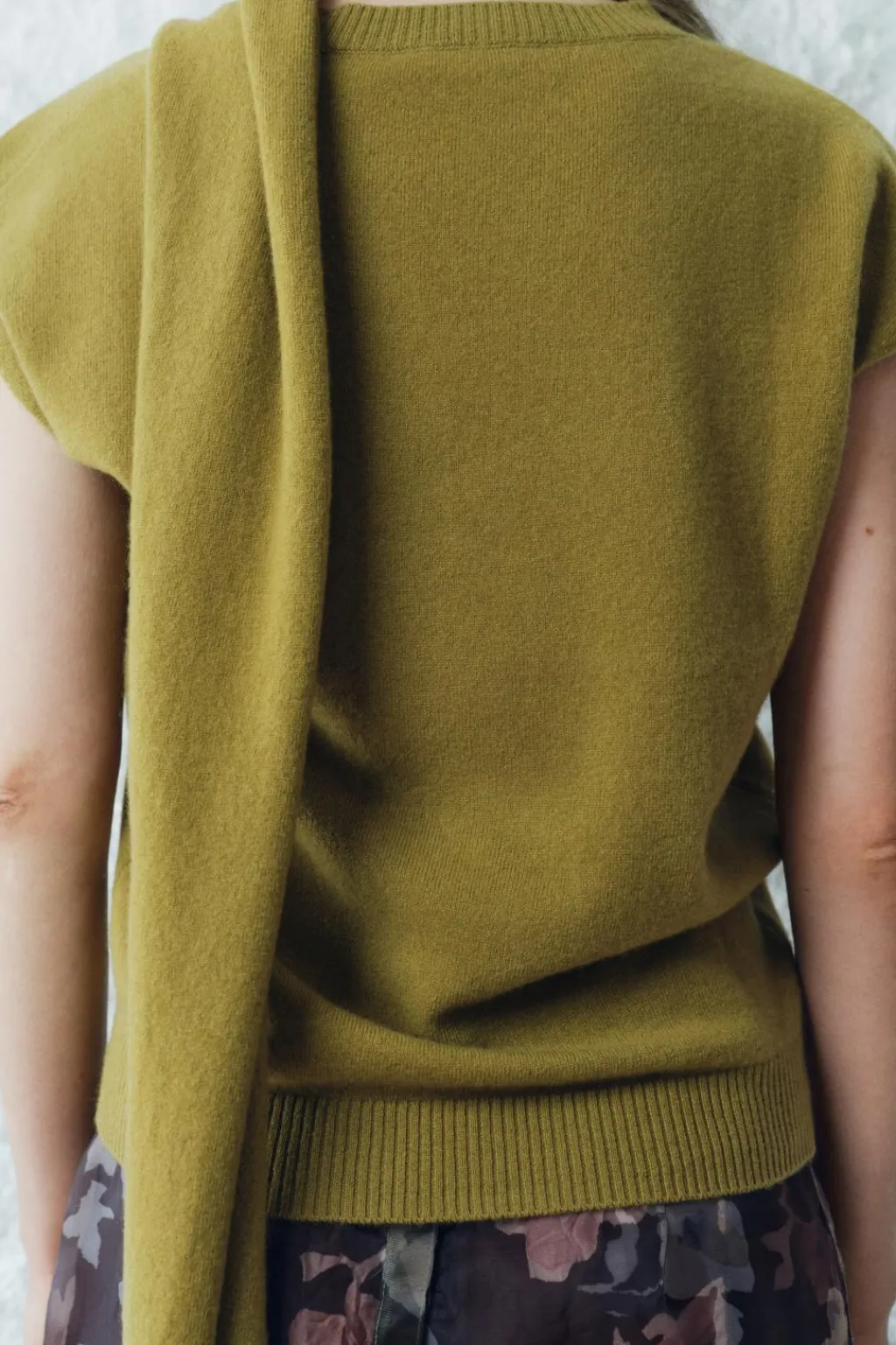 Top confeccionado en hilatura de lana 100%. Cuello redondo y manga sisa. Detalle de tejido tipo bufanda.
