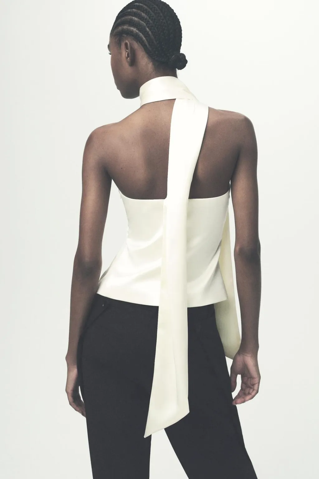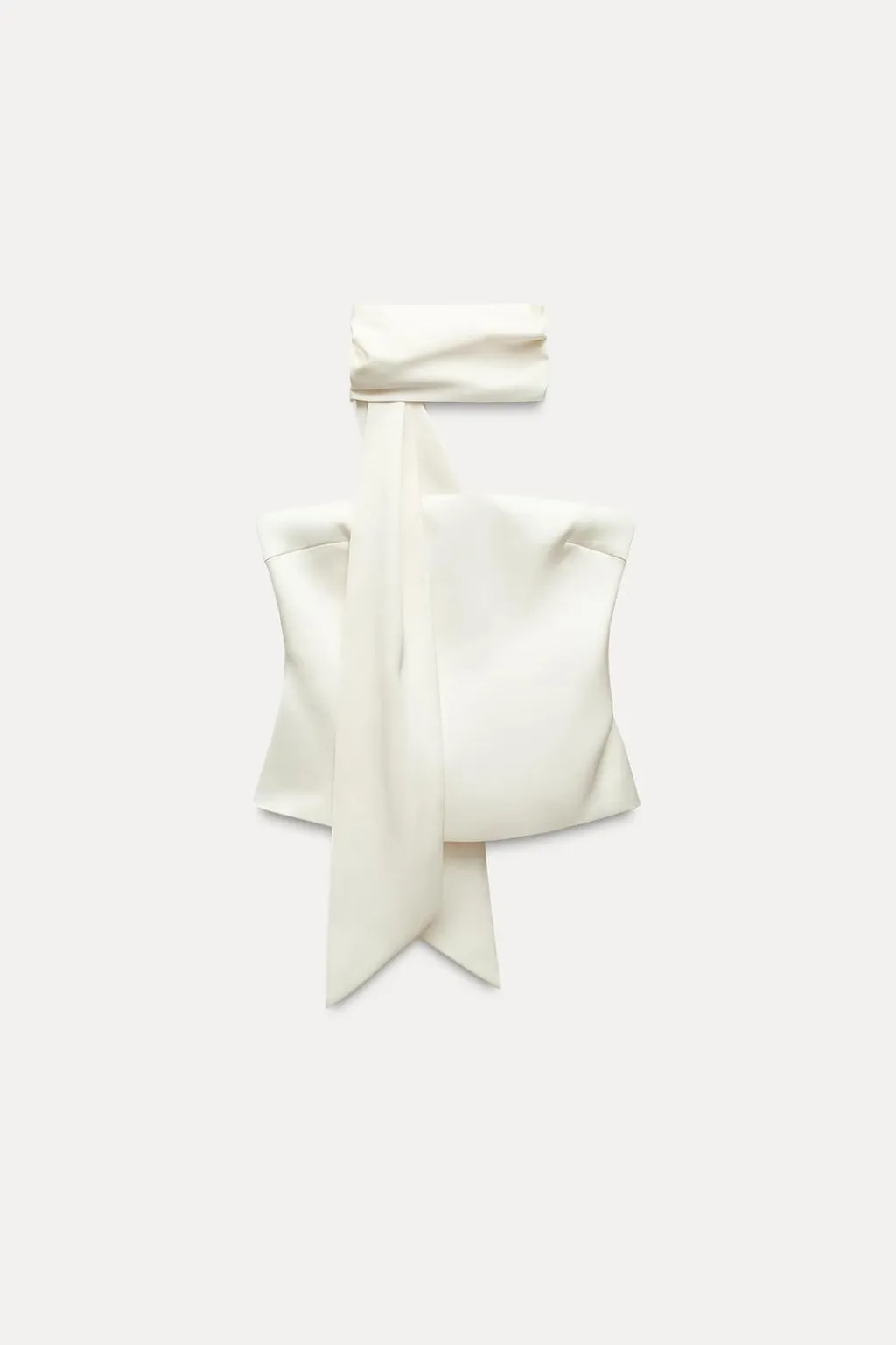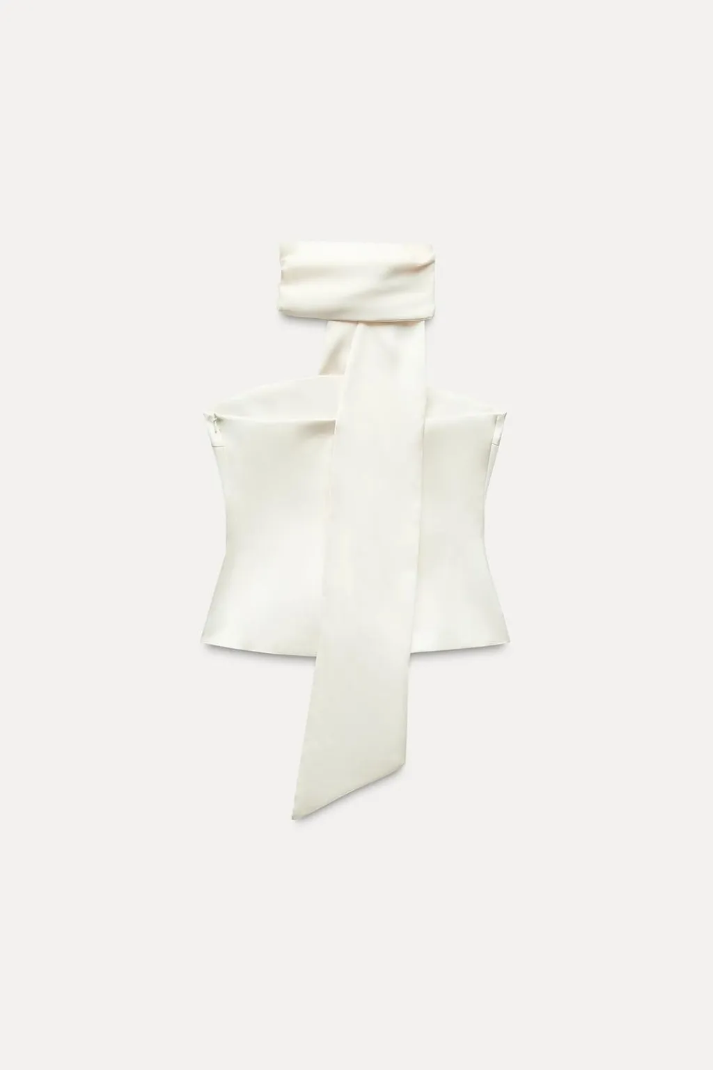 Top de escote recto y hombros descubiertos. Detalle tipo foulard en mismo tejido. Forro interior. Cierre lateral con cremallera oculta en costura.
