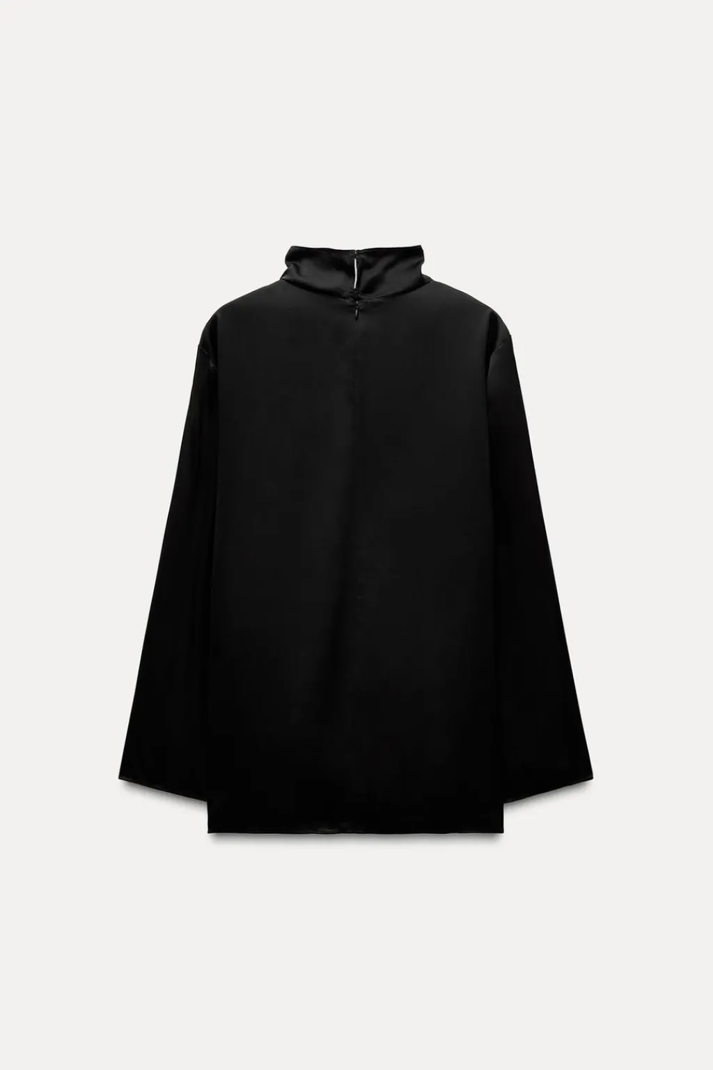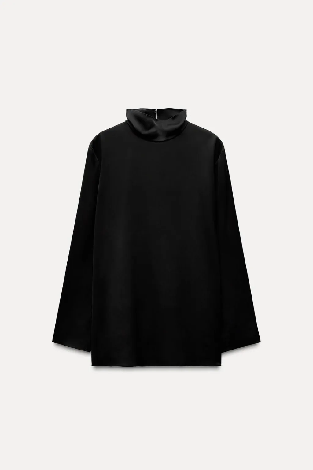 Top confeccionado en hilatura de viscosa. Cuello alto y manga larga. Bajo recto.