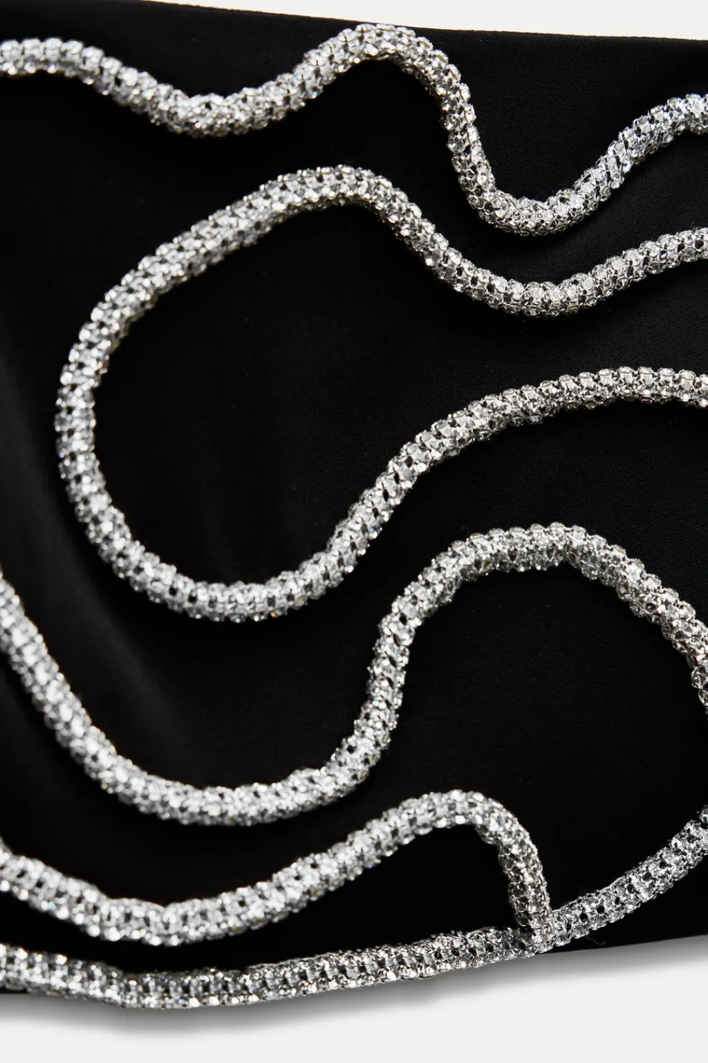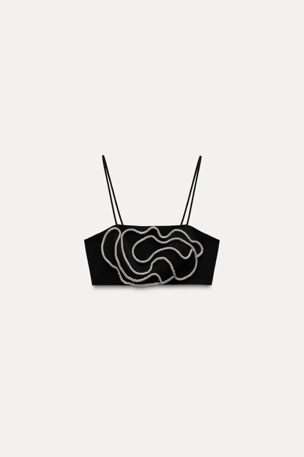 Top de escote recto y tirantes finos. Detalle aplicación de joyas en relieve combinadas a contraste. Cierre lateral con cremallera oculta en costura.