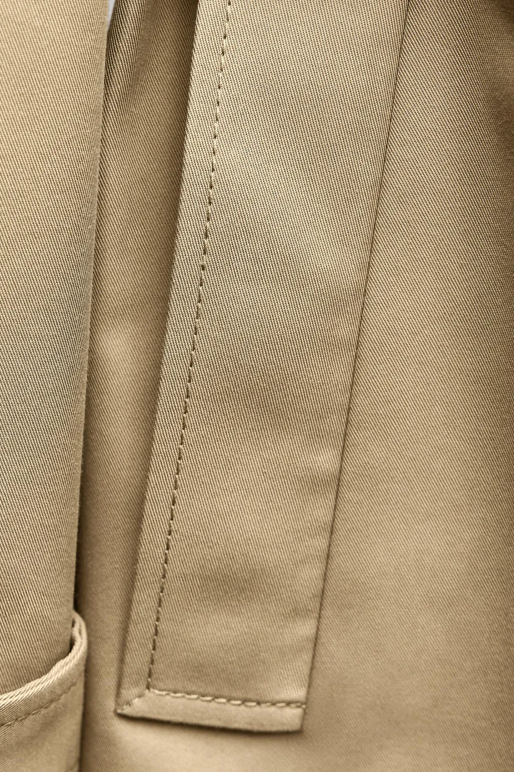 Trench de cuello solapa y manga larga acabada con trabilla y botón. Bolsillos delanteros de vivo. Bajo con abertura en espalda. Cierre frontal cruzado con botones y cinturón.