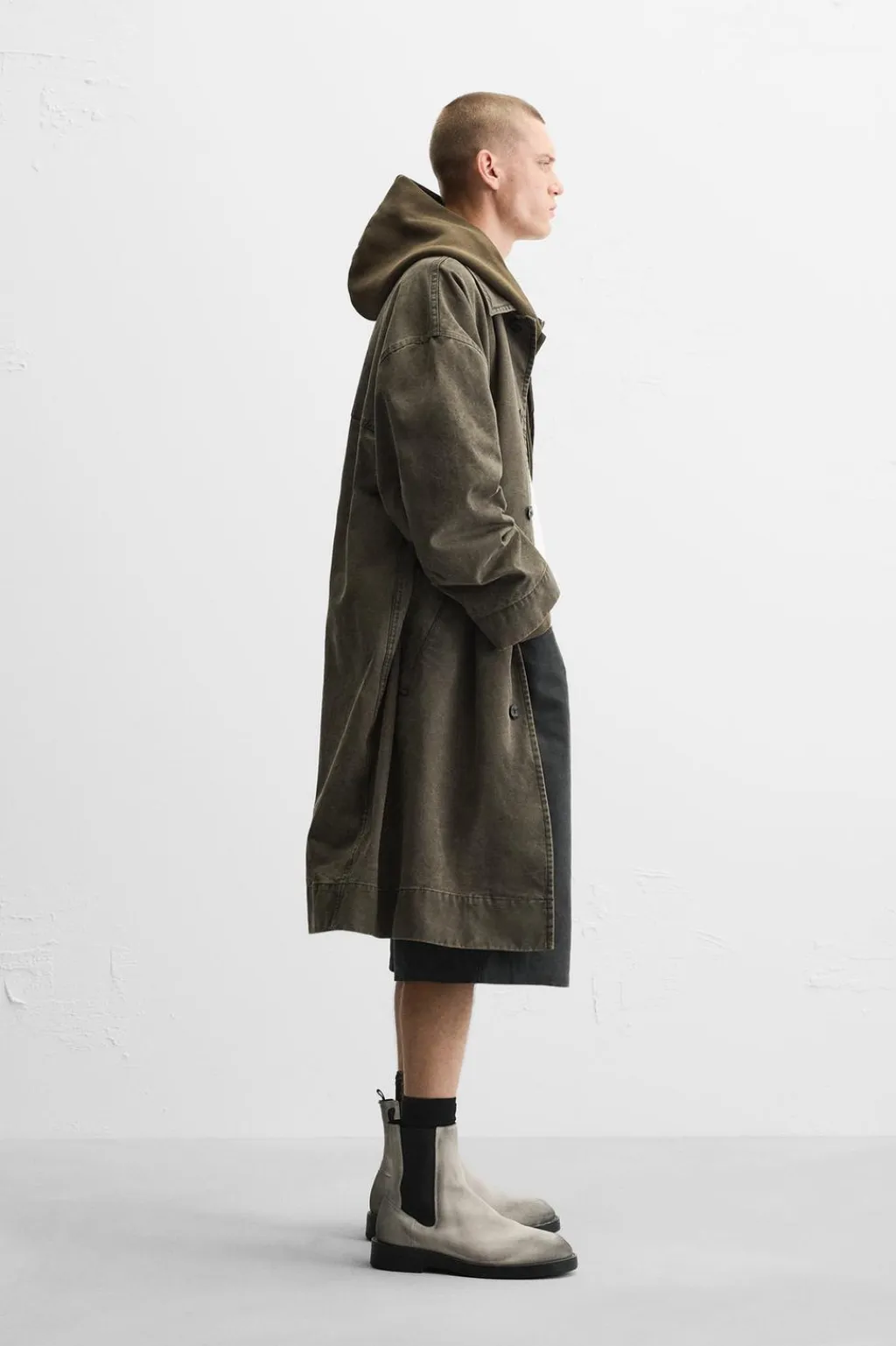 Trench oversize fit confeccionado en tejido de algodón. Cuello solapa y manga larga. Bolsillos de vivo en cadera. Efecto lavado. Cierre frontal con botonadura oculta por solapa.