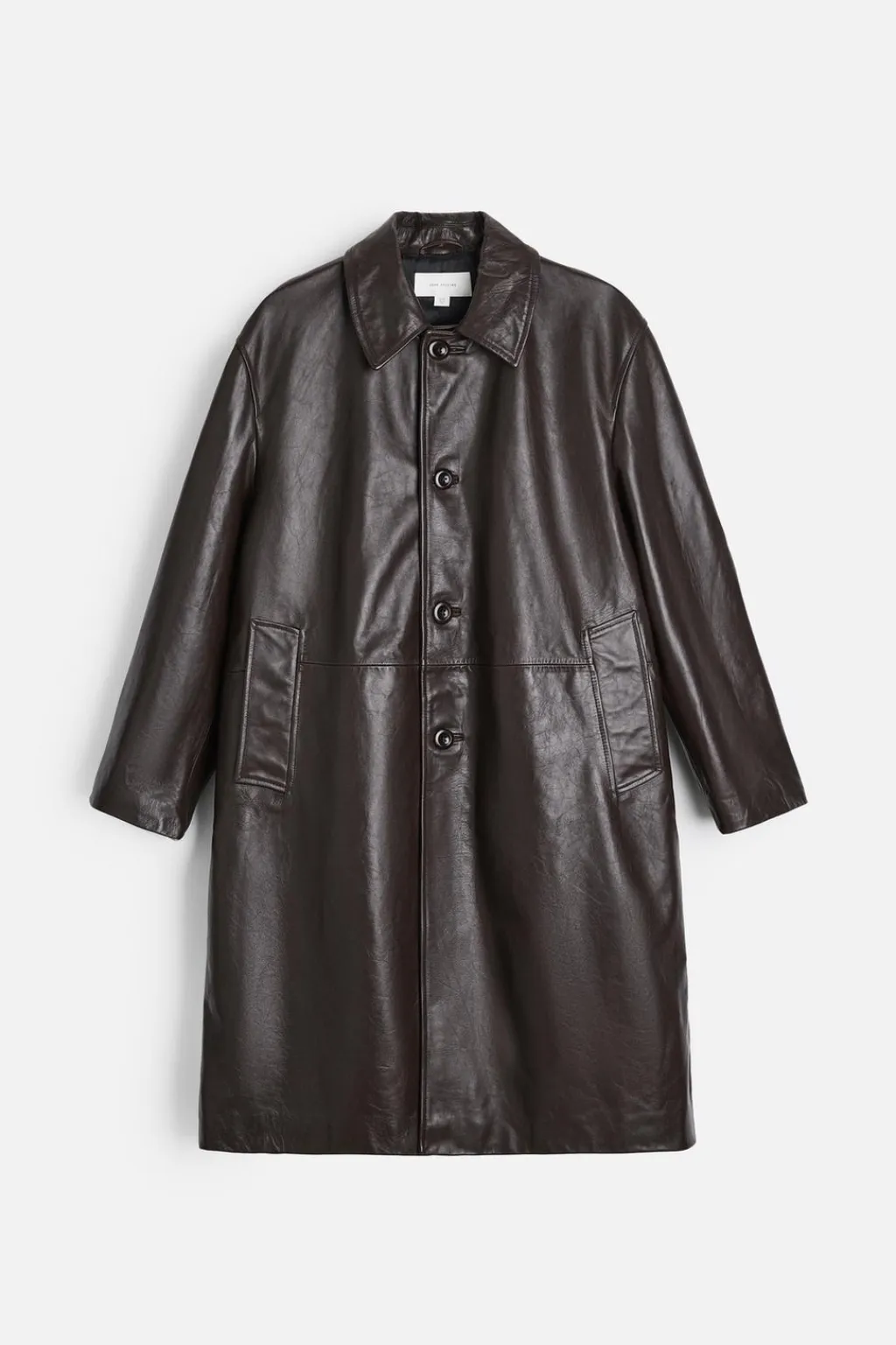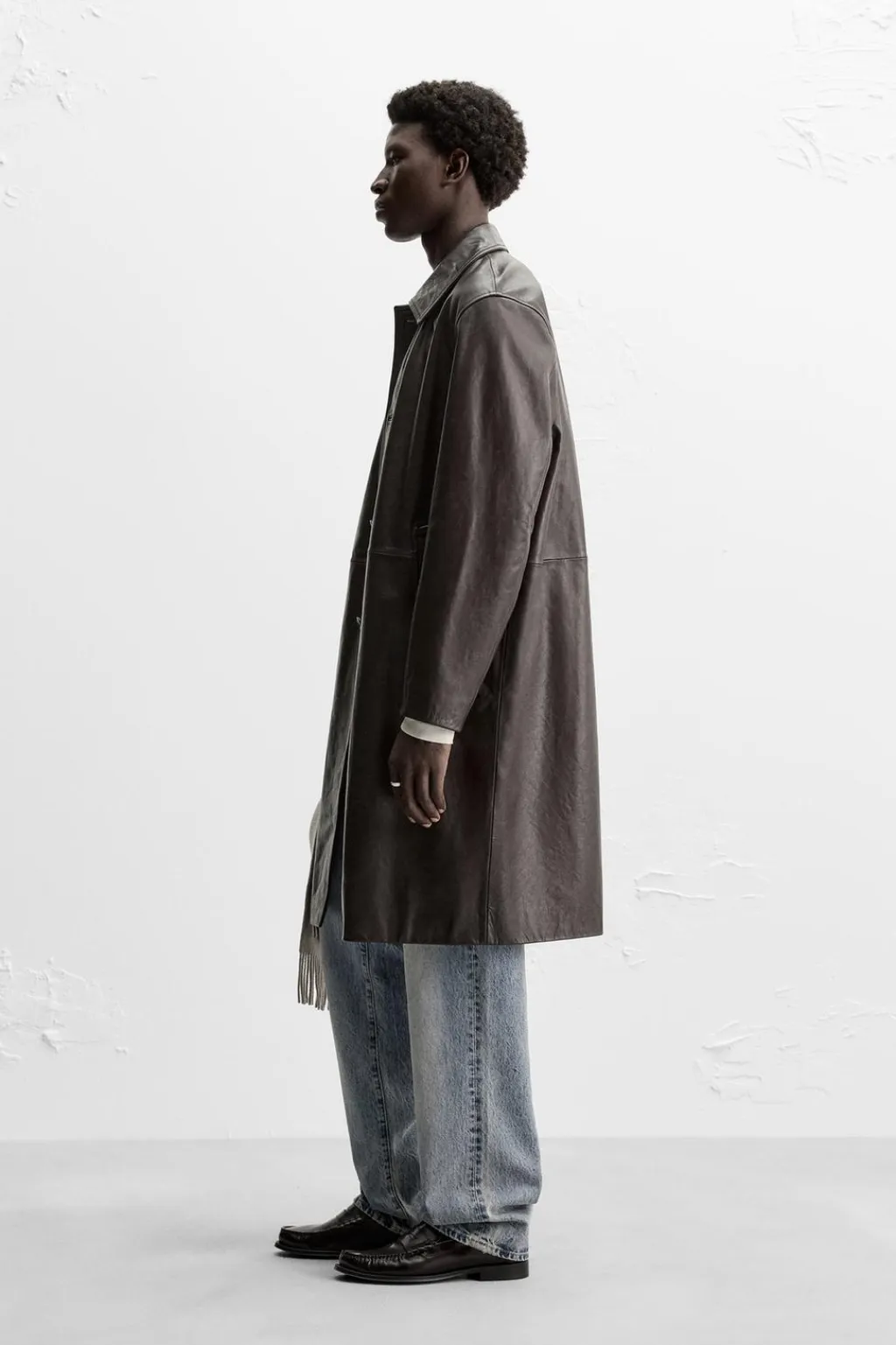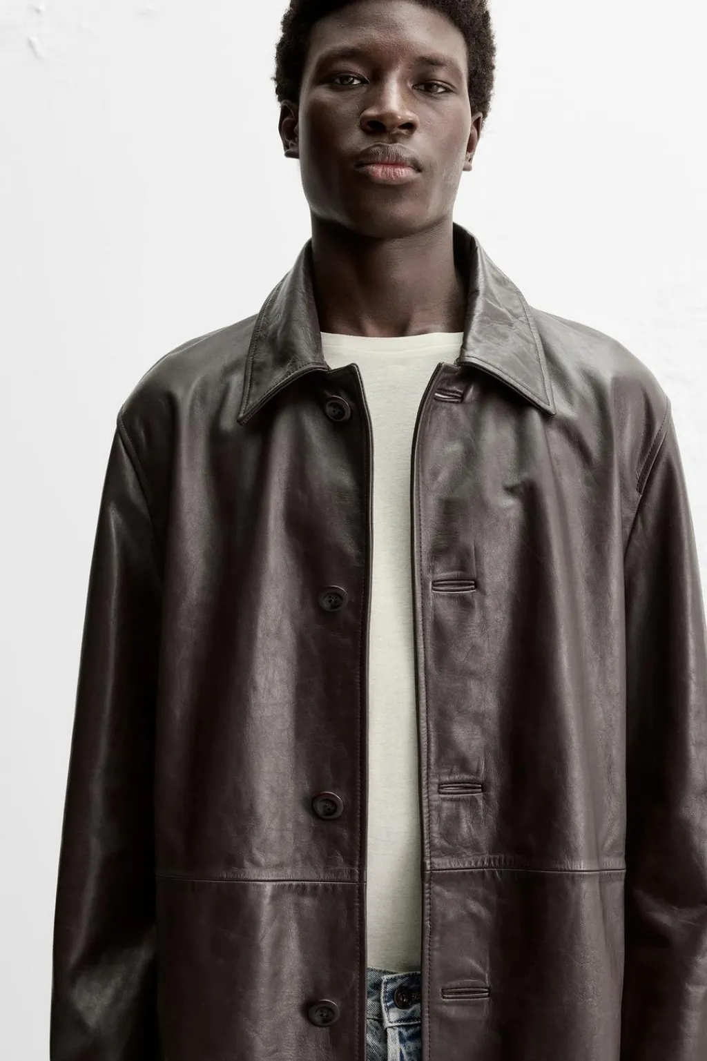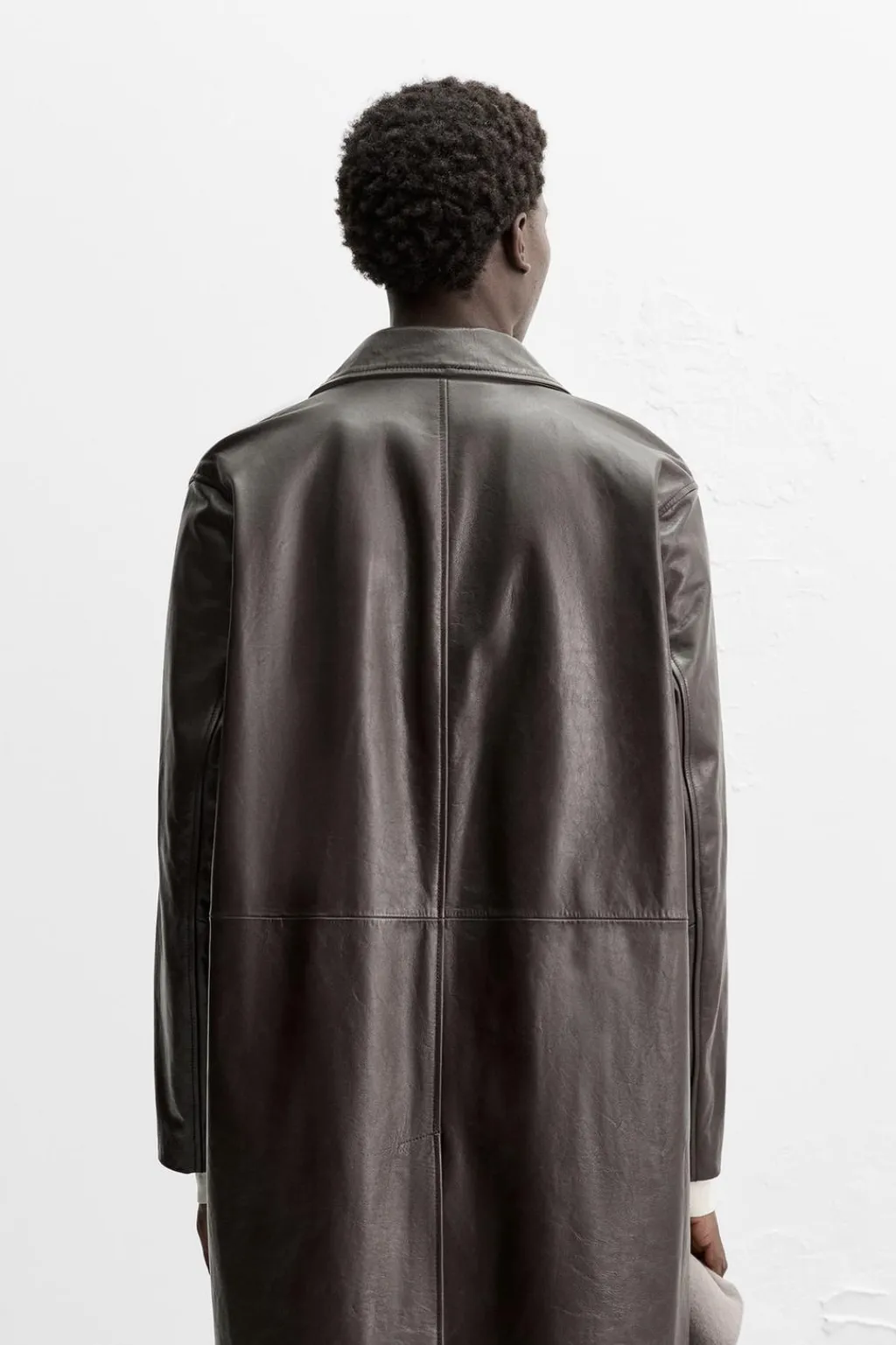 Trench relaxed fit confeccionado en piel. Cuello solapa y manga larga. Bolsillos de vivo en cadera. Detalle de bolsillo interior. Bajo con abertura central en espalda. Cierre frontal de botonadura.