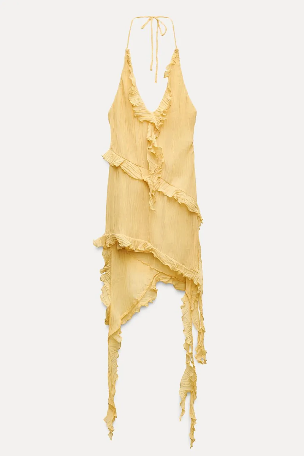 Vestido de cuello halter y escote pico con lazada. Forro interior combinado a tono. Detalle de flecos con volantes. Bajo acabado asimétrico.