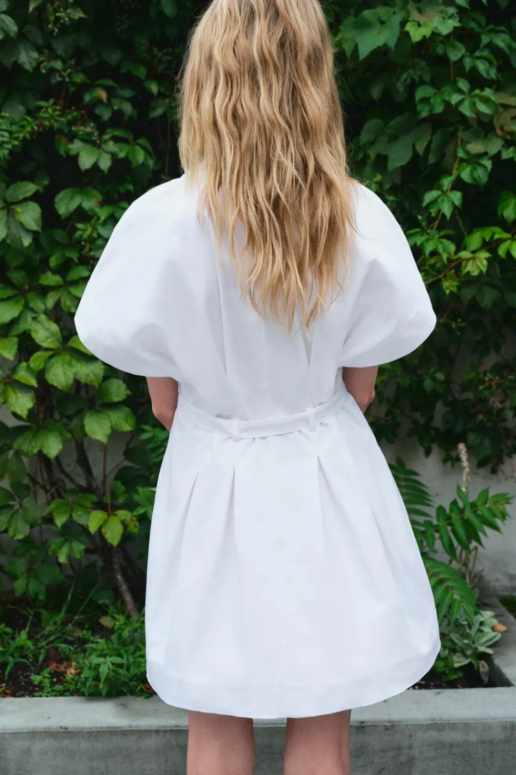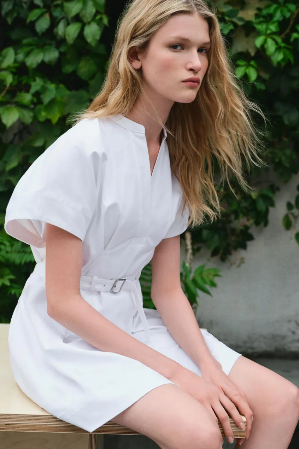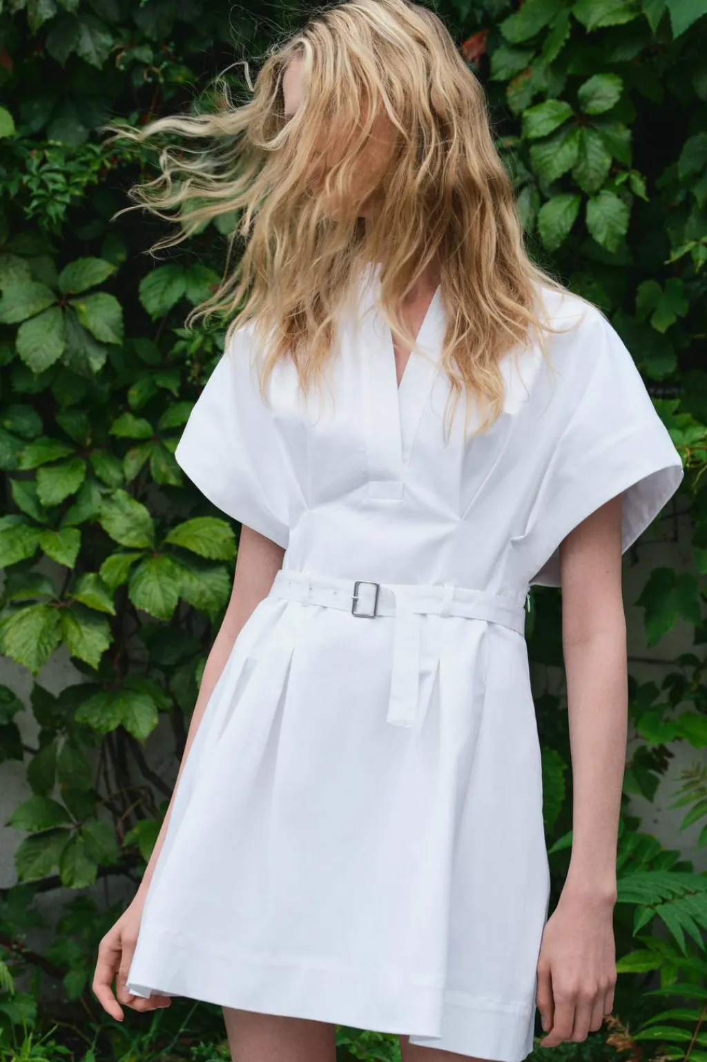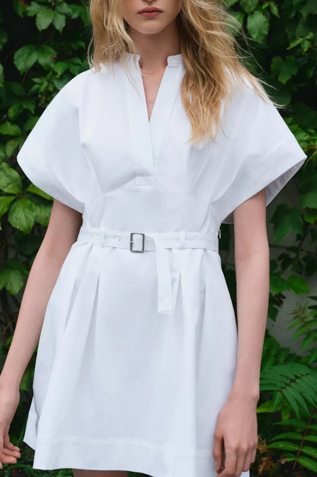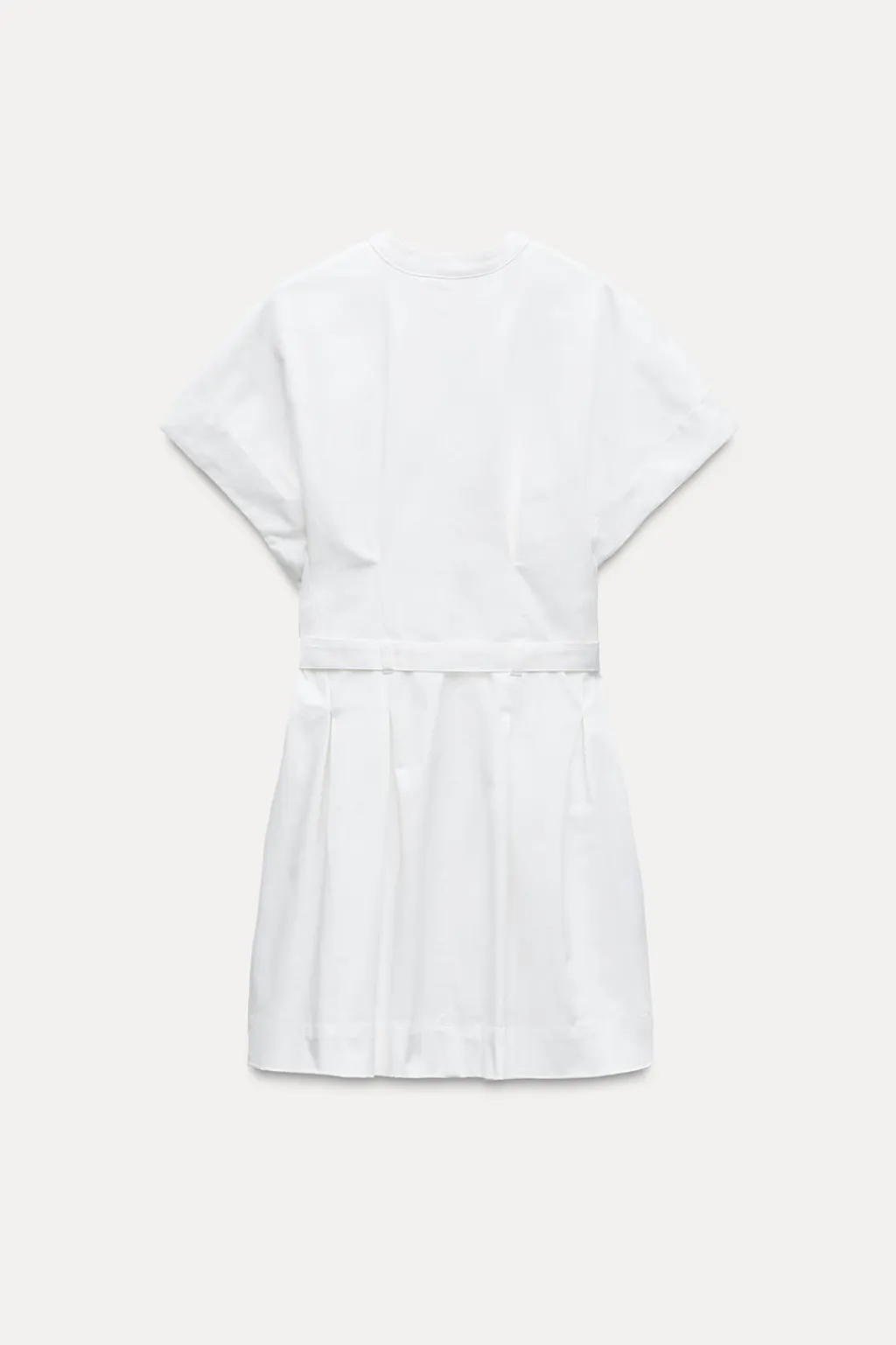 Vestido corto confeccionado en hilatura con mezcla de algodón. Cuello redondo y escote pico con manga corta. Cinturón en mismo tejido ajustable con hebilla metálica. Detalle de pliegues en delantero. Cierre lateral con cremallera oculta en costura.