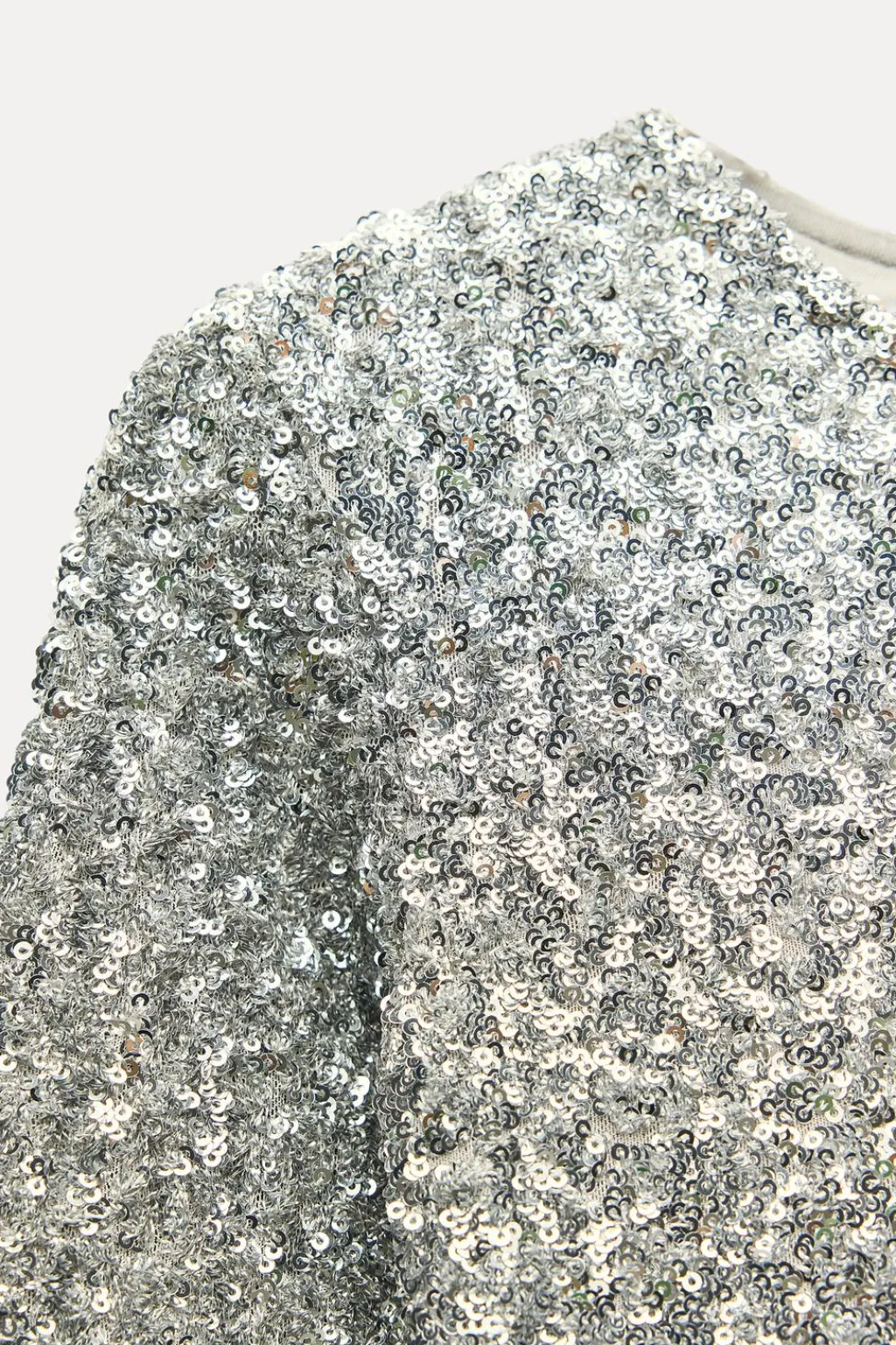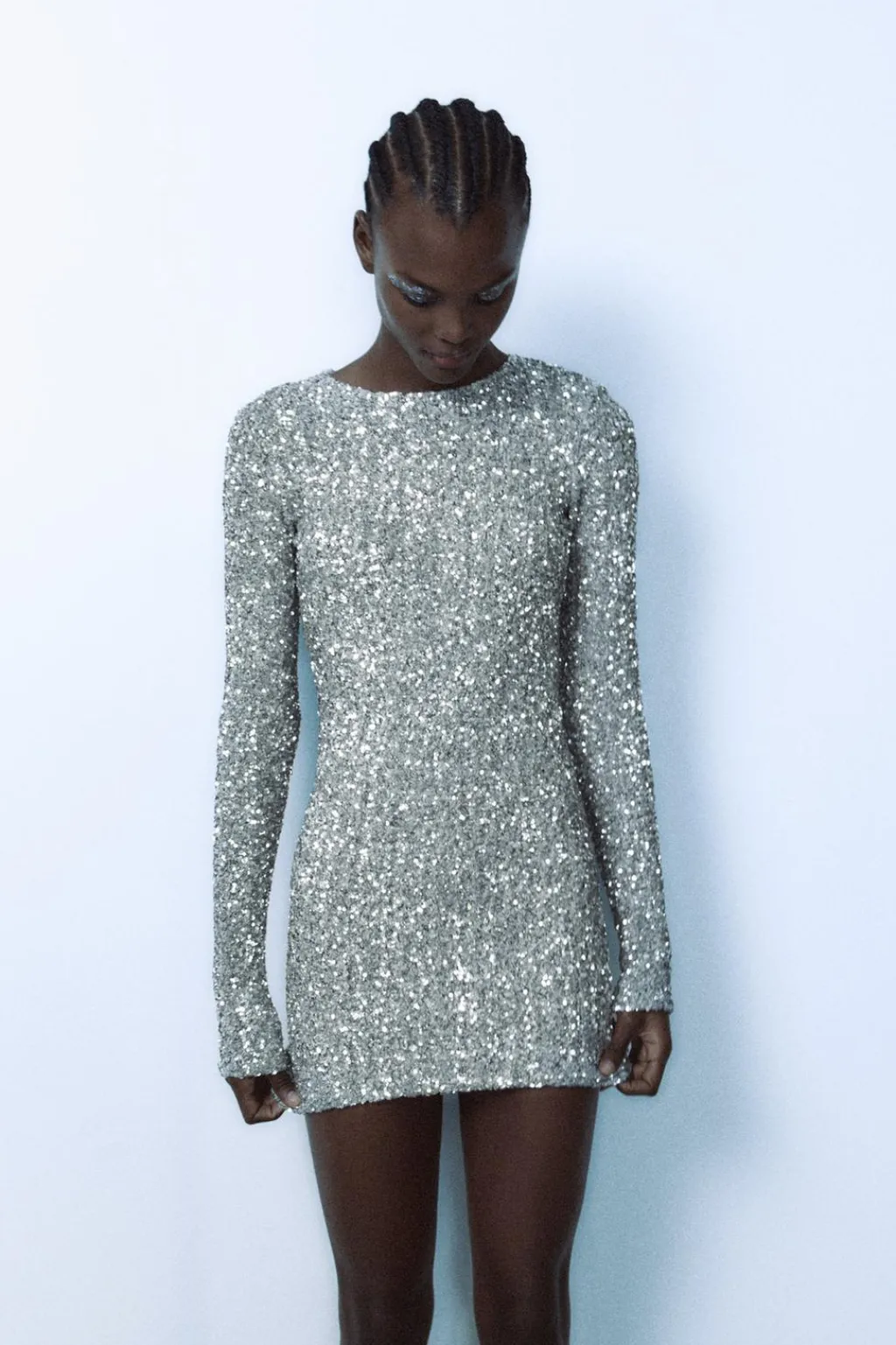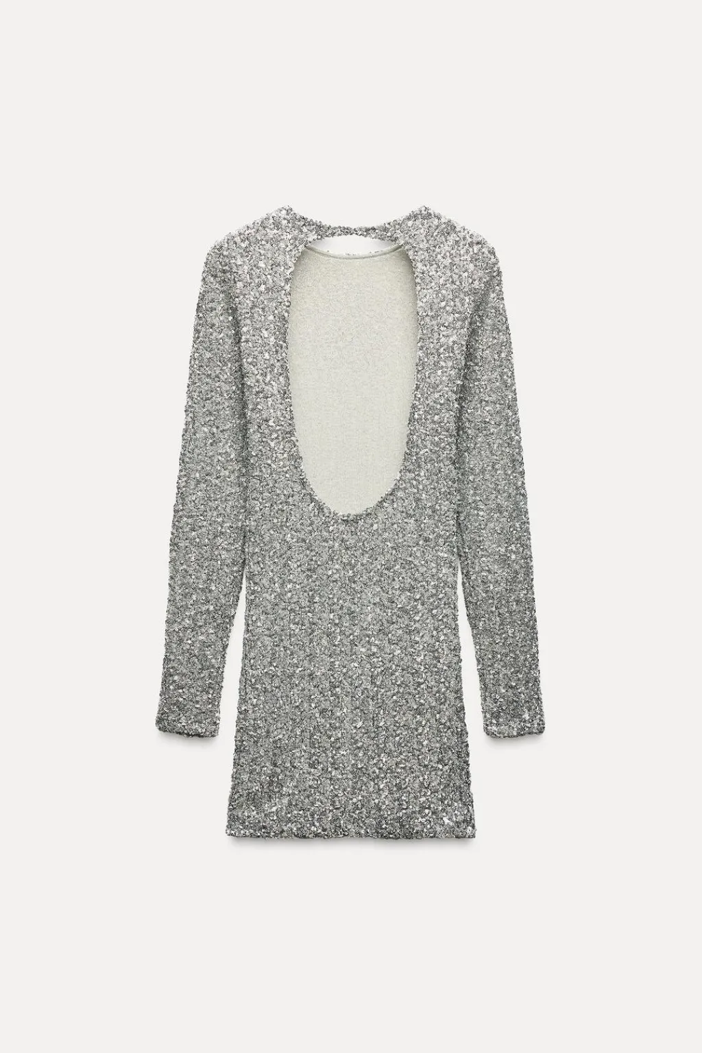 Vestido corto de cuello redondo y manga larga. Detalle de abertura en espalda. Forro interior. Detalle aplicación lentejuelas. Cierre en espalda con botón.