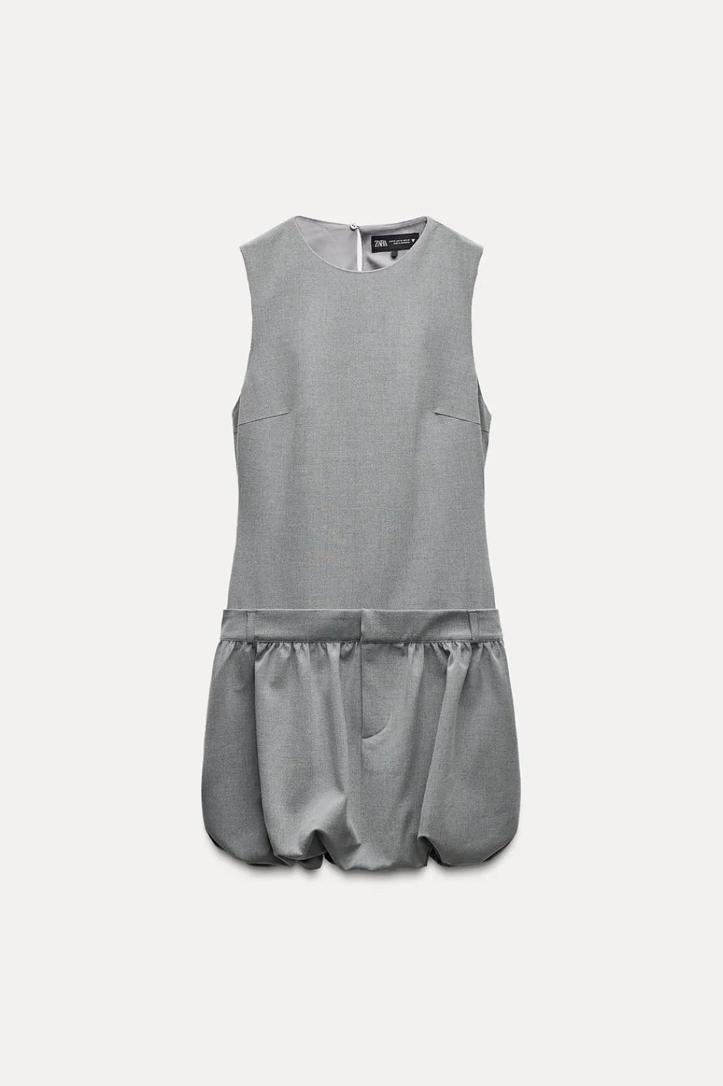 Vestido corto de cuello redondo y manga sisa. Bolsillos laterales ocultos en costura. Bajo acabado abullonado. Forro interior combinado. Cierre lateral con cremallera oculta en costura.