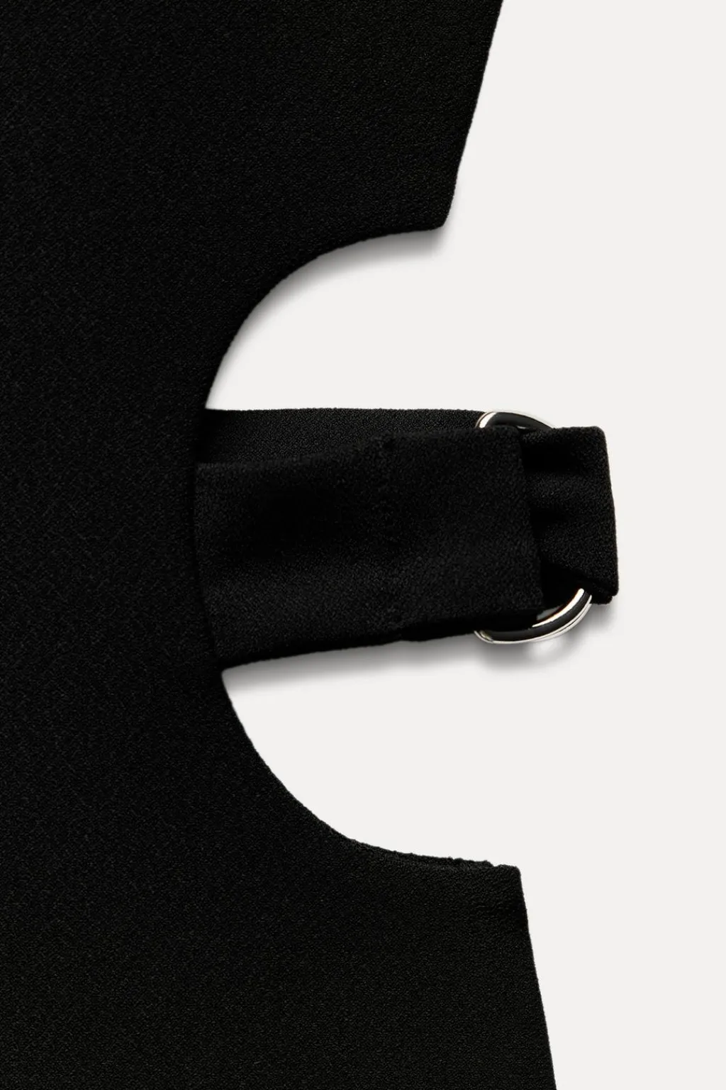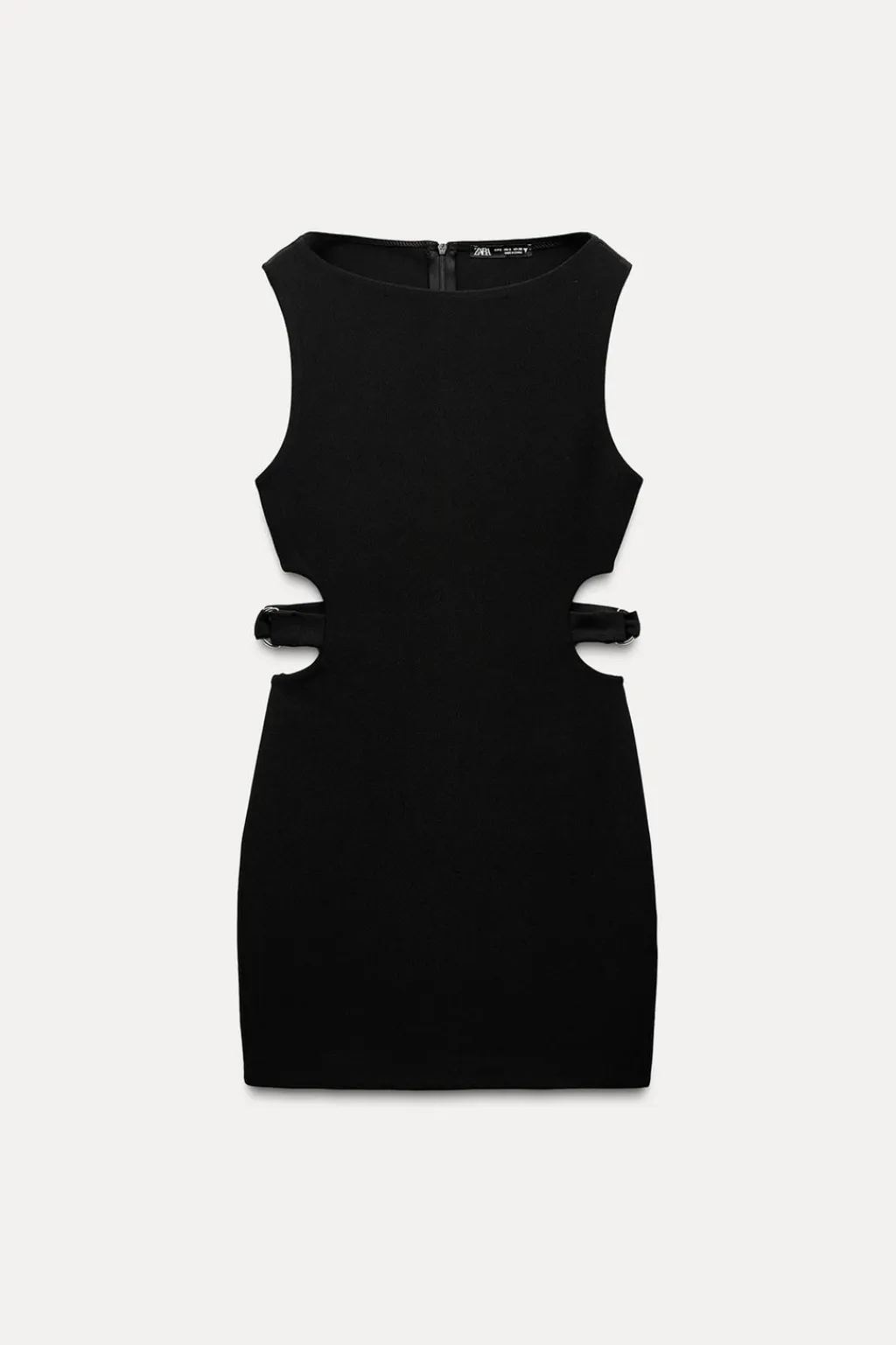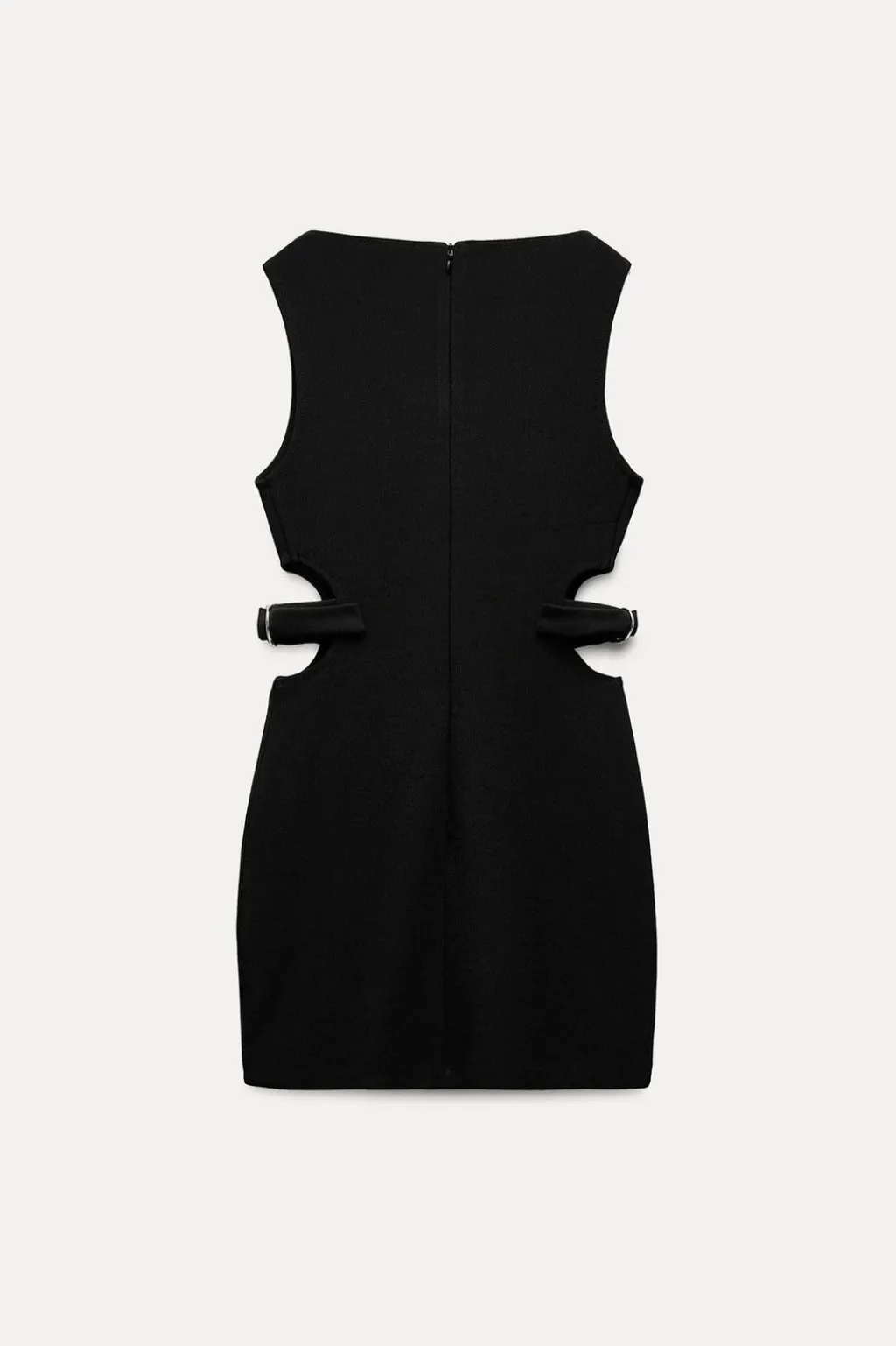 Vestido corto de cuello redondo y manga sisa. Detalle de aberturas con trabillas y hebillas metálicas en cintura. Cierre en espalda con cremallera oculta en costura.