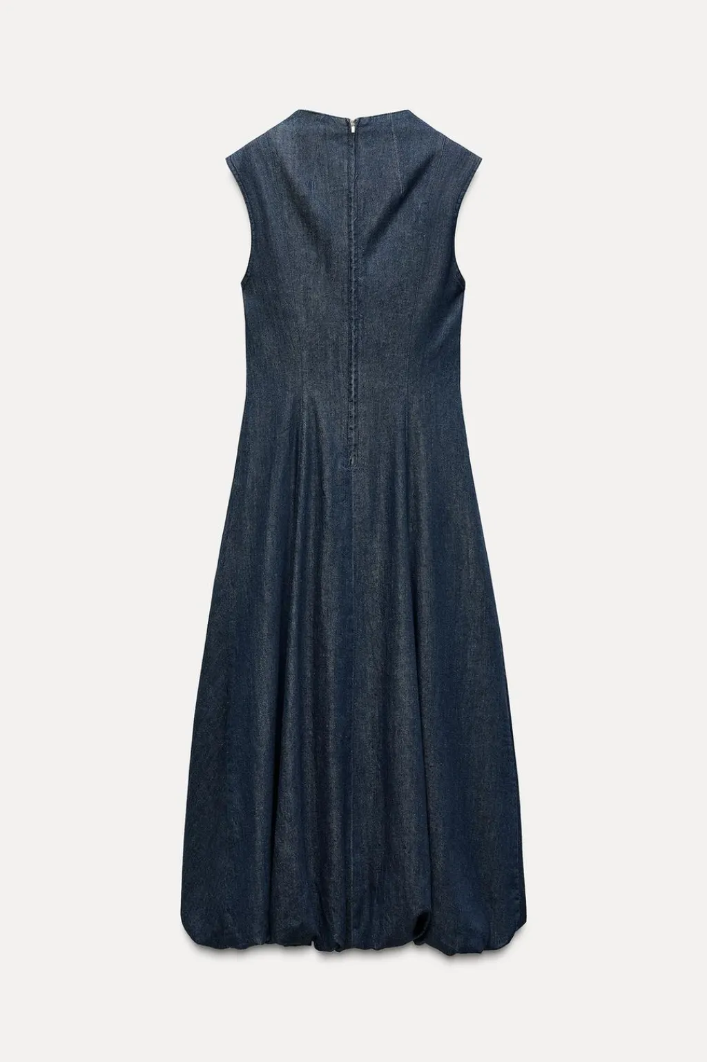 Vestido midi de cuello subido y manga sisa. Bajo acabado globo con elástico interior. Cierre en espalda con cremallera.