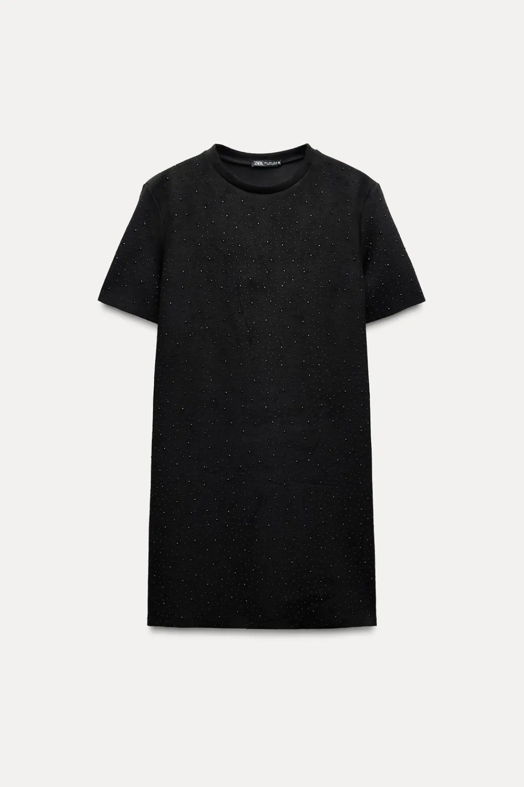 Vestido corto de cuello redondo y manga corta. Detalle de aplicación de brillos.