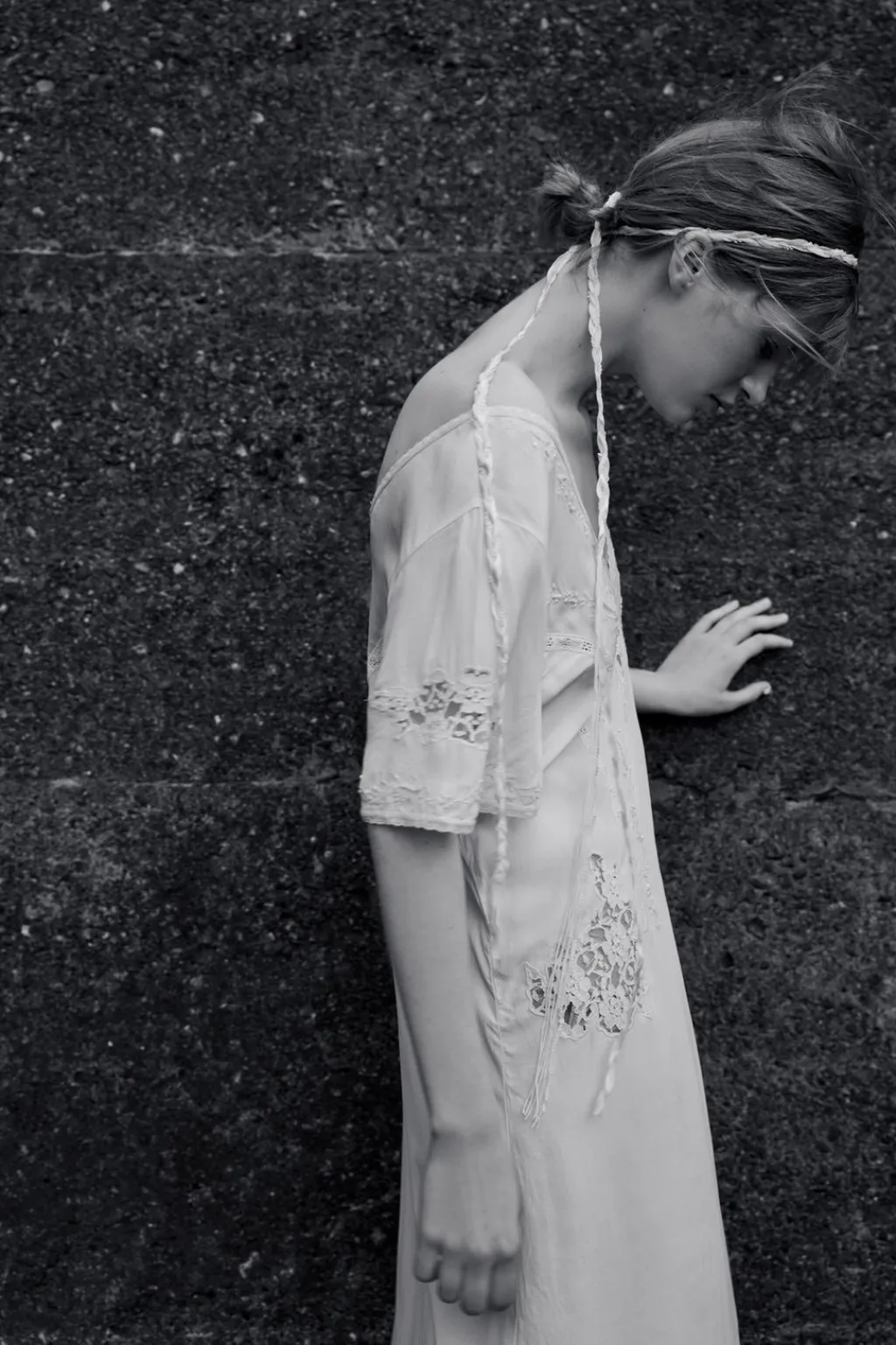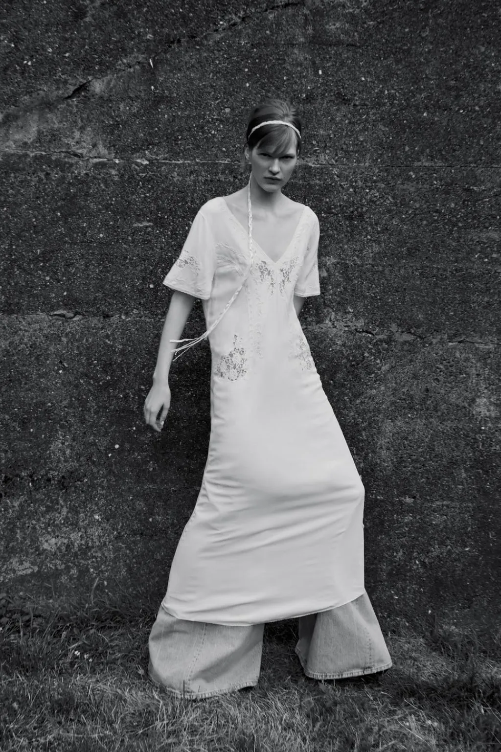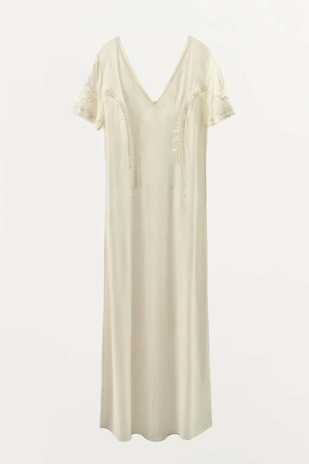 Vestido largo confeccionado en hilatura de viscosa 100%. Escote pico y manga corta. Detalle de bordados a tono.