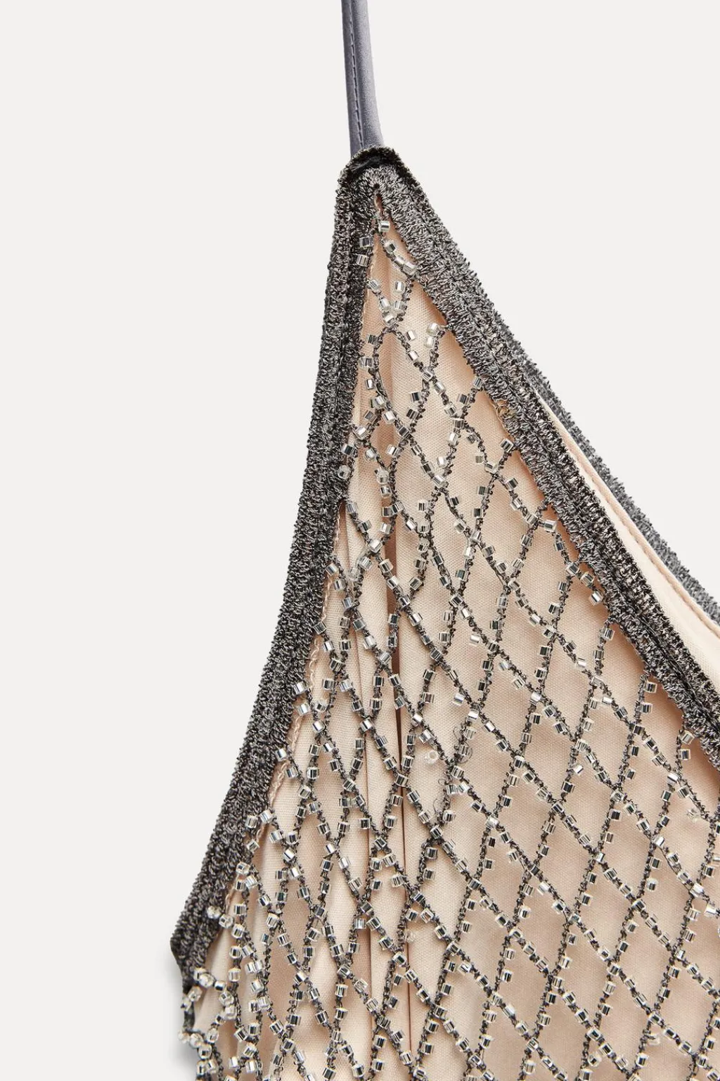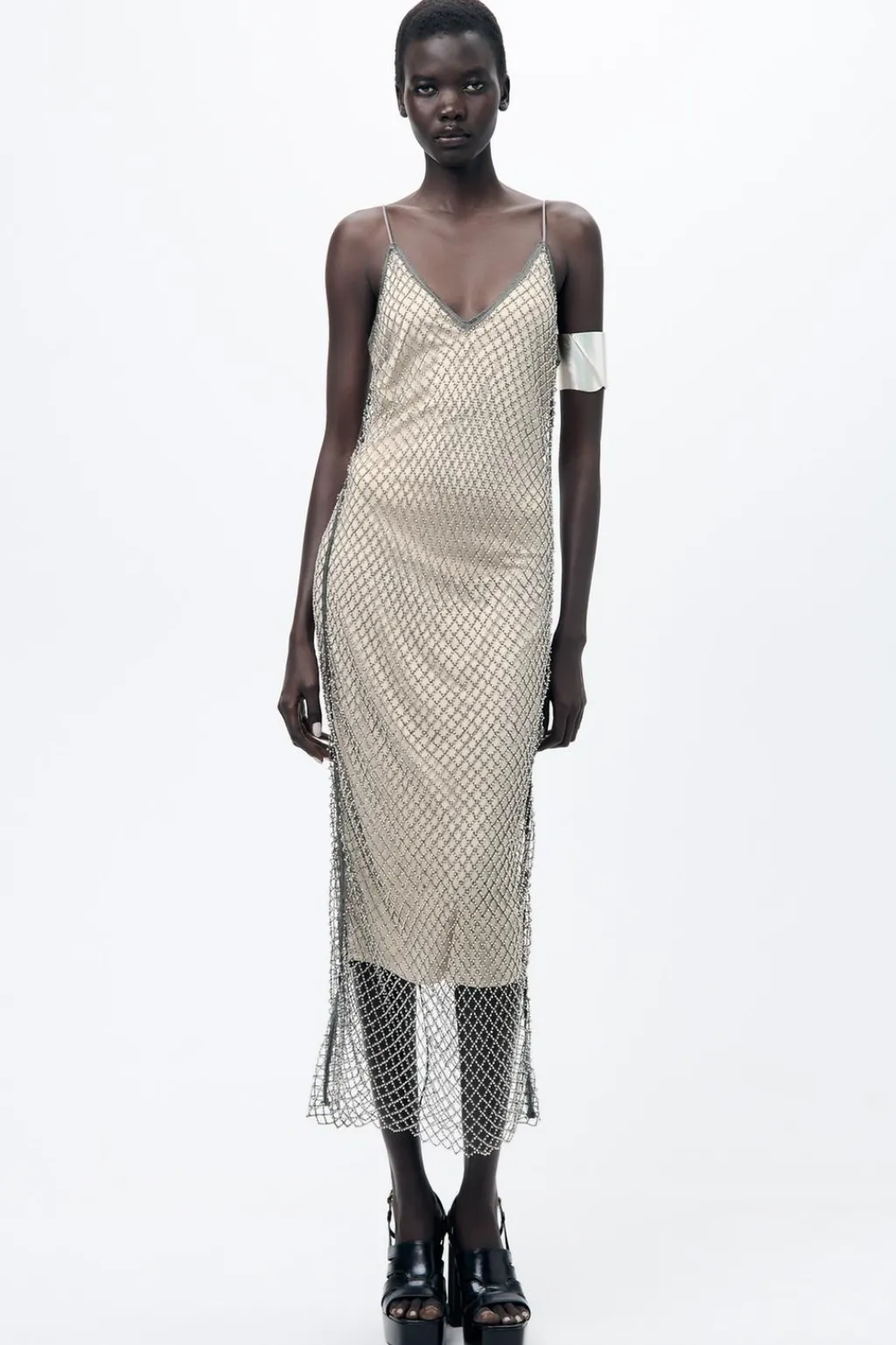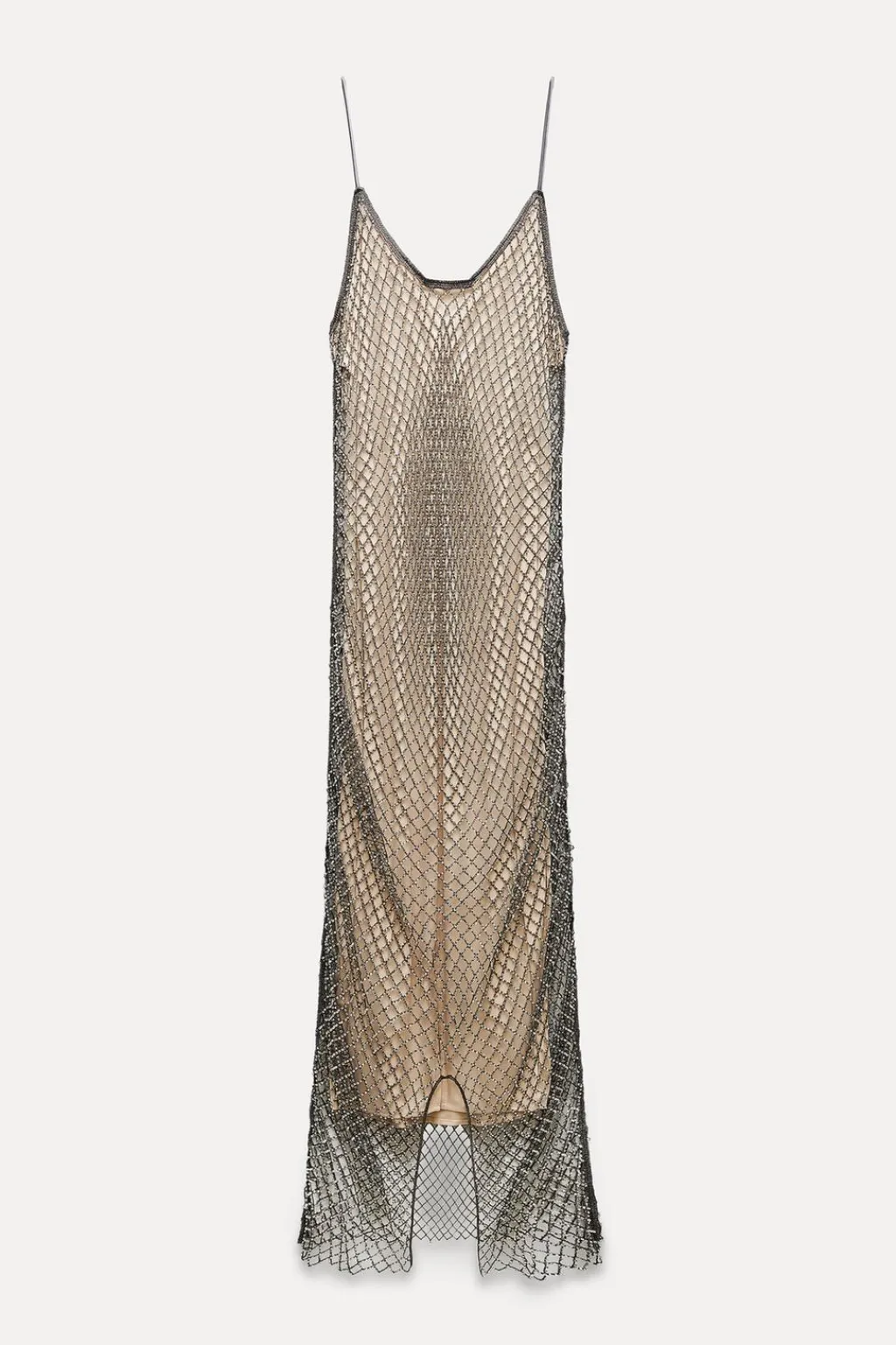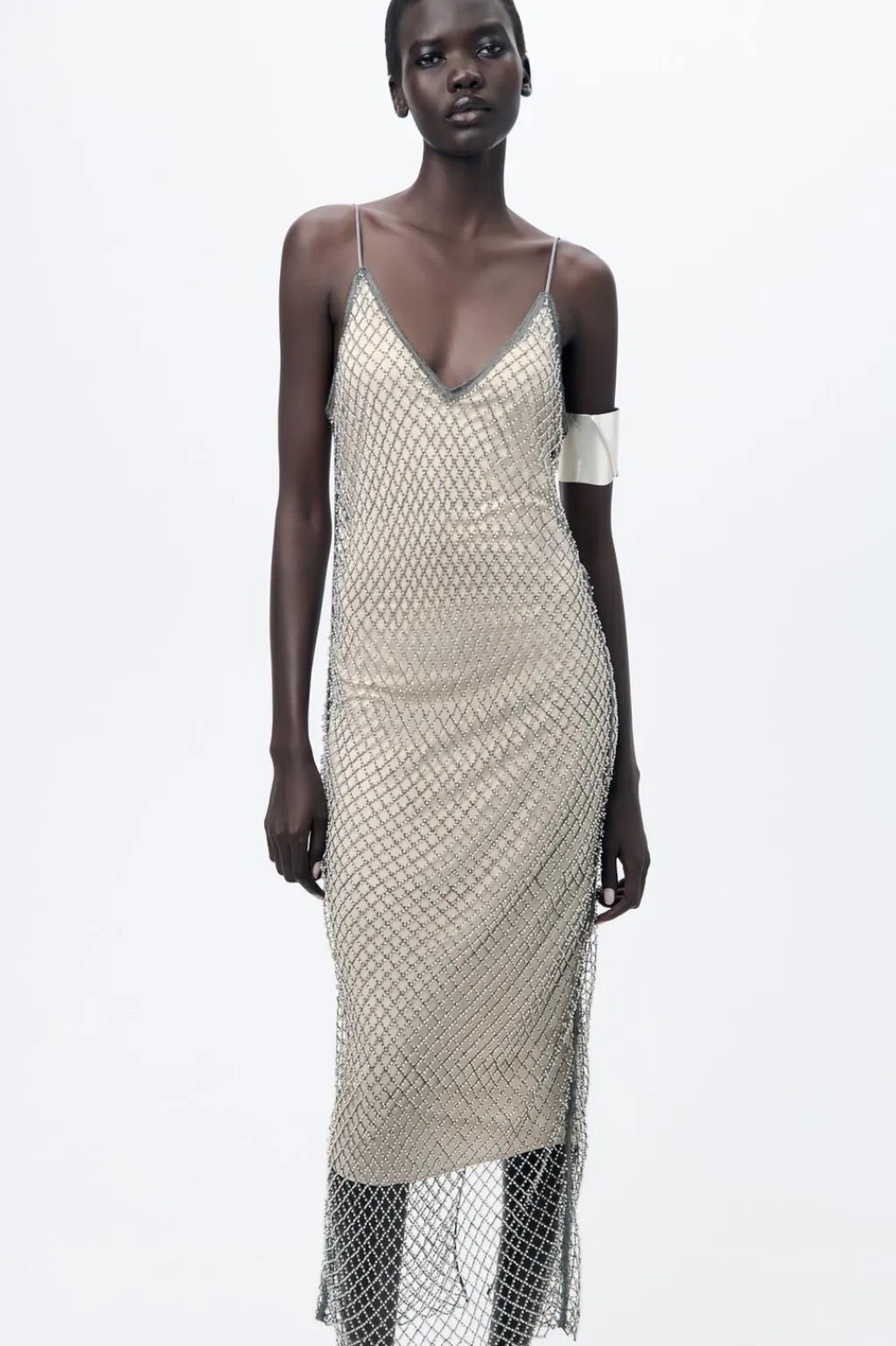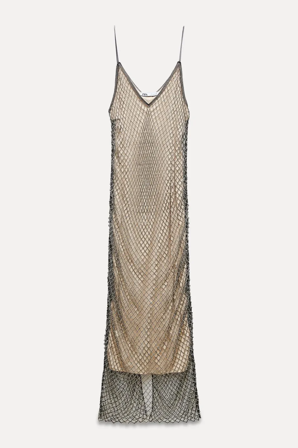 Vestido de escote pico y tirantes finos. Detalle de abalorios joya. Forro interior.