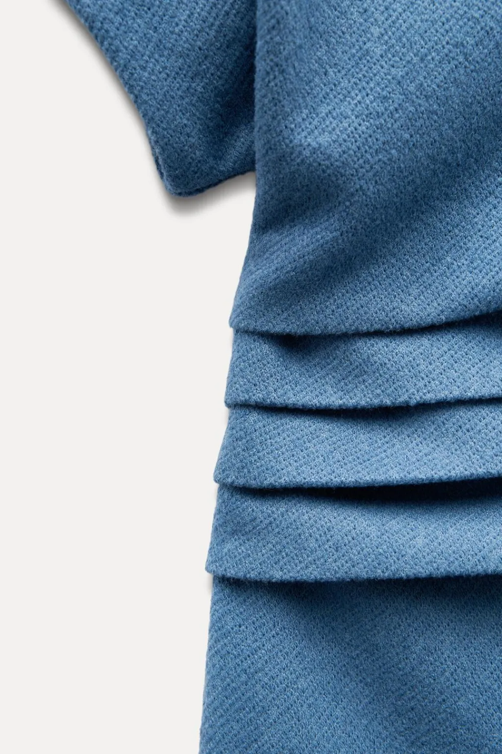 Vestido midi confeccionado en hilatura con lana 10%.Cuello redondo ymanga corta. Detalle de drapeado frontal. Bajo acabado con abertura en espalda.