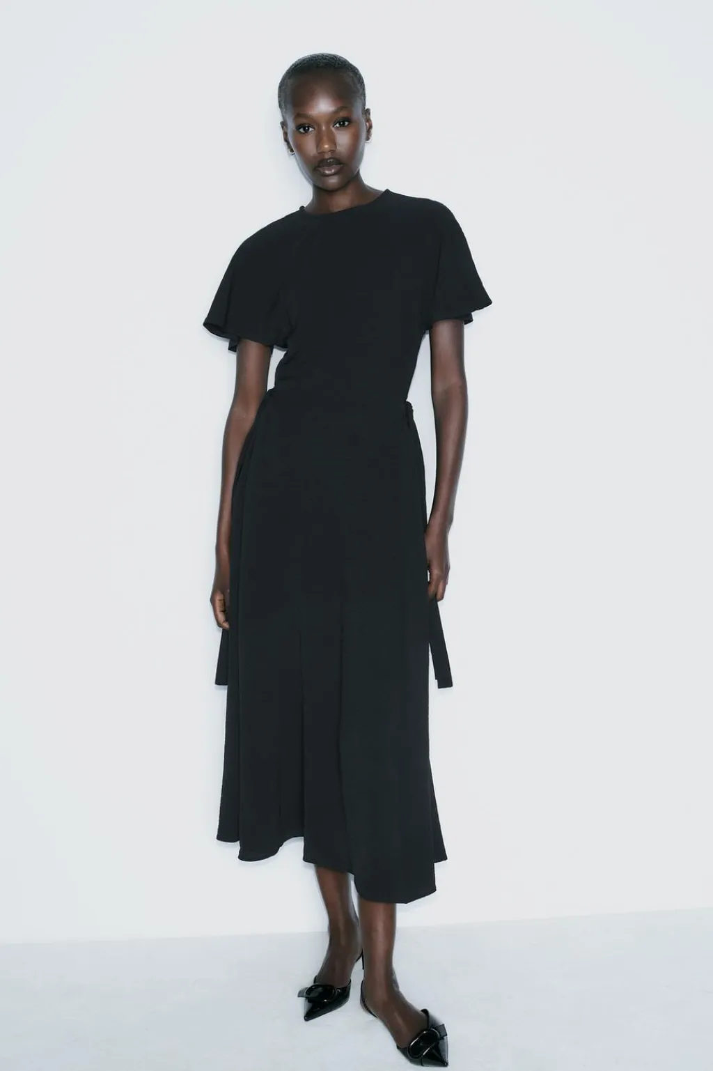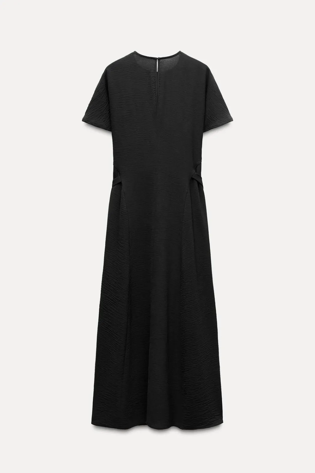 Vestido midi de cuello redondo y manga corta. Detalle de cintas laterales en mismo tejido. Cierre en espalda con abertura y botón.