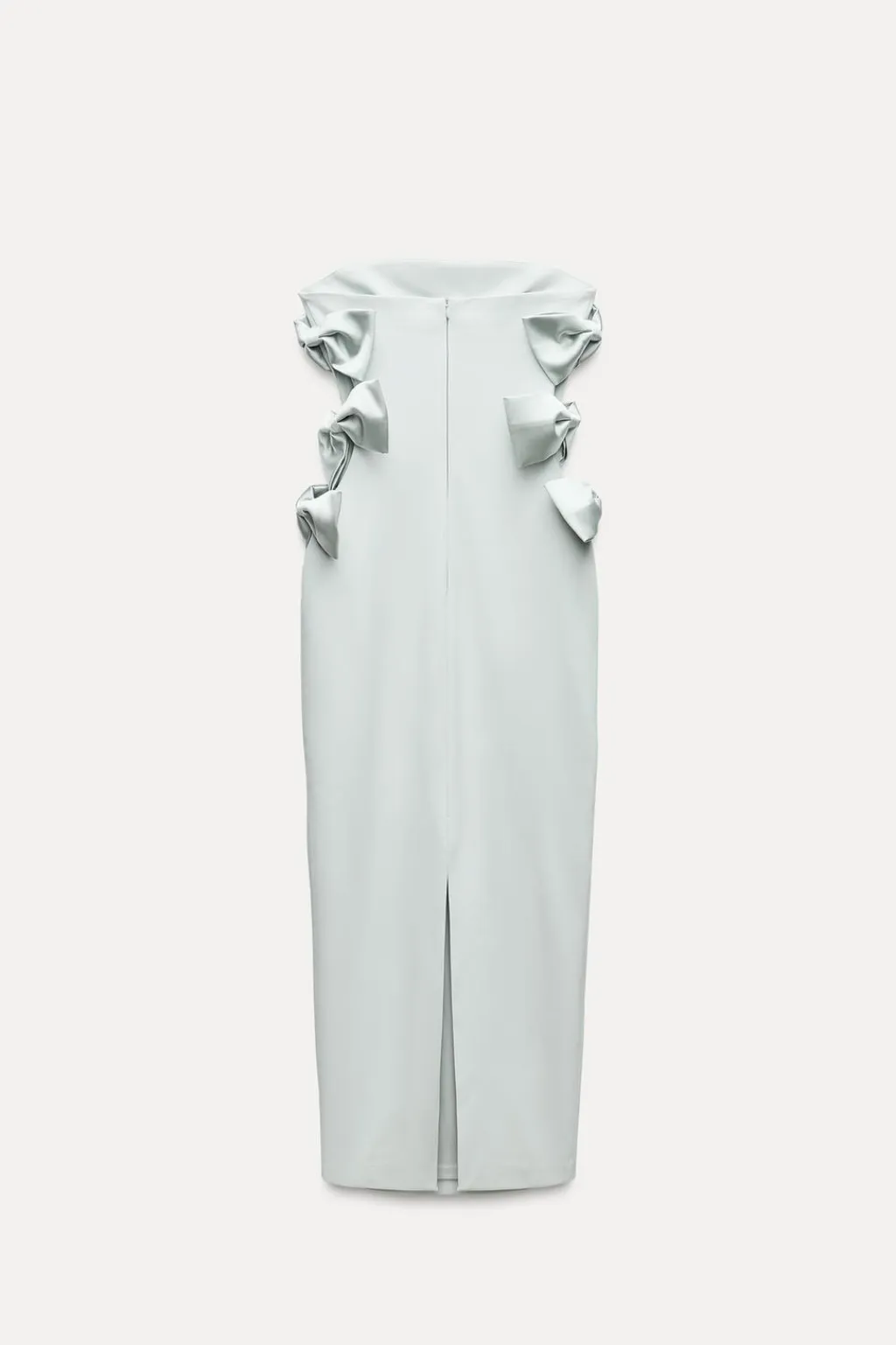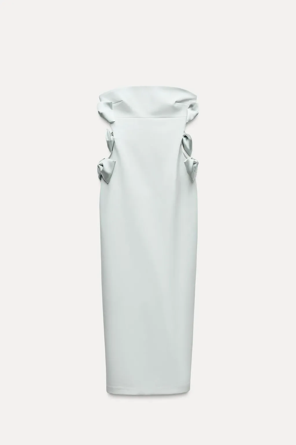 Vestido midi entallado de escote recto y hombros descubiertos. Detalle de lazos satinados en laterales. Bajo con abertura en espalda. Forro interior combinado. Cierre con cremallera oculta en espalda.