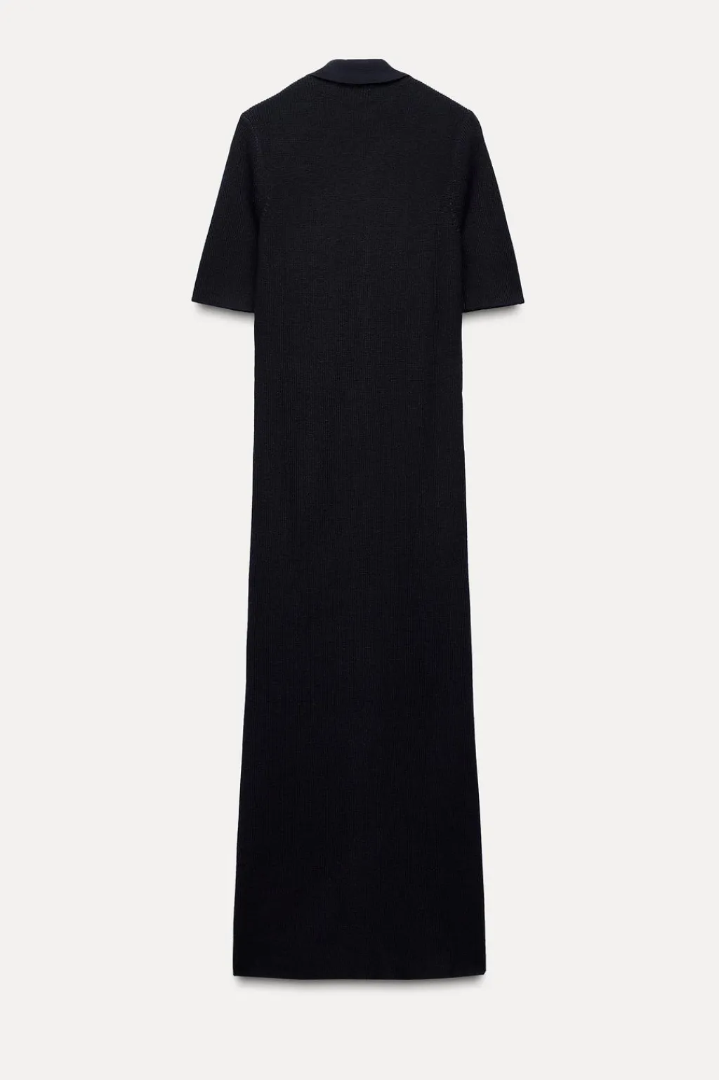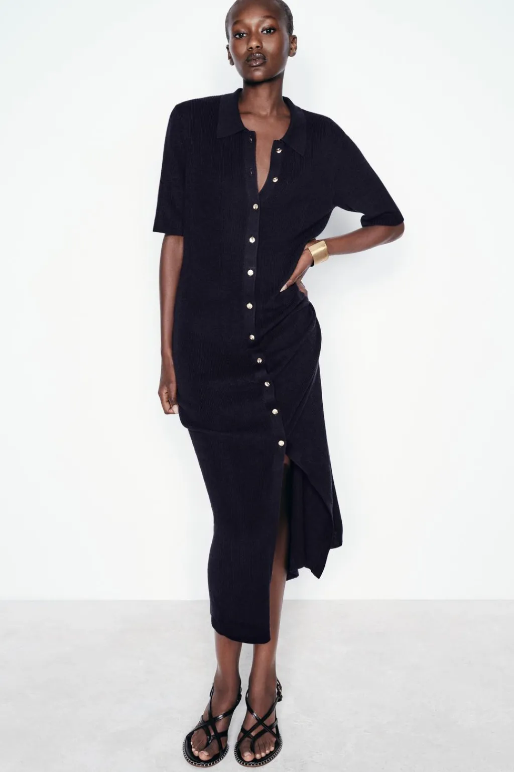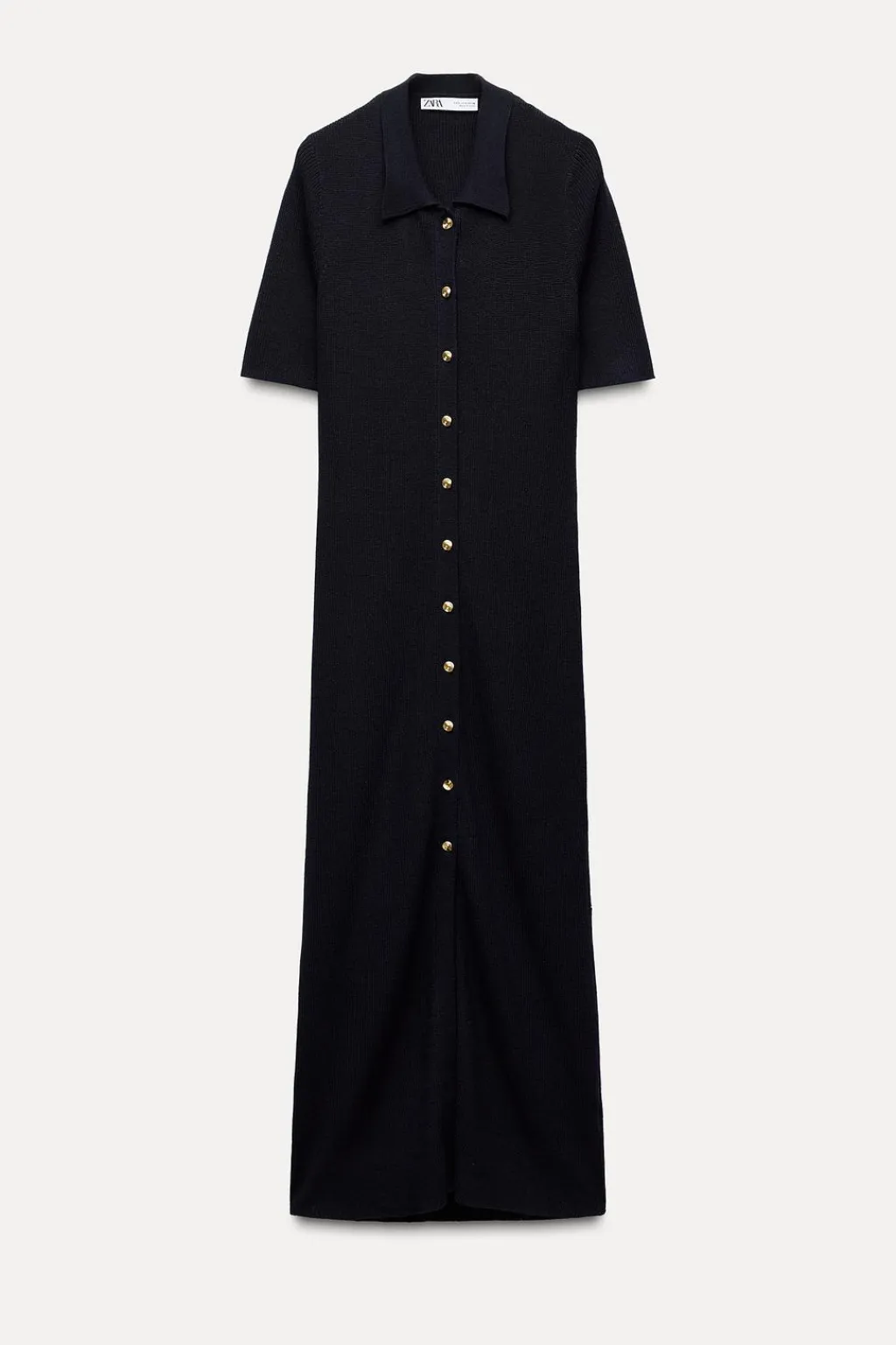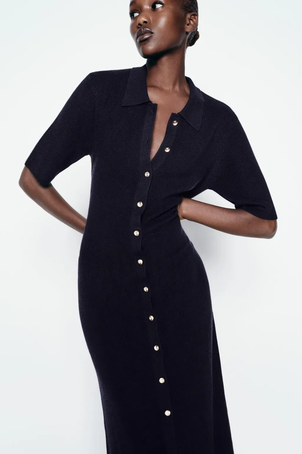 Vestido midi de cuello camisero y manga corta. Cierre frontal con botones.