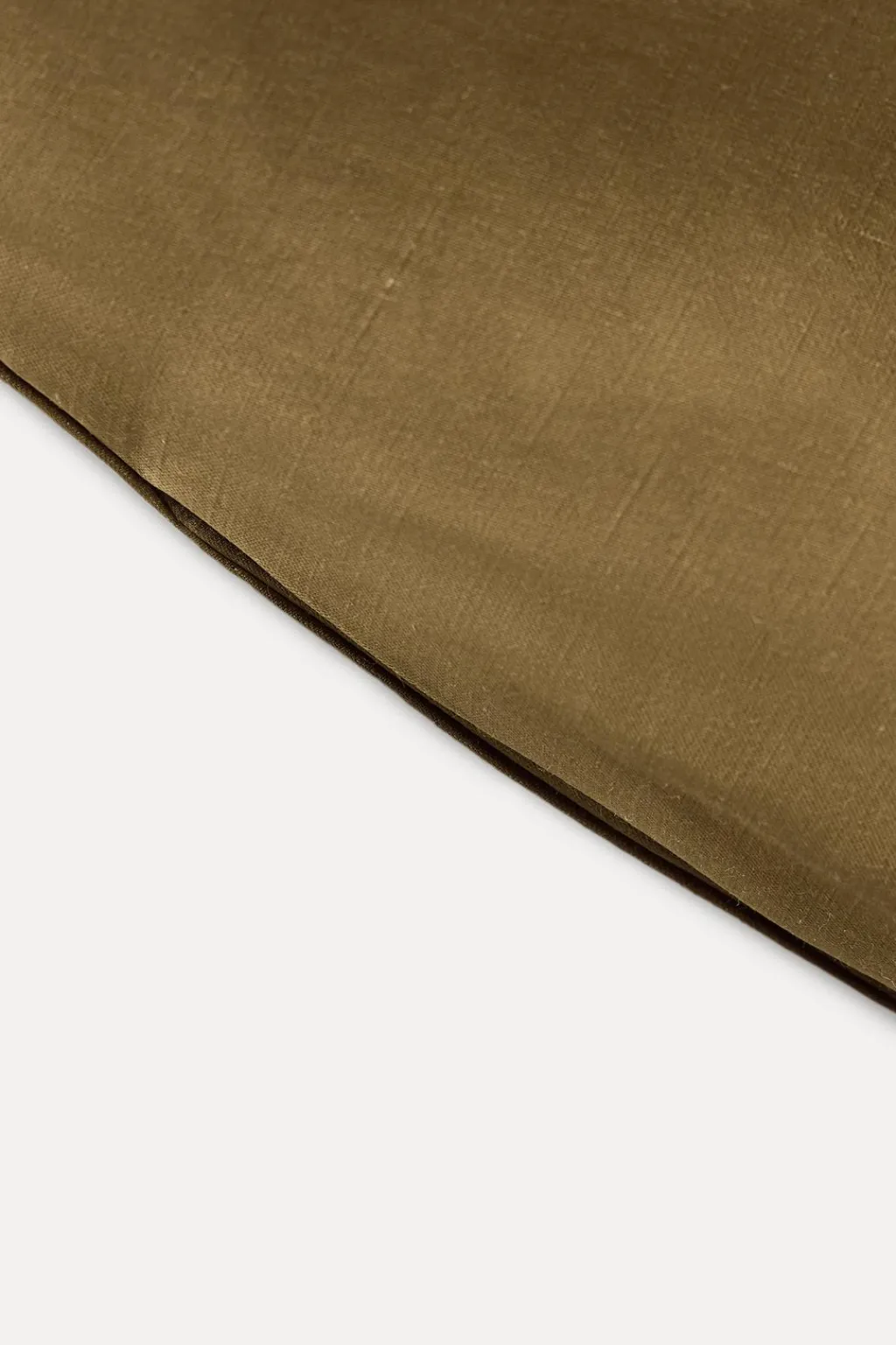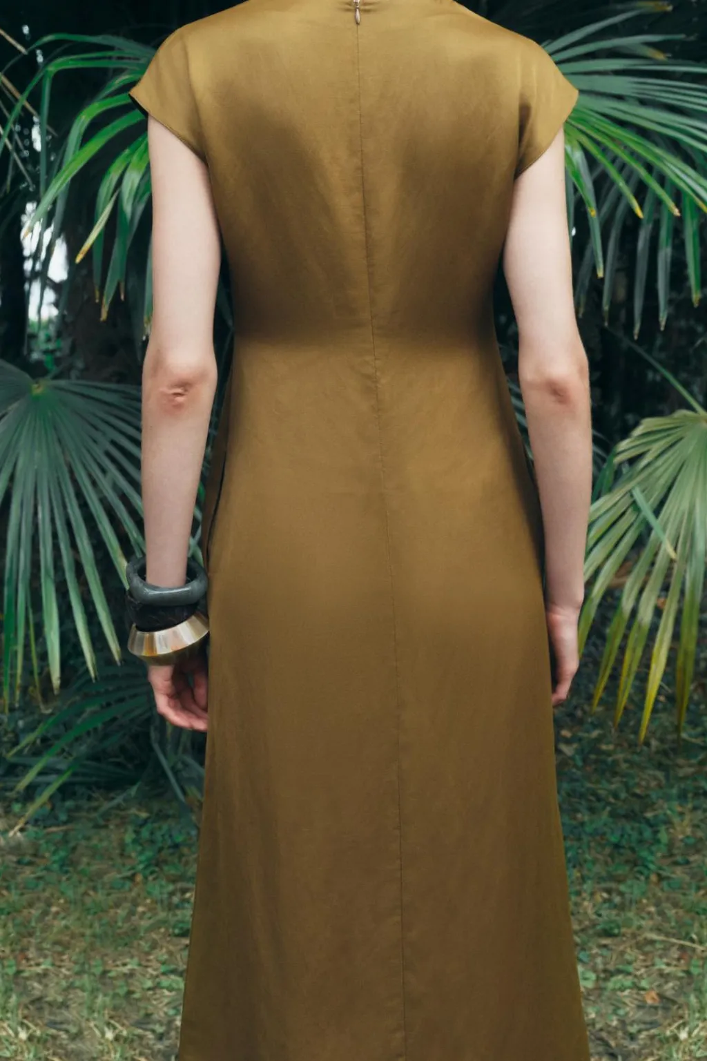 Vestido midi confeccionado con 30% de lino. Escote pico y manga sisa. Cierre en espalda con cremallera oculta en costura.