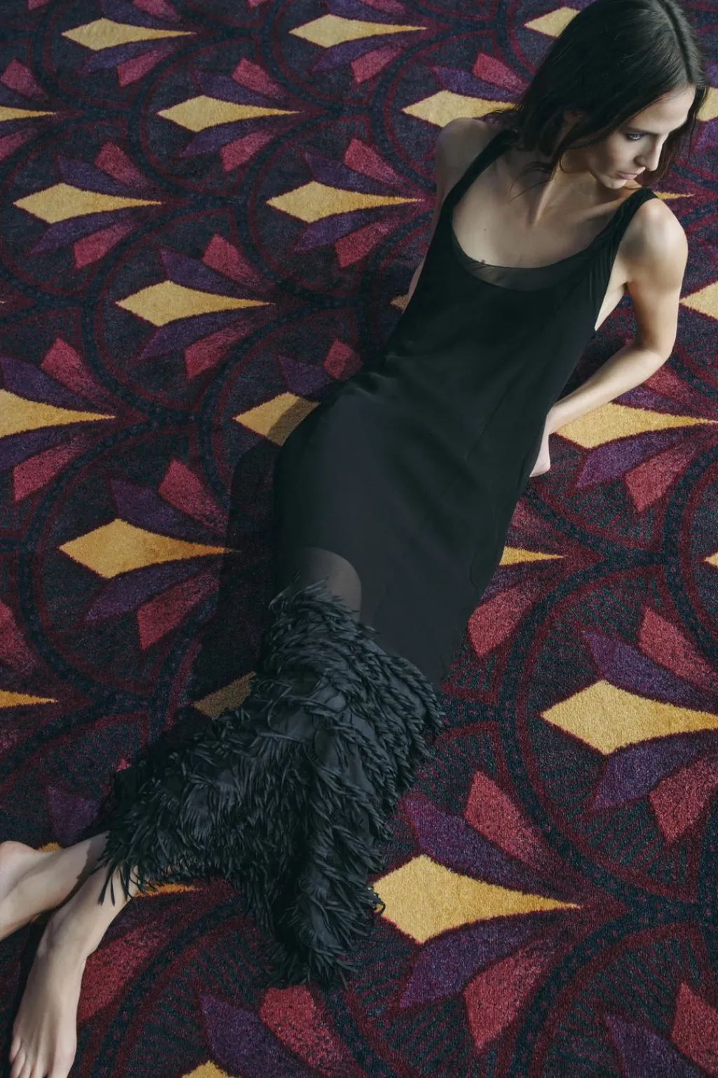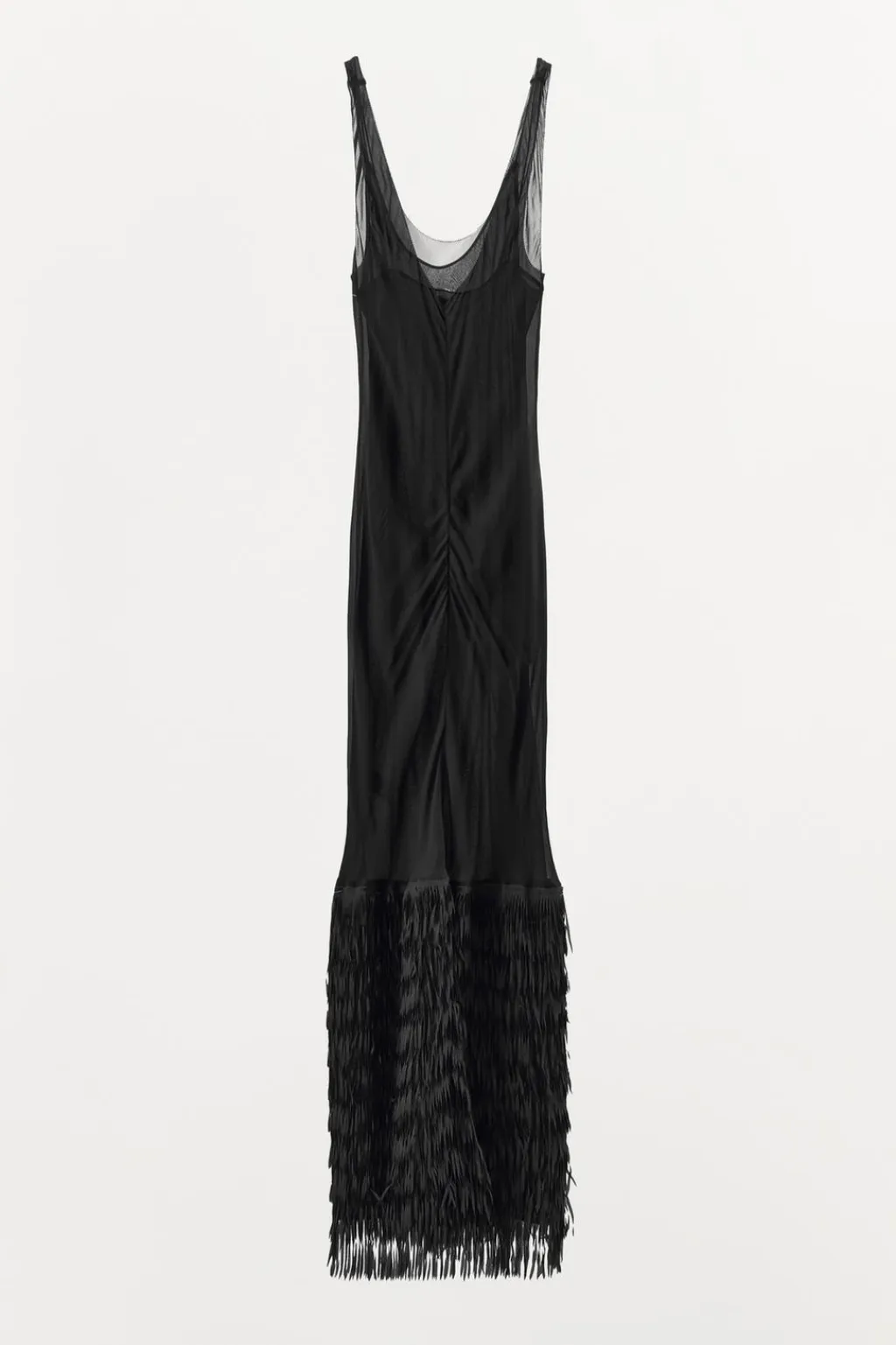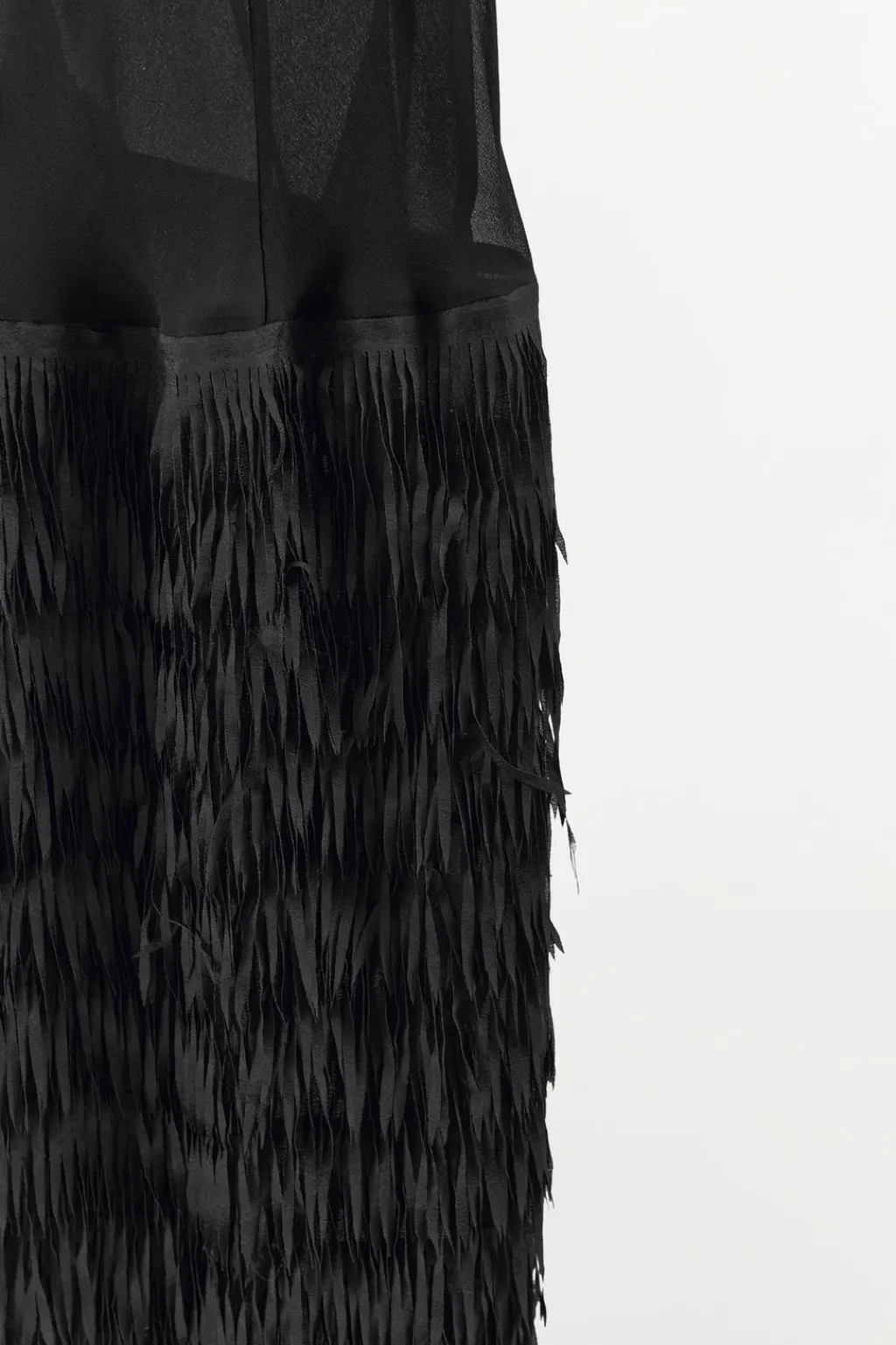 Vestido largo de escote redondo y tirantes. Bajo acabado en flecos en mismo tejido combinados a tono. Forro interior.