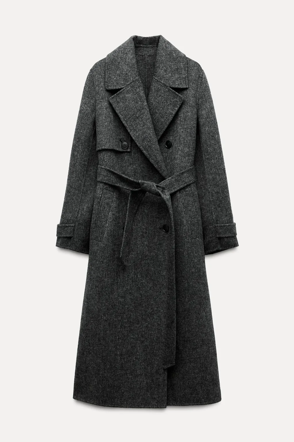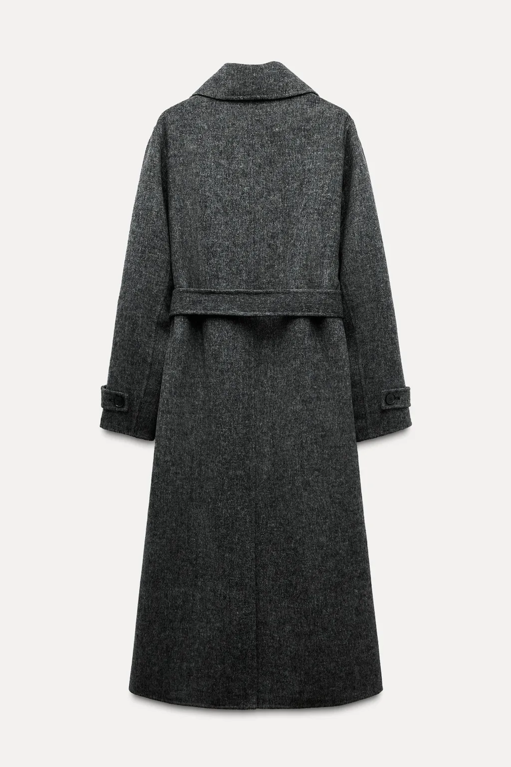 Abrigo confeccionado con lana. Cuello solapa y manga larga acabada con trabilla y botón. Bolsillos delanteros de vivo. Bajo con abertura en espalda. Cierre frontal cruzado con botones y cinturón del mismo tejido.