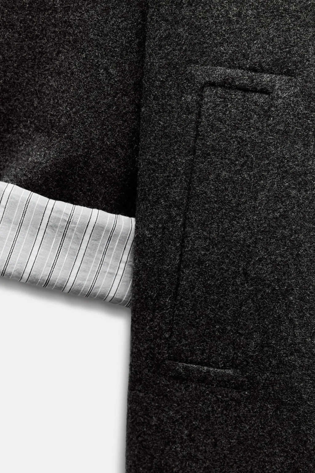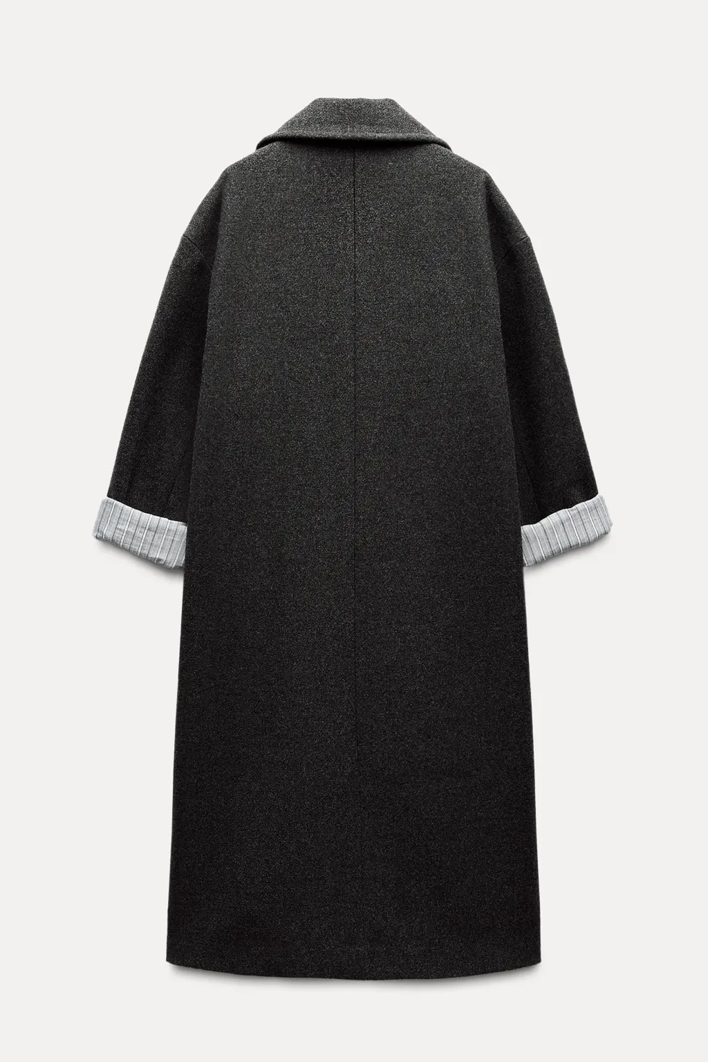 Abrigo de cuello solapa y manga larga acabada en vuelta con forro combinado a contraste. Bolsillos delanteros de vivo. Cierre frontal cruzado con botones.