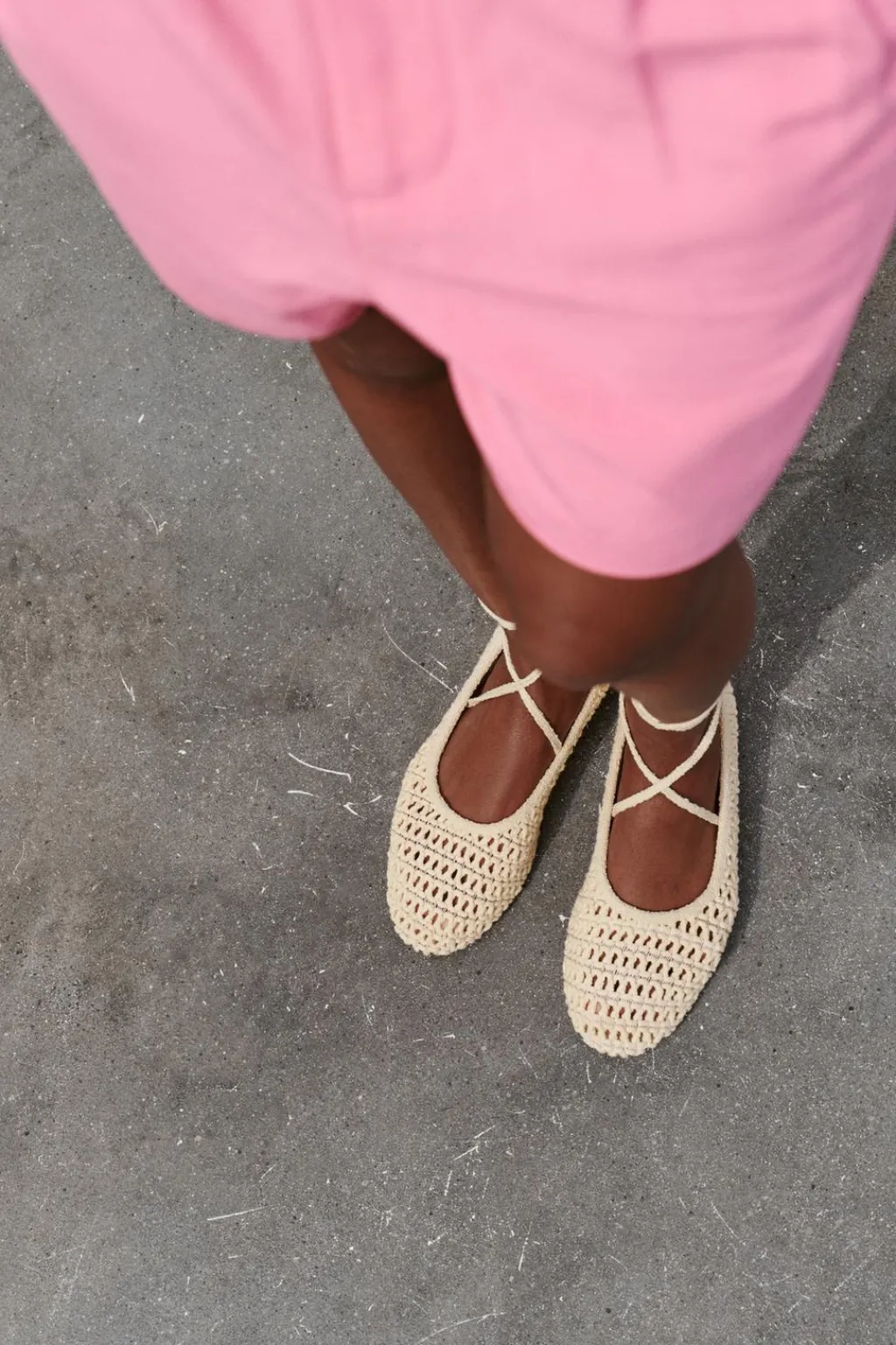 Zapato plano tipo bailarina en crochet. Cierre mediante tiras para atar en el tobillo.