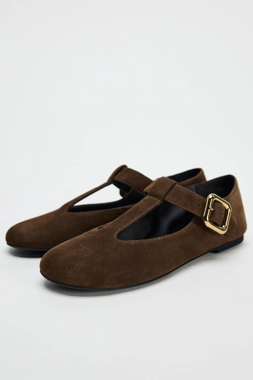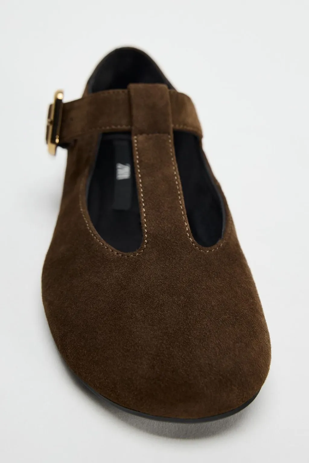 Zapato tipo bailarina en ante. Detalle de hebilla en la parte delantera. Acabado en punta redonda.