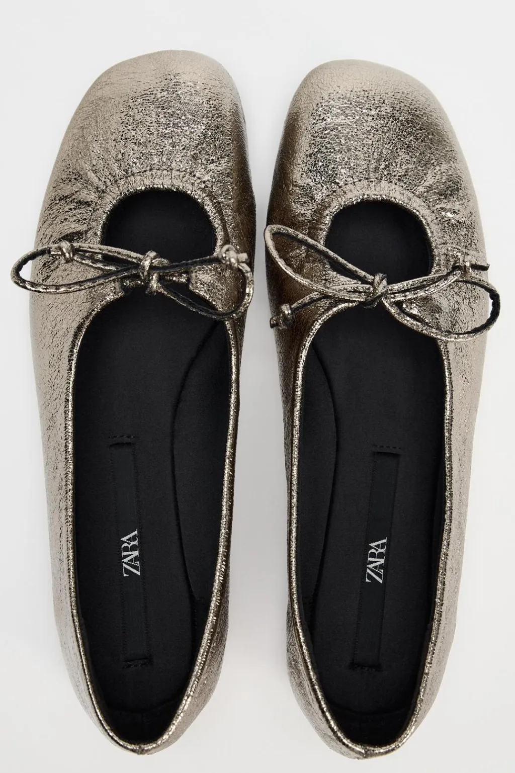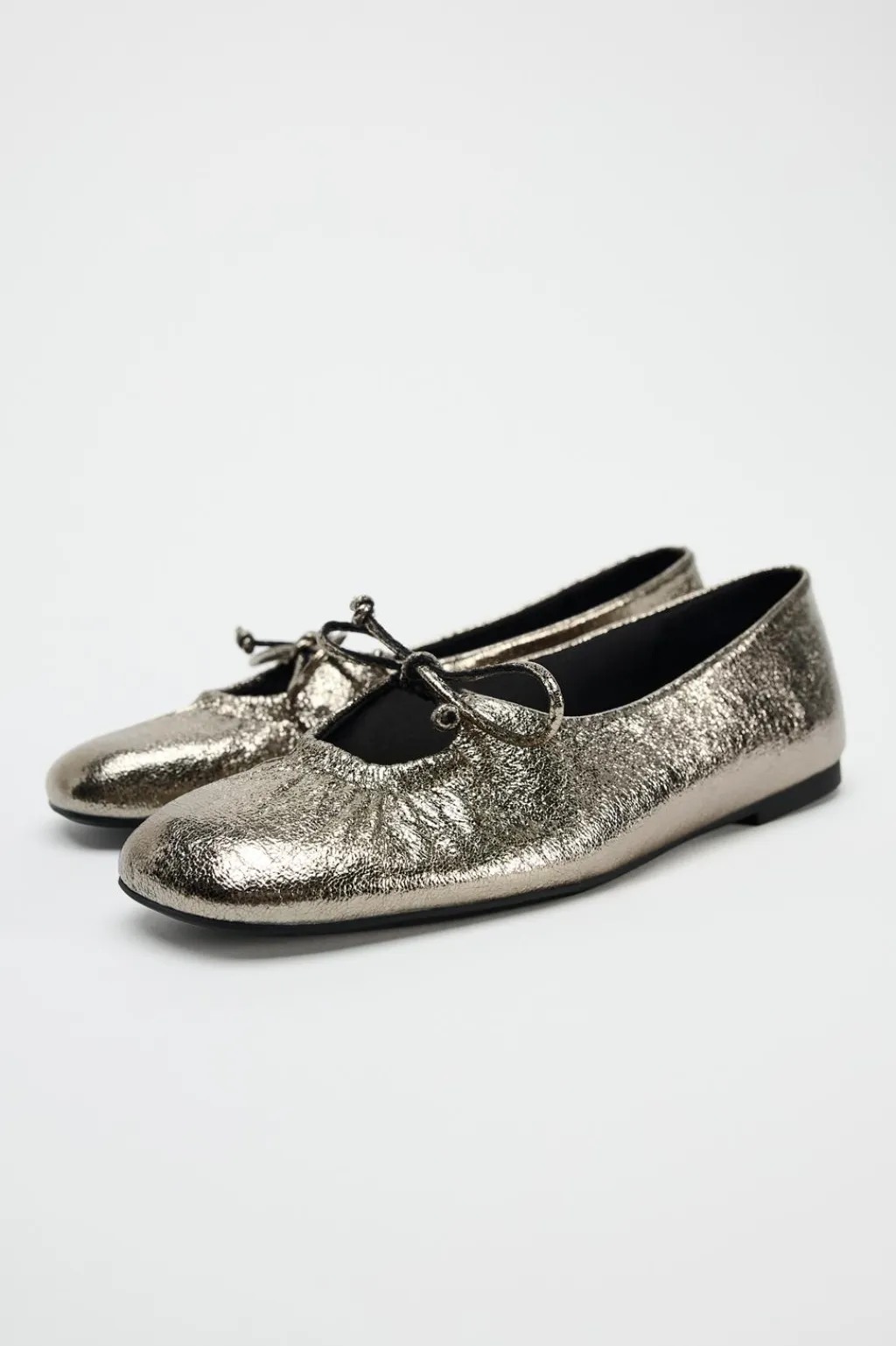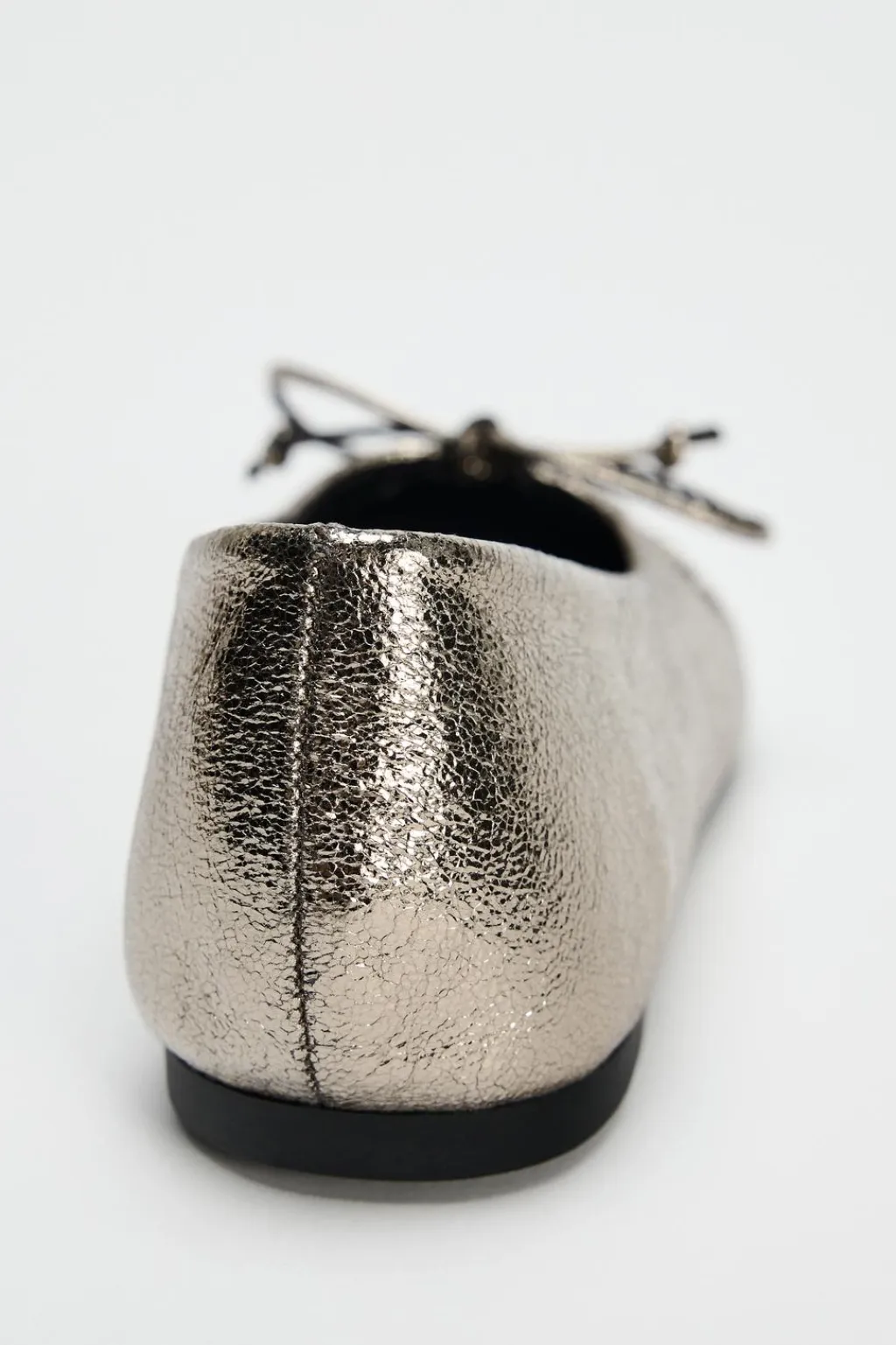 Zapato tipo bailarina efecto metalizado. Detalle de lazo en el corte. Acaban en punta redonda.