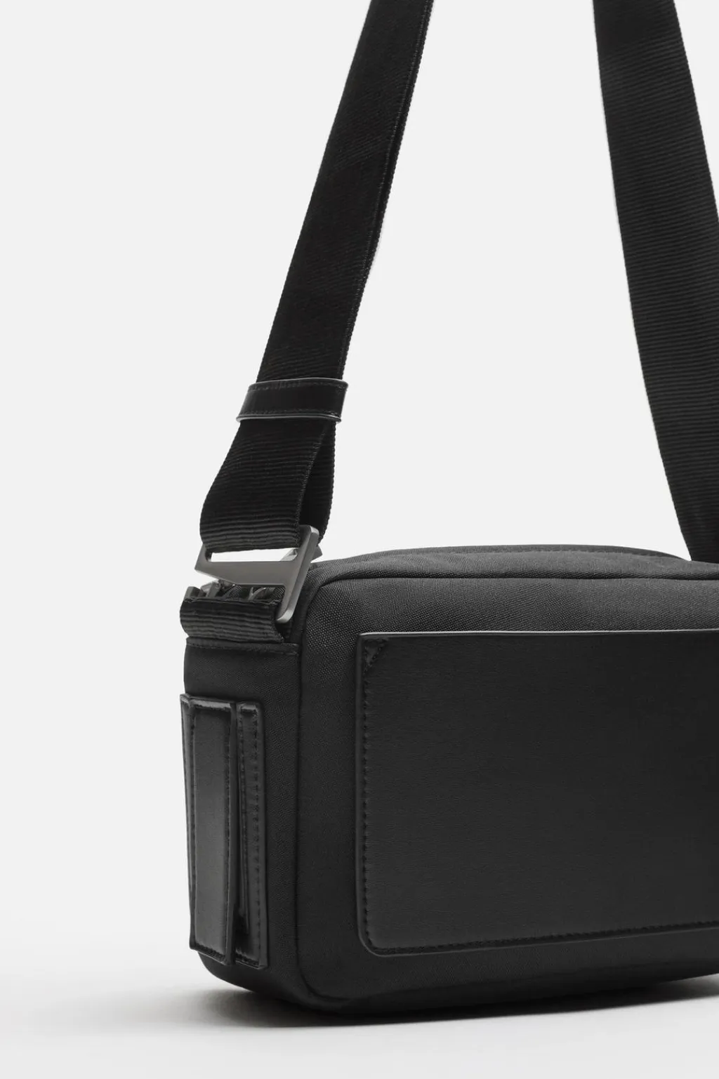 Bolso tipo bandolera. Fabricada en nylon con bolsillo plano frontal y detalle de etiqueta de identificación en la parte lateral. Compartimento principal con cierre mediante cremallera. Compartimento secundario termosellado con cierre mediante cremallera y bolsillo plano en su interior. Asa ajustable.