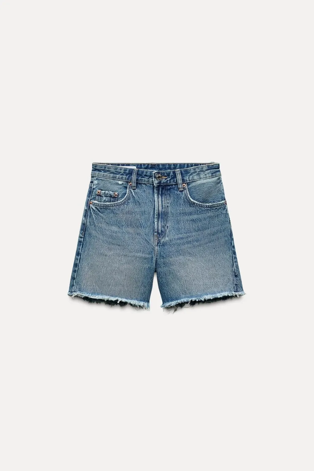 Bermuda de tiro medio con trabillas y cinco bolsillos. Bajo acabado deshilachado. Cierre frontal con cremallera y botón metálico.