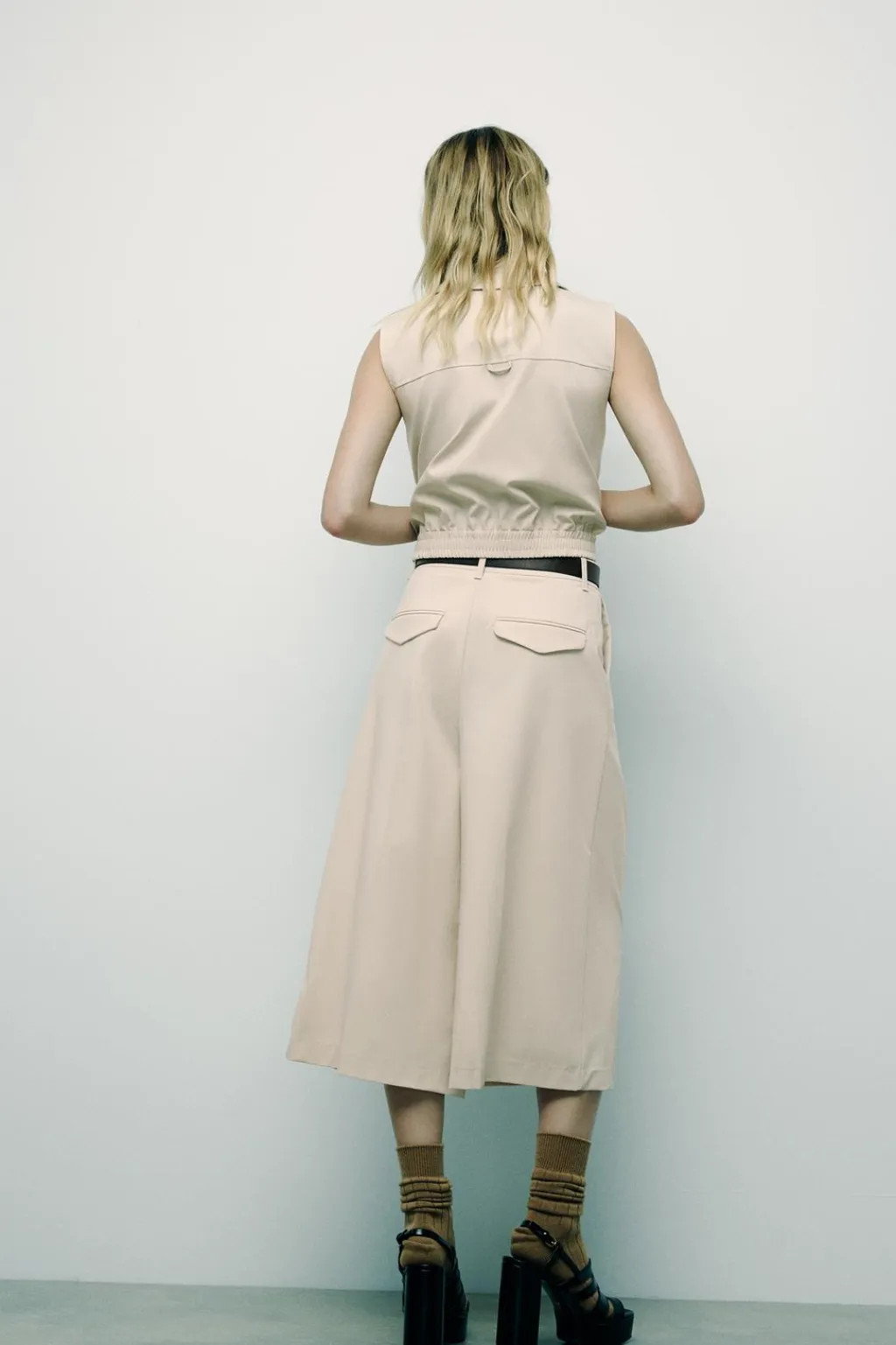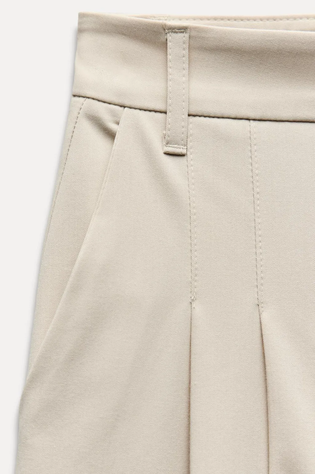 Bermuda de tiro medio con trabillas. Bolsillos laterales y detalle de solapas en espalda. Pinzas en delantero. Cierre frontal con cremallera, botón interior y gancho metálico.