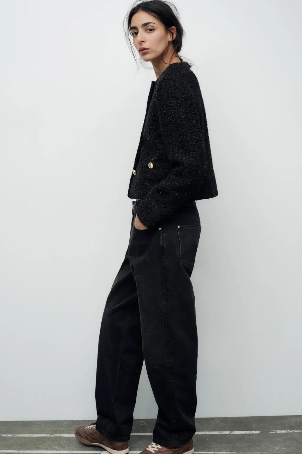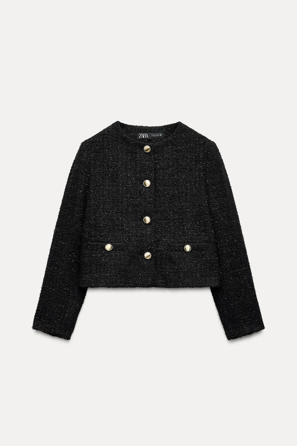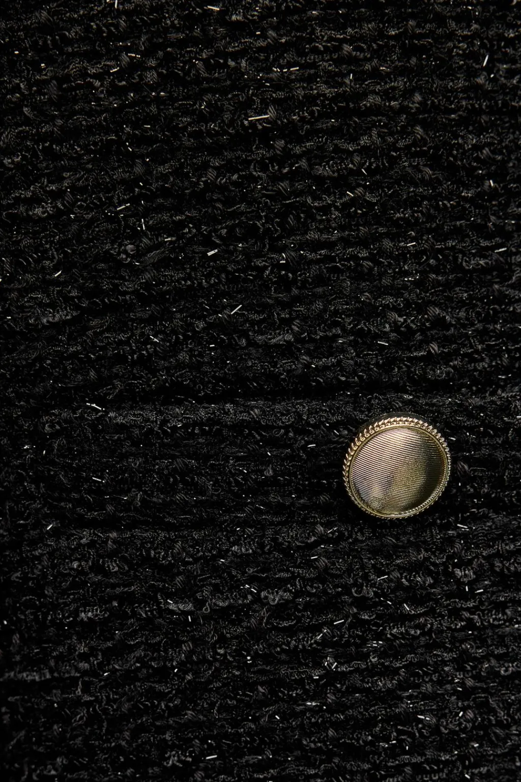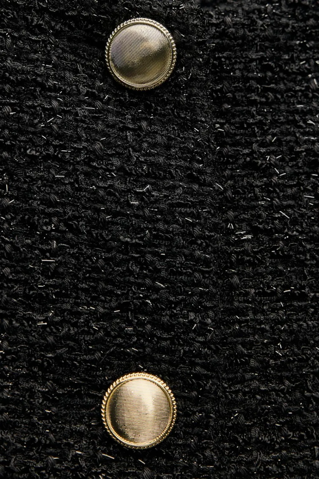 Blazer de cuello redondo y manga larga. Falsos bolsillos delanteros de vivo con botón. Detalle de hilo metalizado. Cierre frontal con botones dorados.