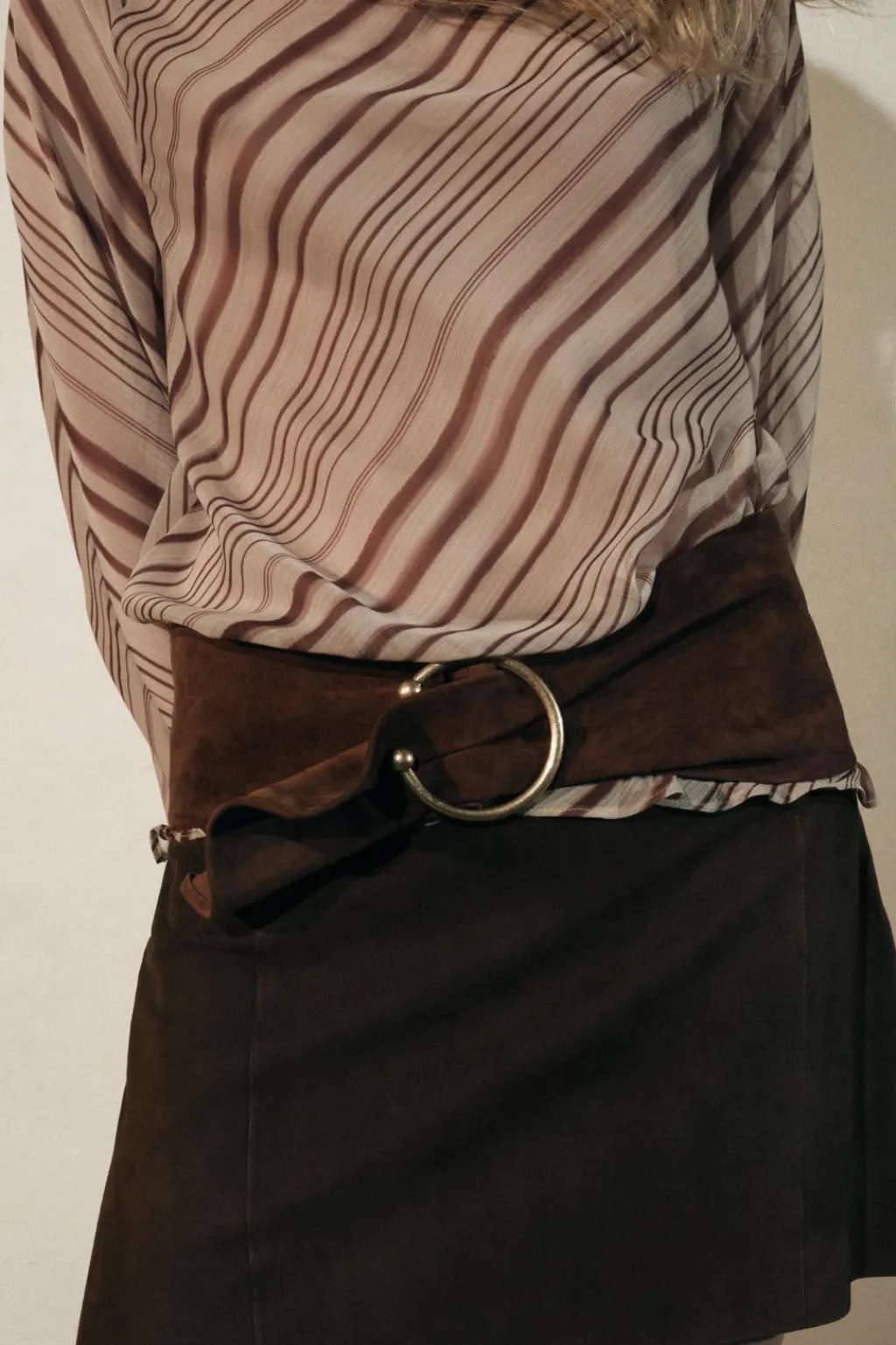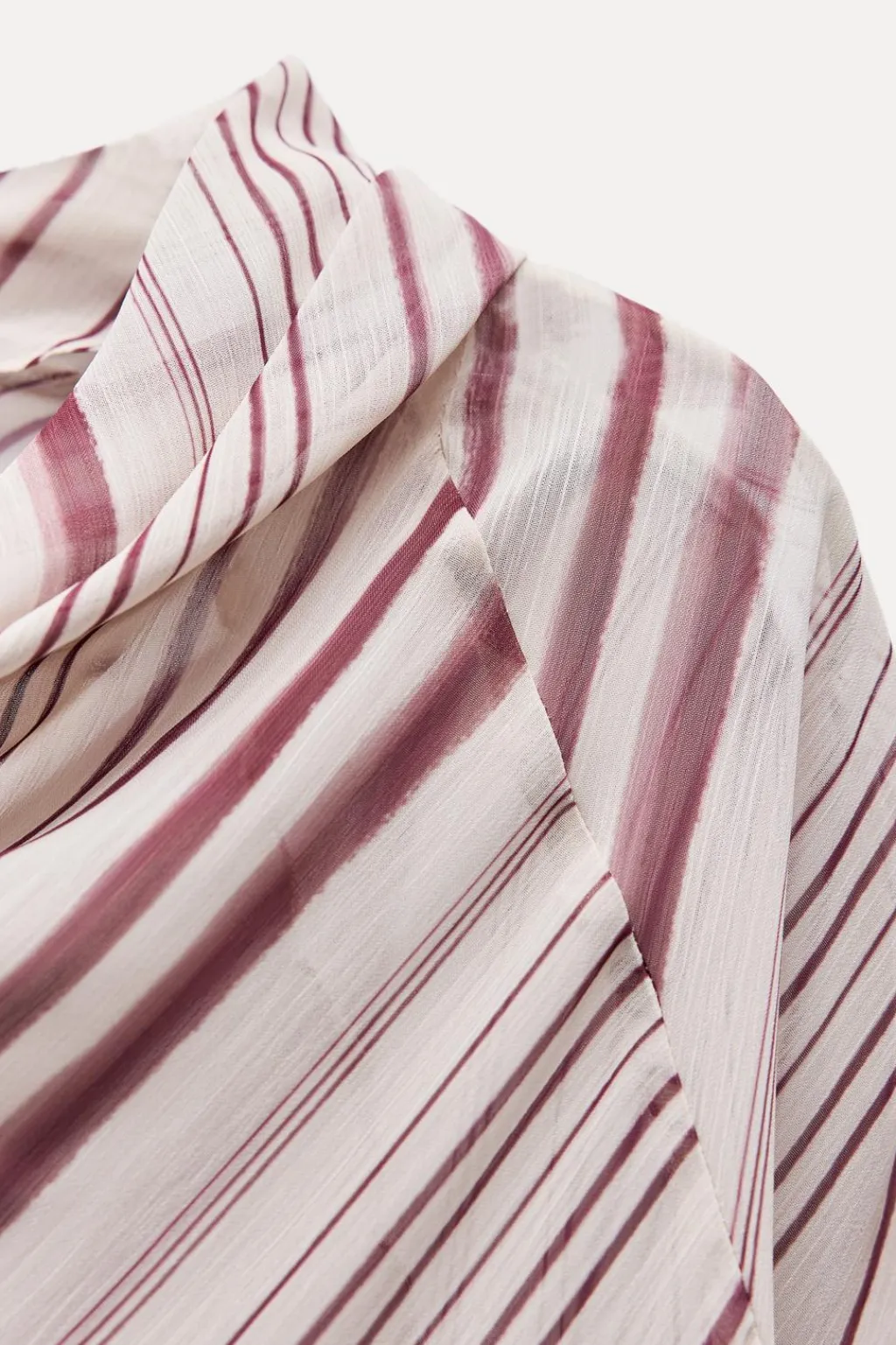 Blusa semitransparente de cuello drapeado y manga larga.