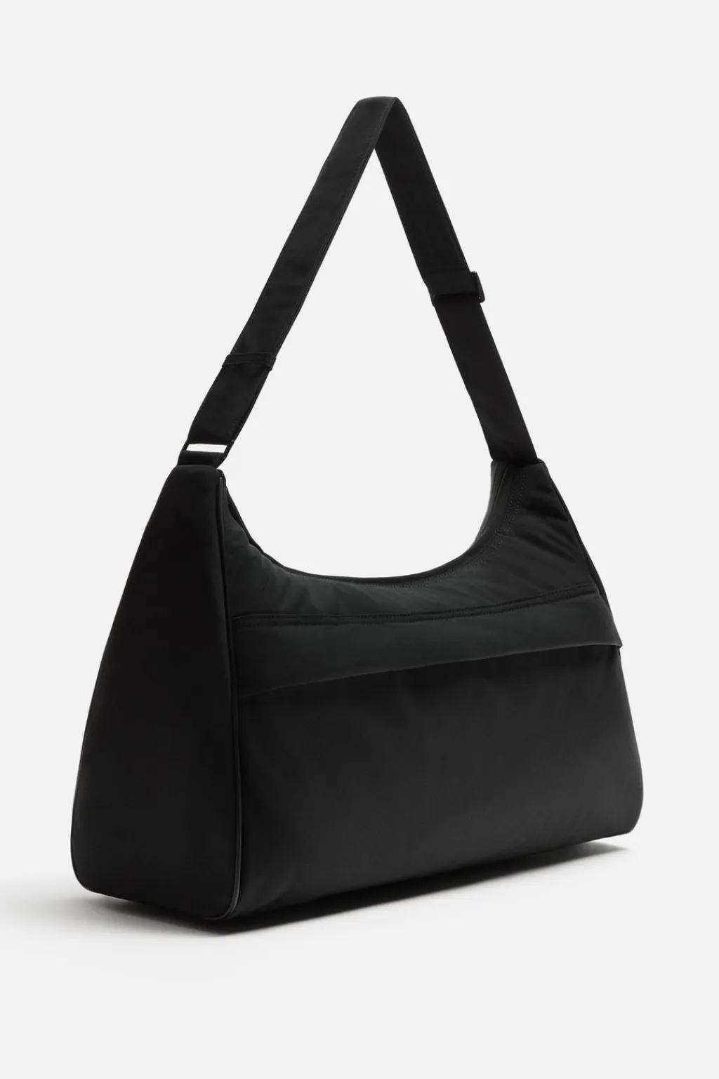 Bolso de hombro. Confeccionado en tejido técnico. Compartimento principal con cierre de cremallera y en su interior cuenta con un bolsillo pequeño con cierre con cremallera. En la parte frontal cuenta con un compartimento de tamaño grande y cierre de cremallera. Asa de hombro ajustable.
