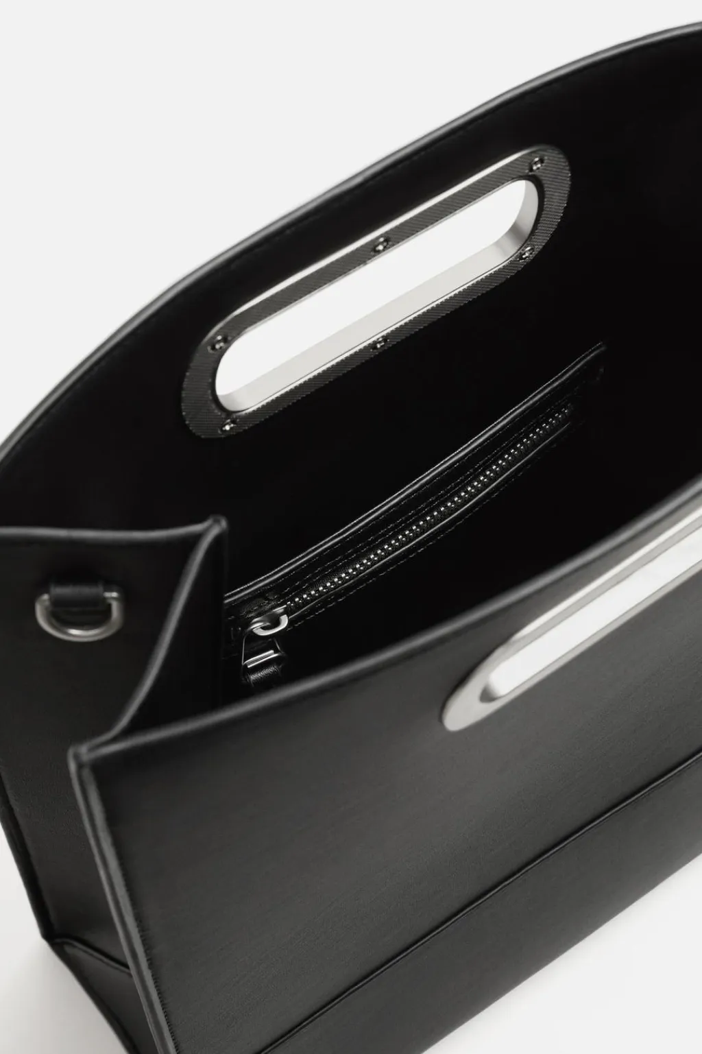 Bolso de mano semirígido. Amplio compartimento principal. Dos pequeños bolsillos interiores auxiliares. Asa de mano con detalle metálico. Asa de hombro removible y ajustable.