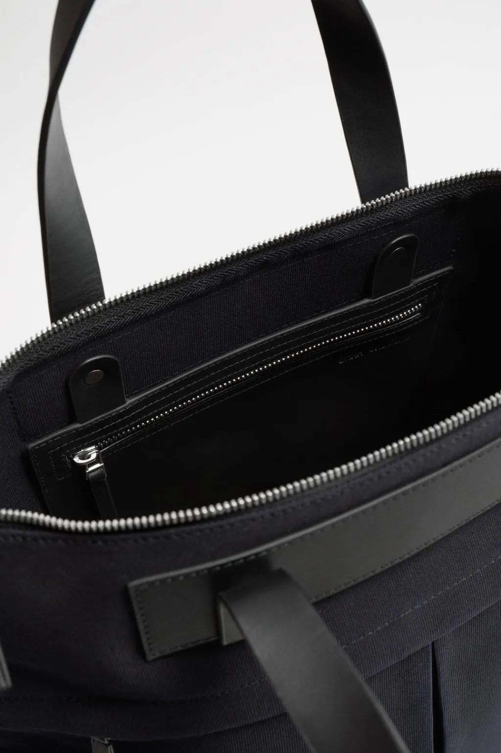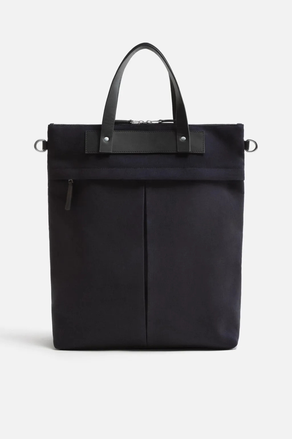 Bolso tipo shopper fabricado en tejido de algodón con detalles en piel. Bolsillo principal con cierre mediante doble cremallera. En su interior cuenta con un bolsillo mediano con cierre mediante cremallera. En la parte frontal se ubica un bolsillo grande con cierre de cremallera. Dispone de un asa de hombro ajustable y extraíble.