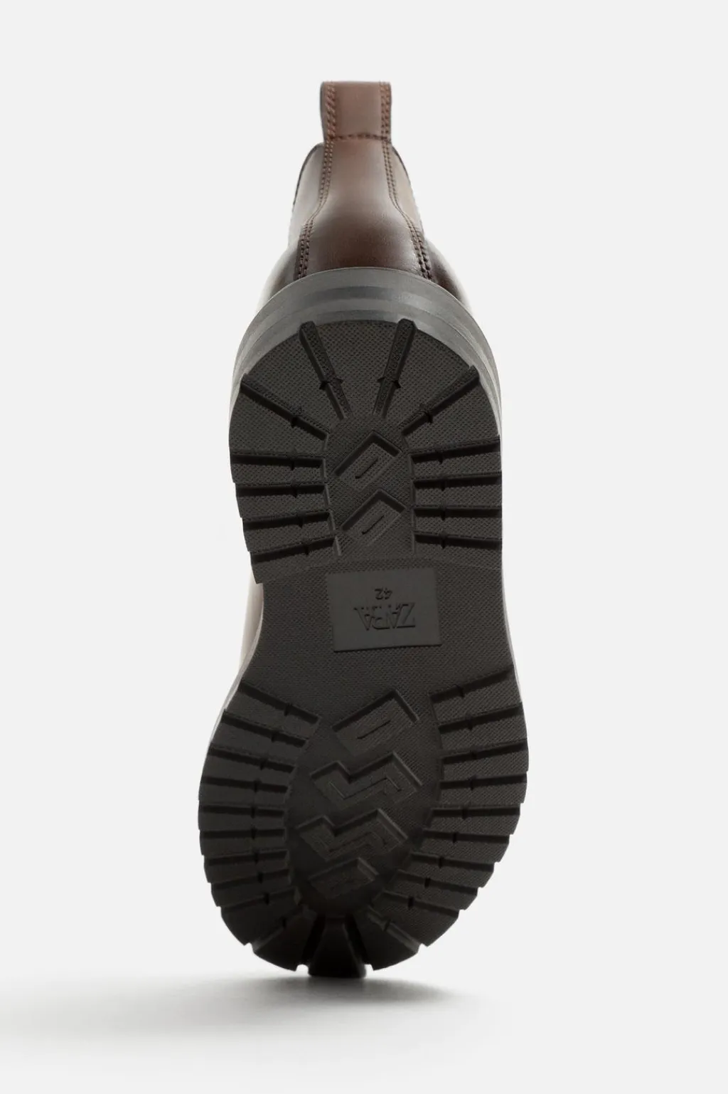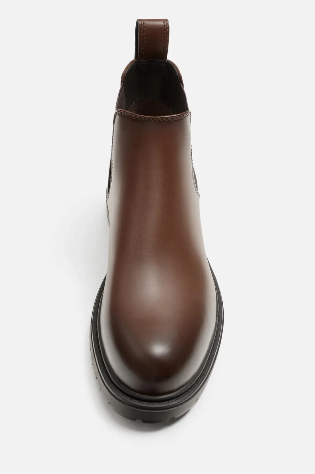 Bota estilo chelsea. Parte superior lisa. Piezas elásticas laterales y tirador trasero para facilitar el calce. Horma redonda. Suela con volumen y piso track.
