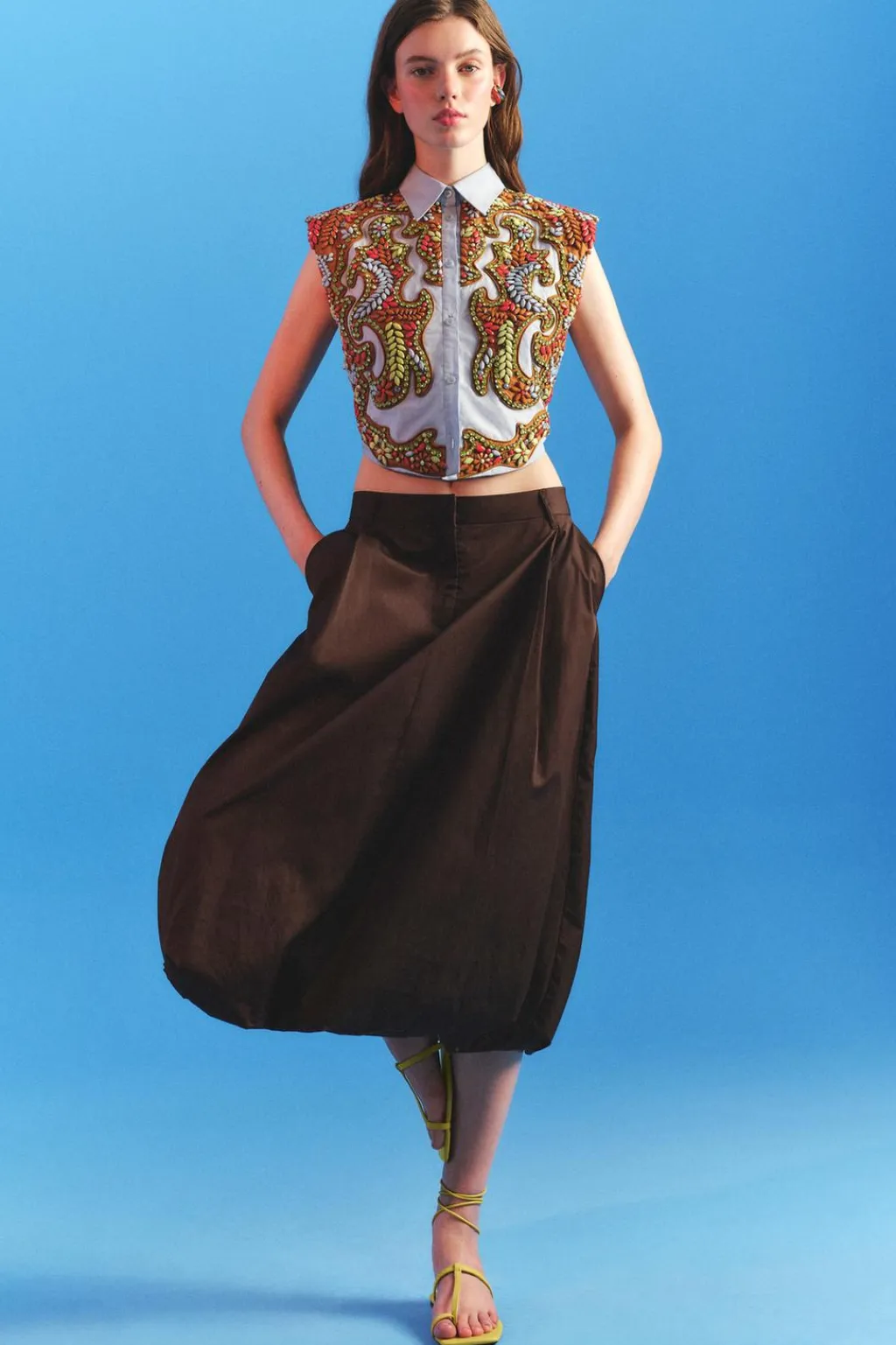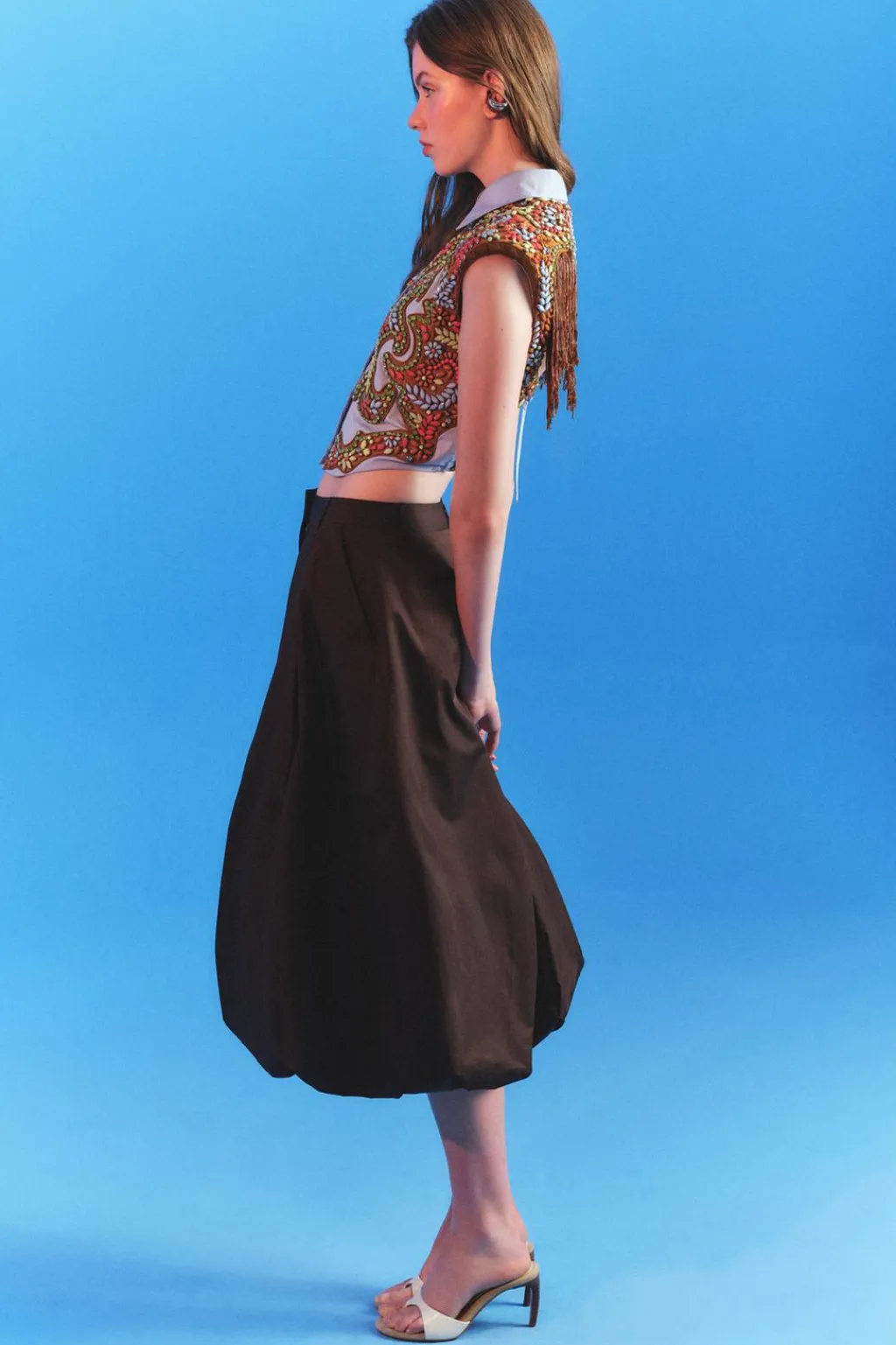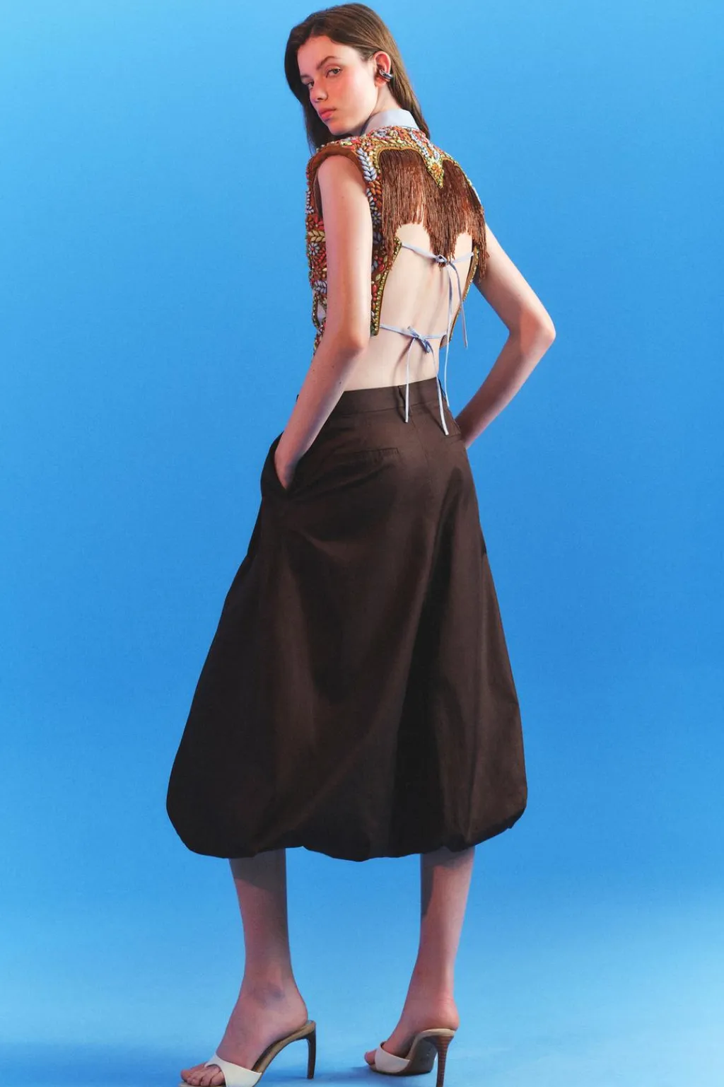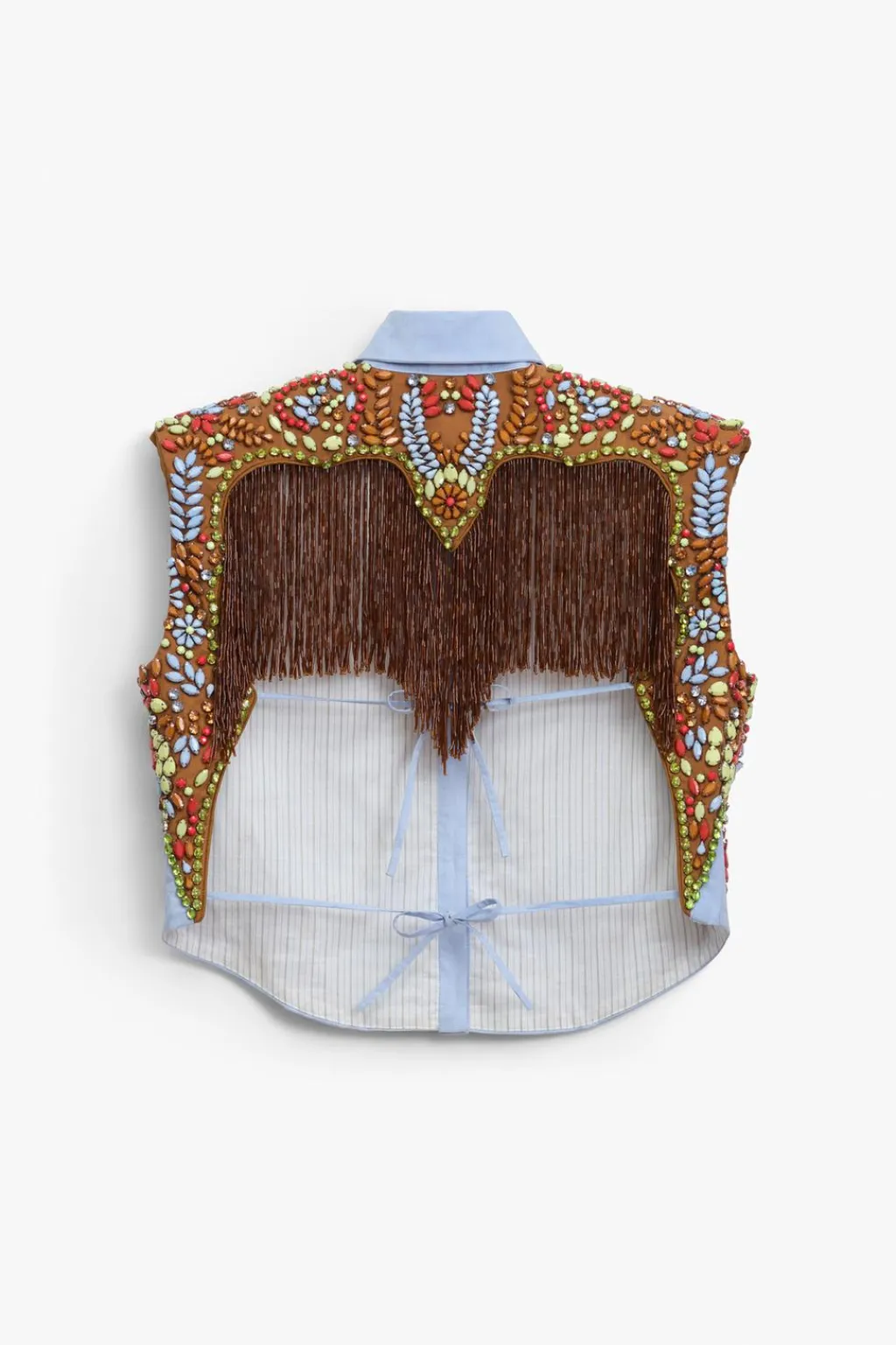 Camisa corta de cuello solapa y manga sisa con hombreras. Se ha elegido una base de popelín para atenuar el trabajo tan detallado. Apliques de abalorios en tonos ocre, sobre una base de algodón a contraste que equilibra el brillo general de la prenda. La espalda se ha dejado descubierta, destacando en ella una pieza de flecos en color ámbar. Esta pieza ha sido forrada con un algodón a rayas tomando como referencia los códigos de la camisería masculina. Cierre frontal con botones.