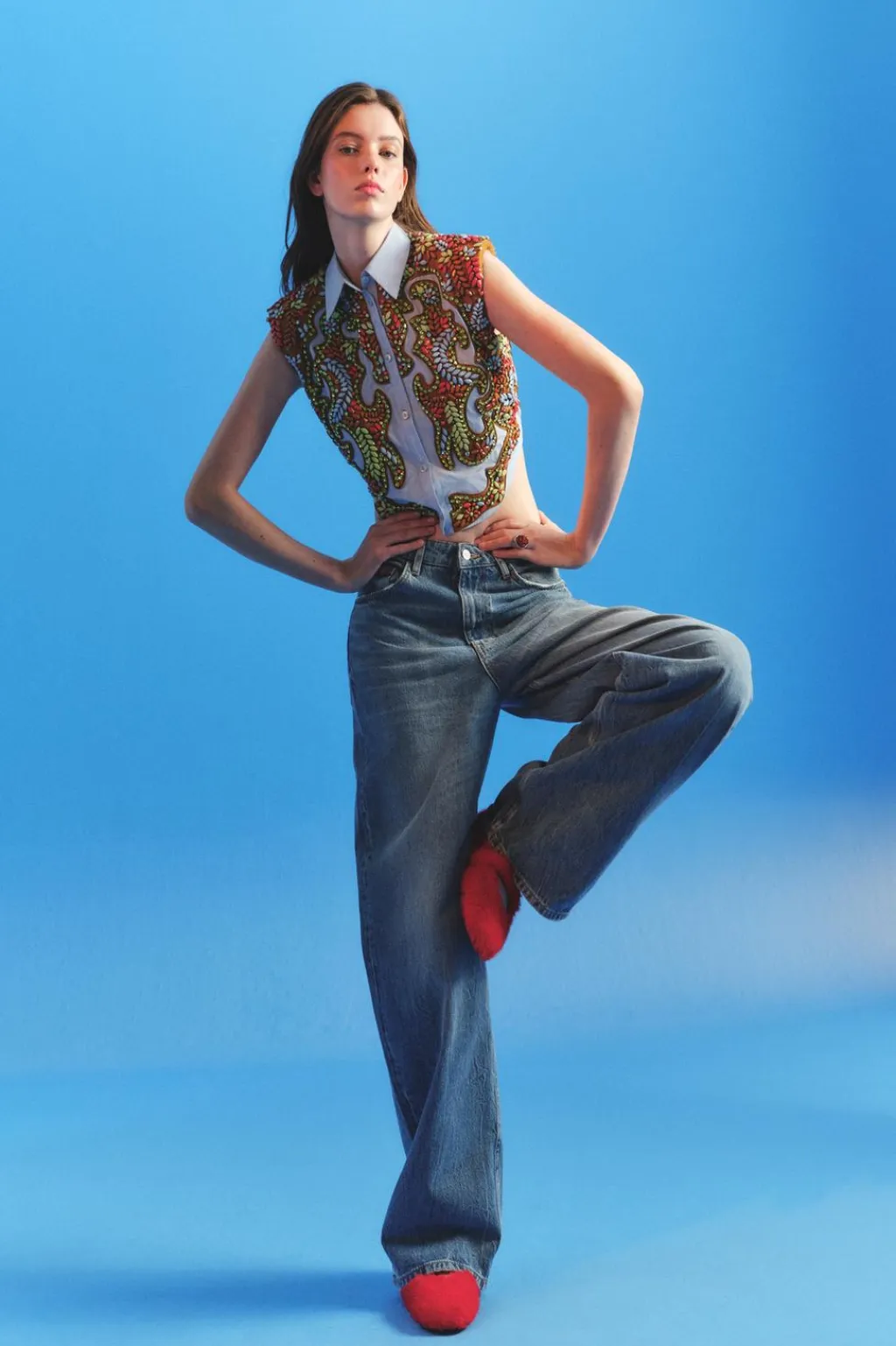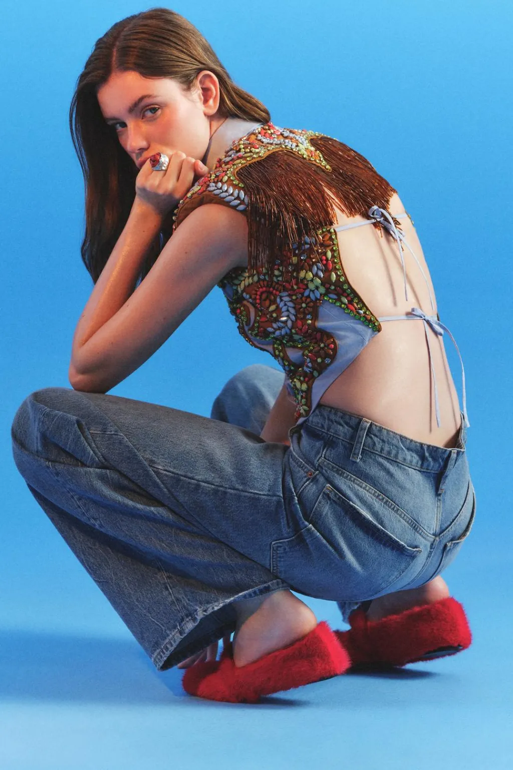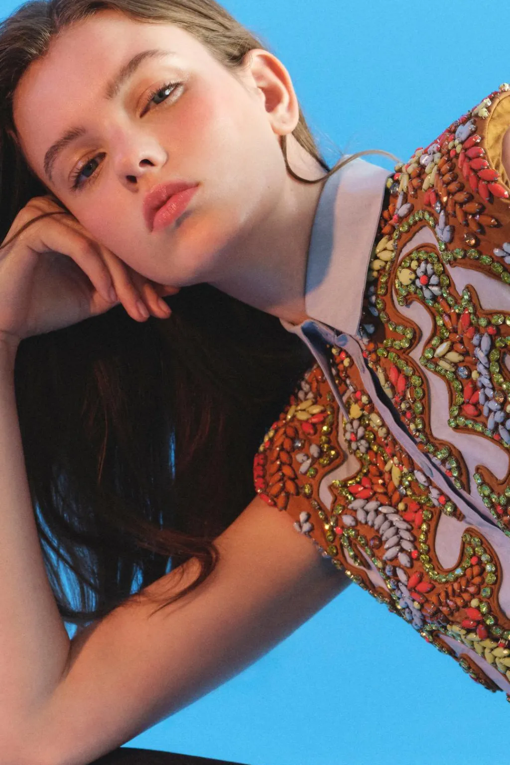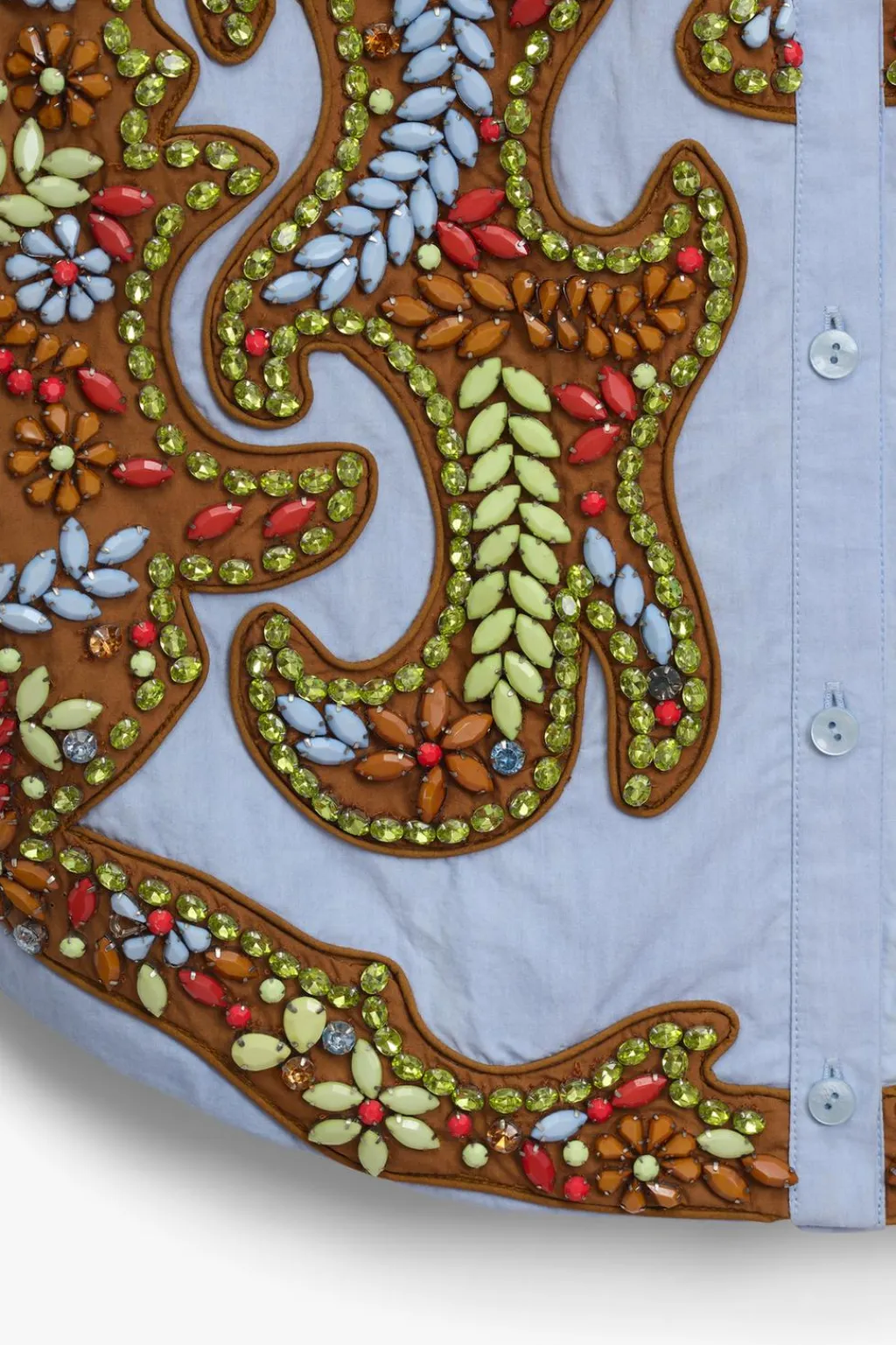 Camisa corta de cuello solapa y manga sisa con hombreras. Se ha elegido una base de popelín para atenuar el trabajo tan detallado. Apliques de abalorios en tonos ocre, sobre una base de algodón a contraste que equilibra el brillo general de la prenda. La espalda se ha dejado descubierta, destacando en ella una pieza de flecos en color ámbar. Esta pieza ha sido forrada con un algodón a rayas tomando como referencia los códigos de la camisería masculina. Cierre frontal con botones.