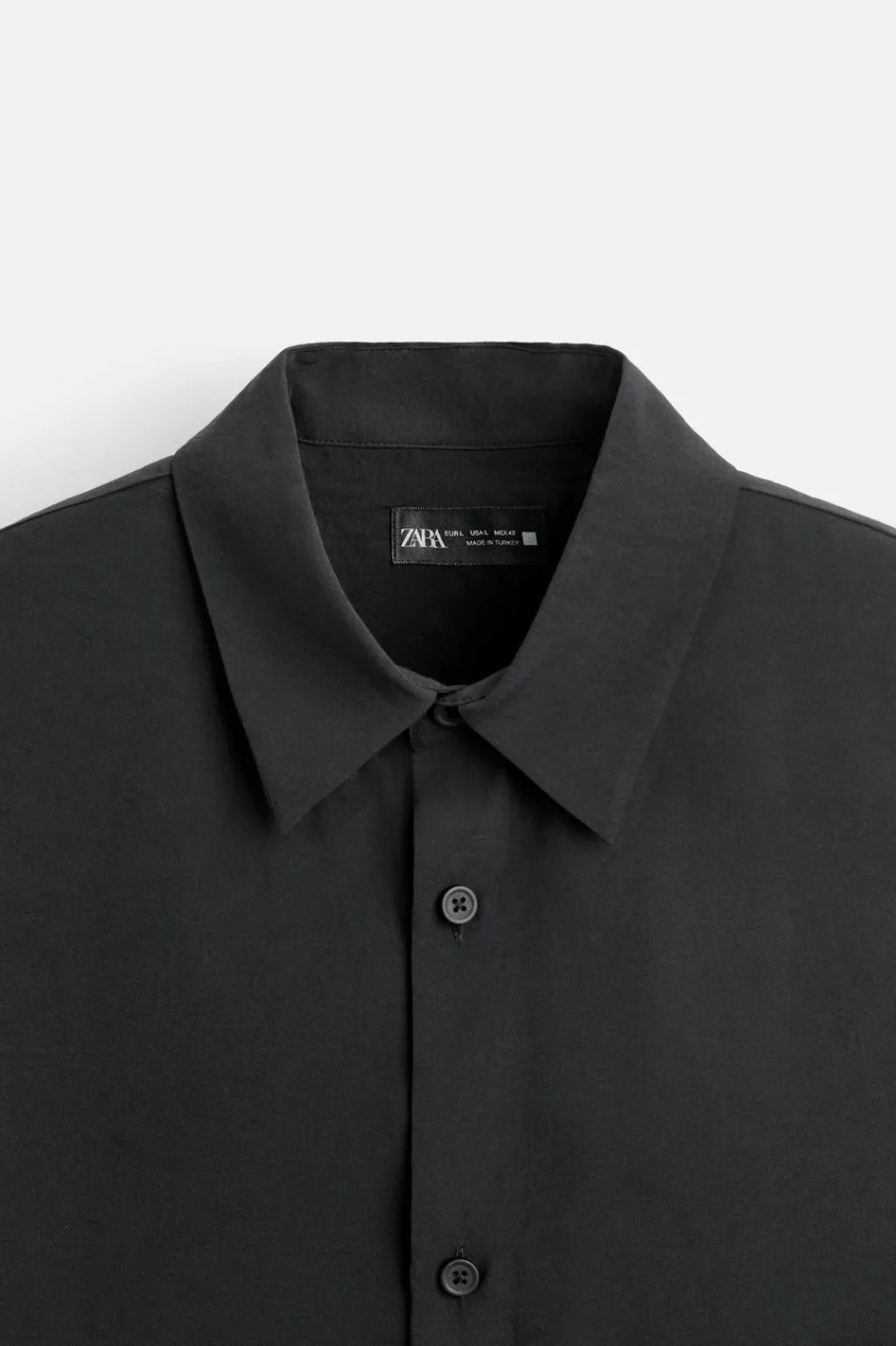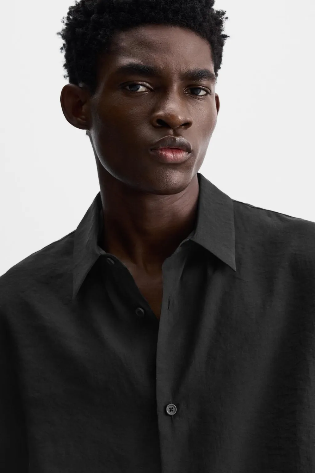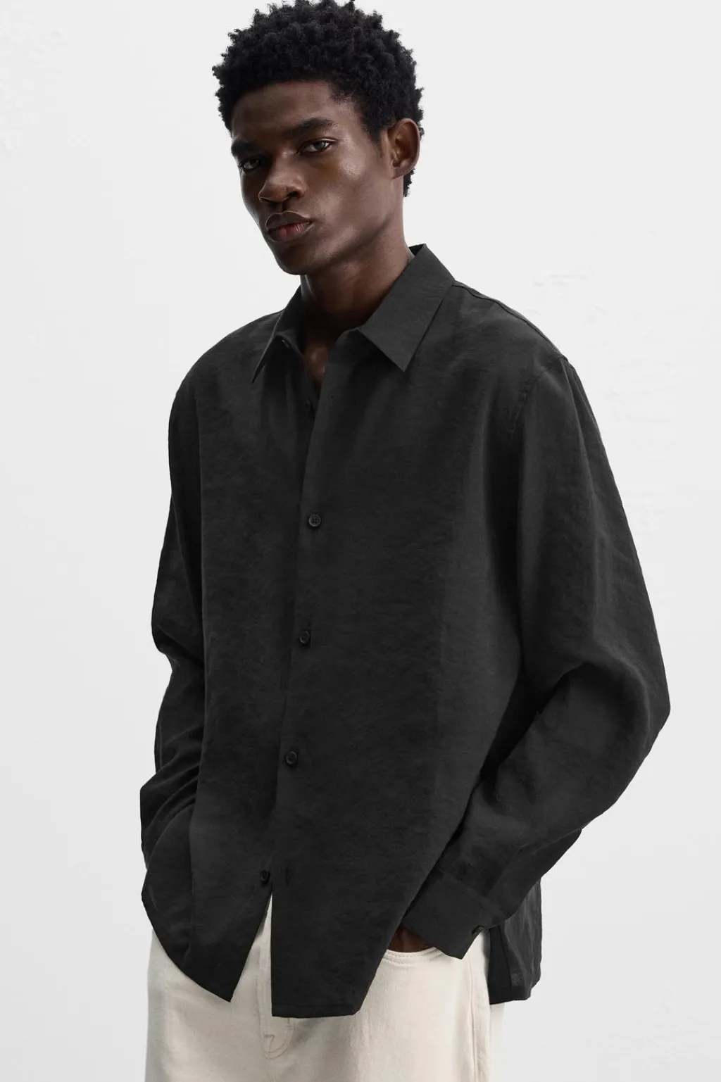 Camisa relaxed fit confeccionada en tejido con mezcla de modal. Cuello solapa y manga larga acabada en puño con botón. Bajo ajustable con botones en laterales. Cierre frontal de botonadura.