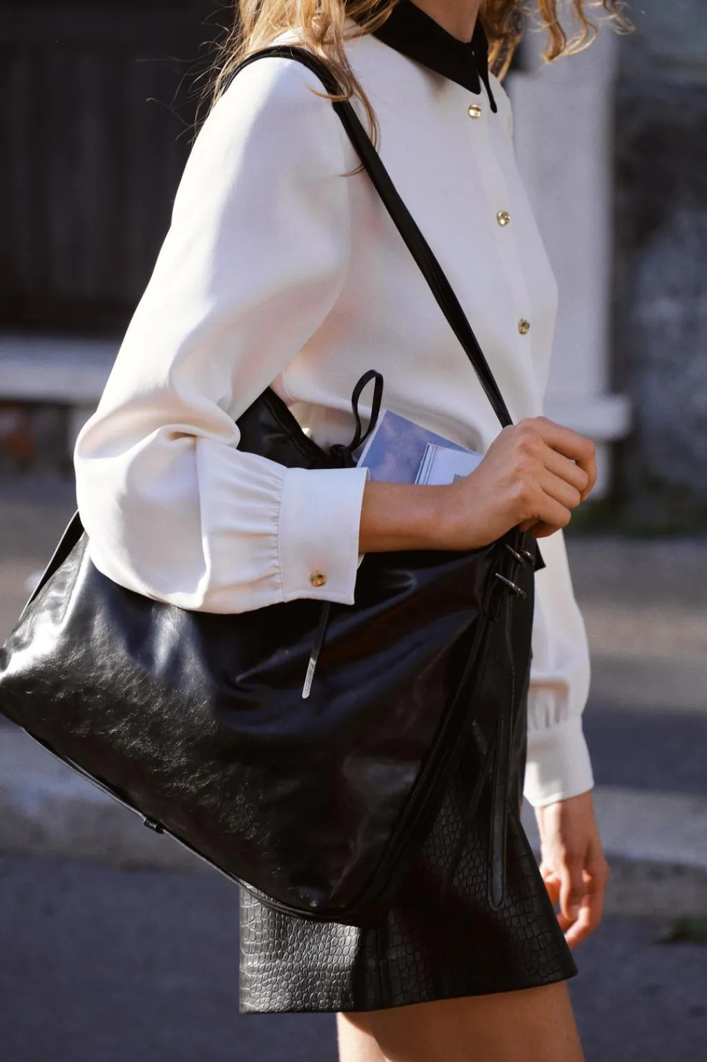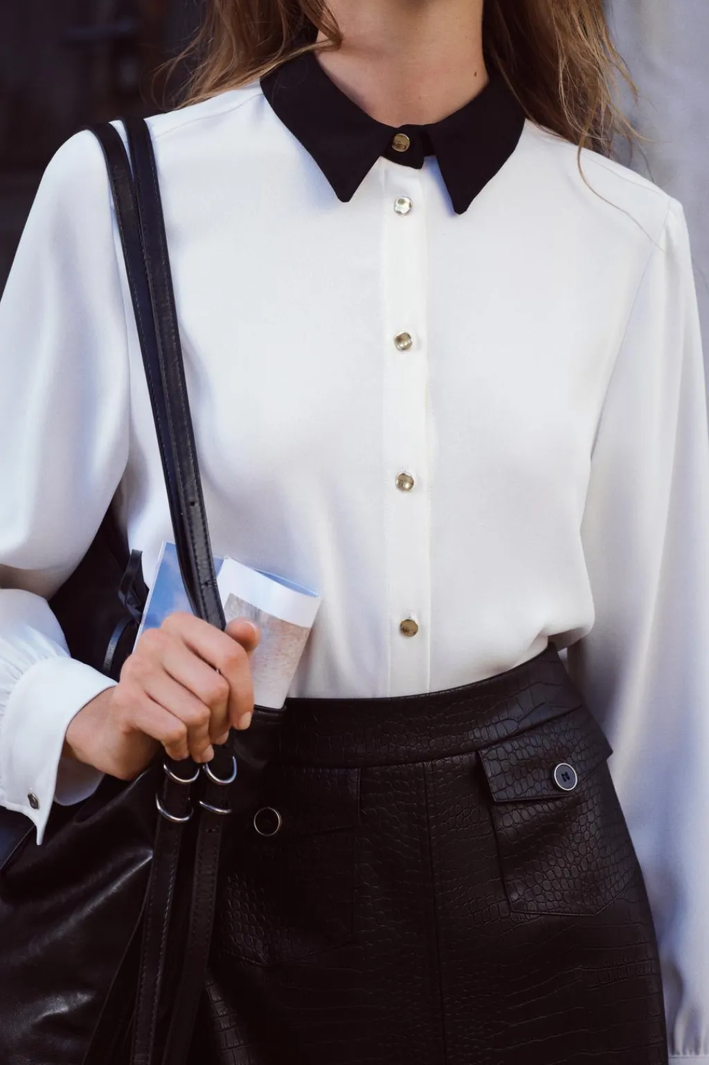 Camisa de cuello solapa combinado a contraste y manga larga. Cierre frontal con botones dorados.