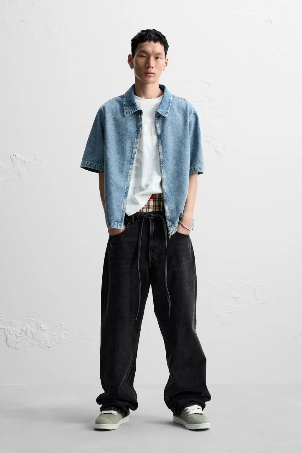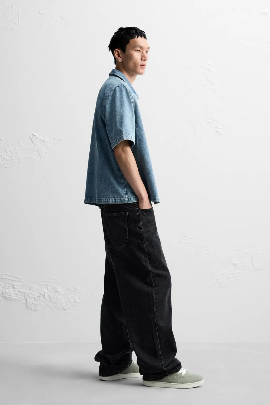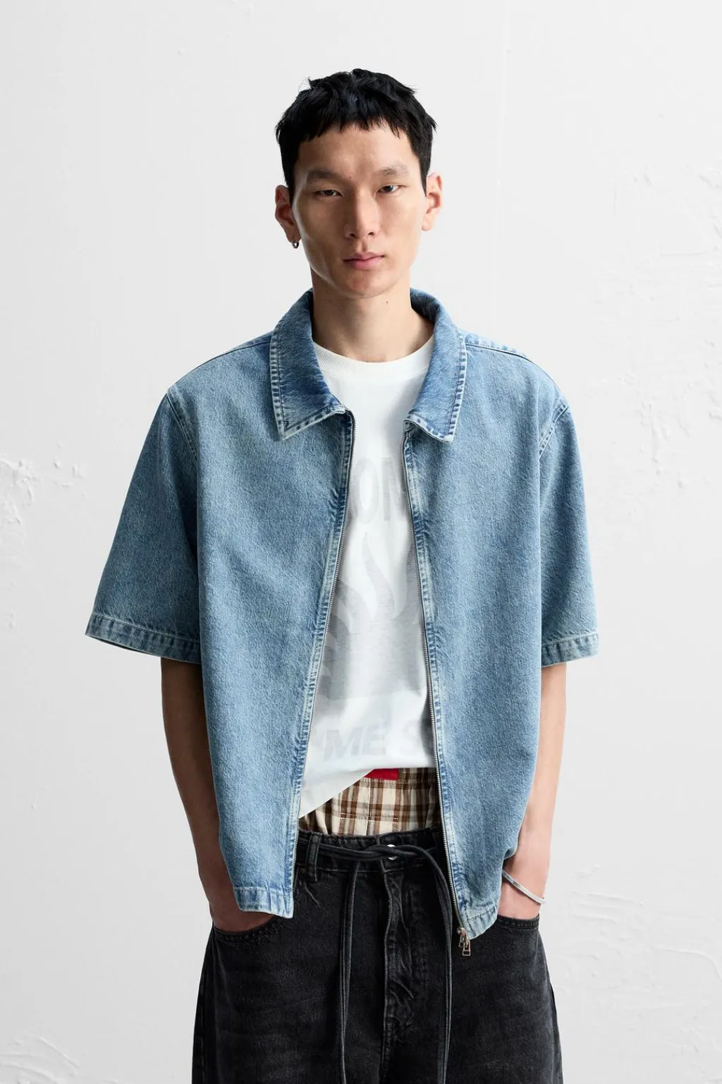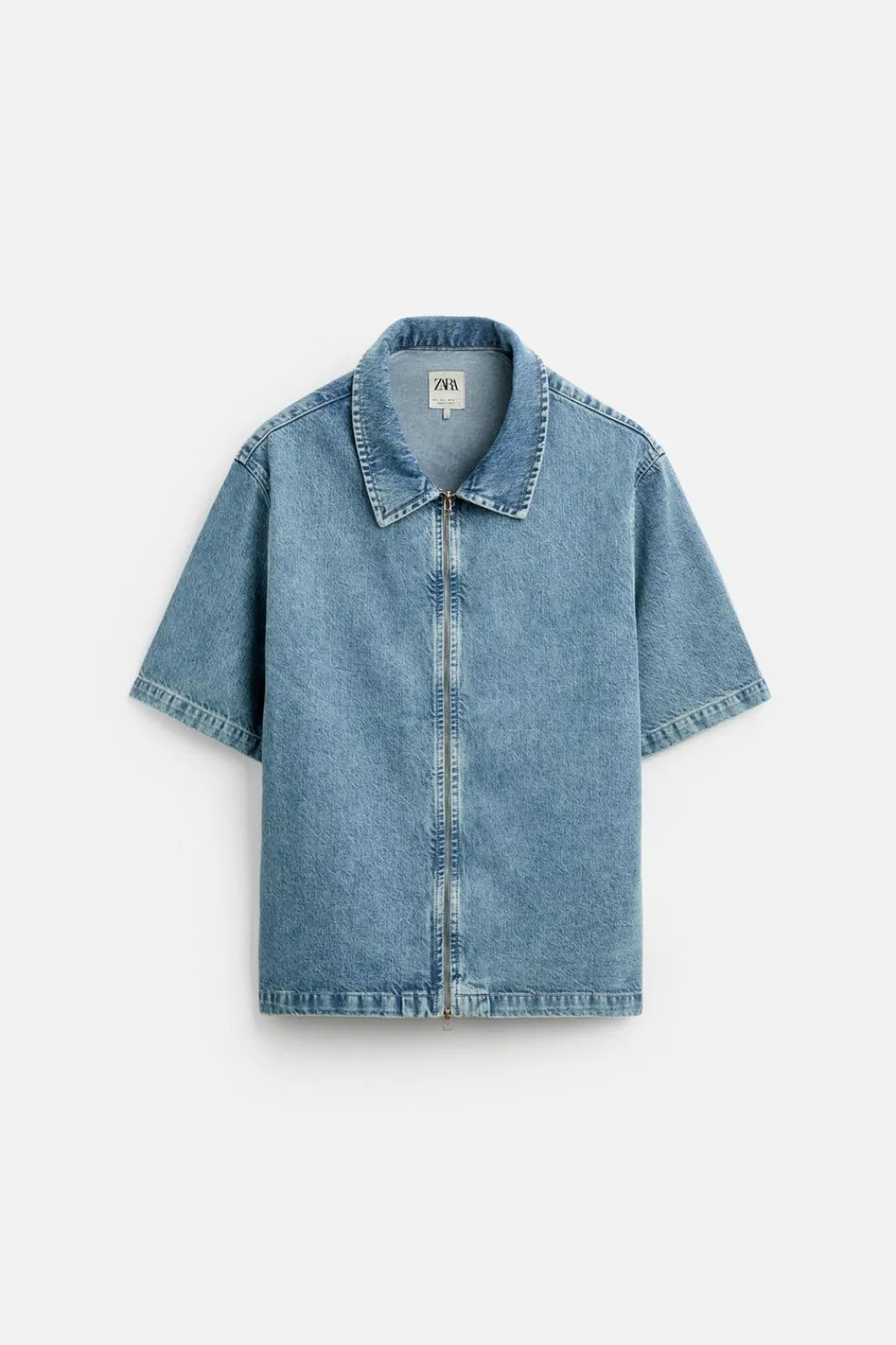 Camisa relaxed fit confeccionada en denim de algodón. Cuello solapa y manga corta. Efecto lavado. Cierre frontal con cremallera.