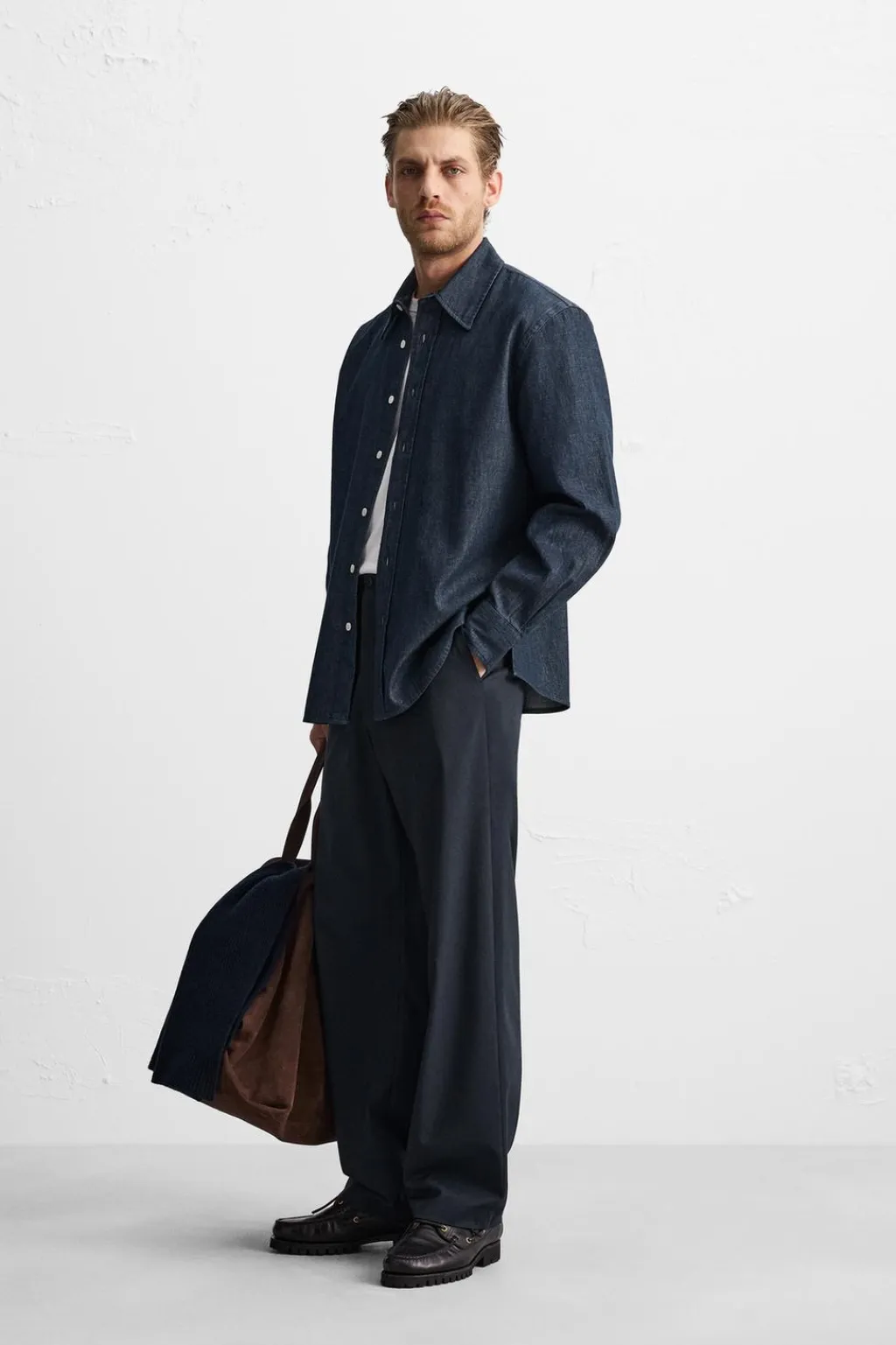 Camisa relaxed fit confeccionada en denim ligero de algodón. Cuello solapa y manga larga acabada en puño con botón. Cierre frontal de botonadura.
