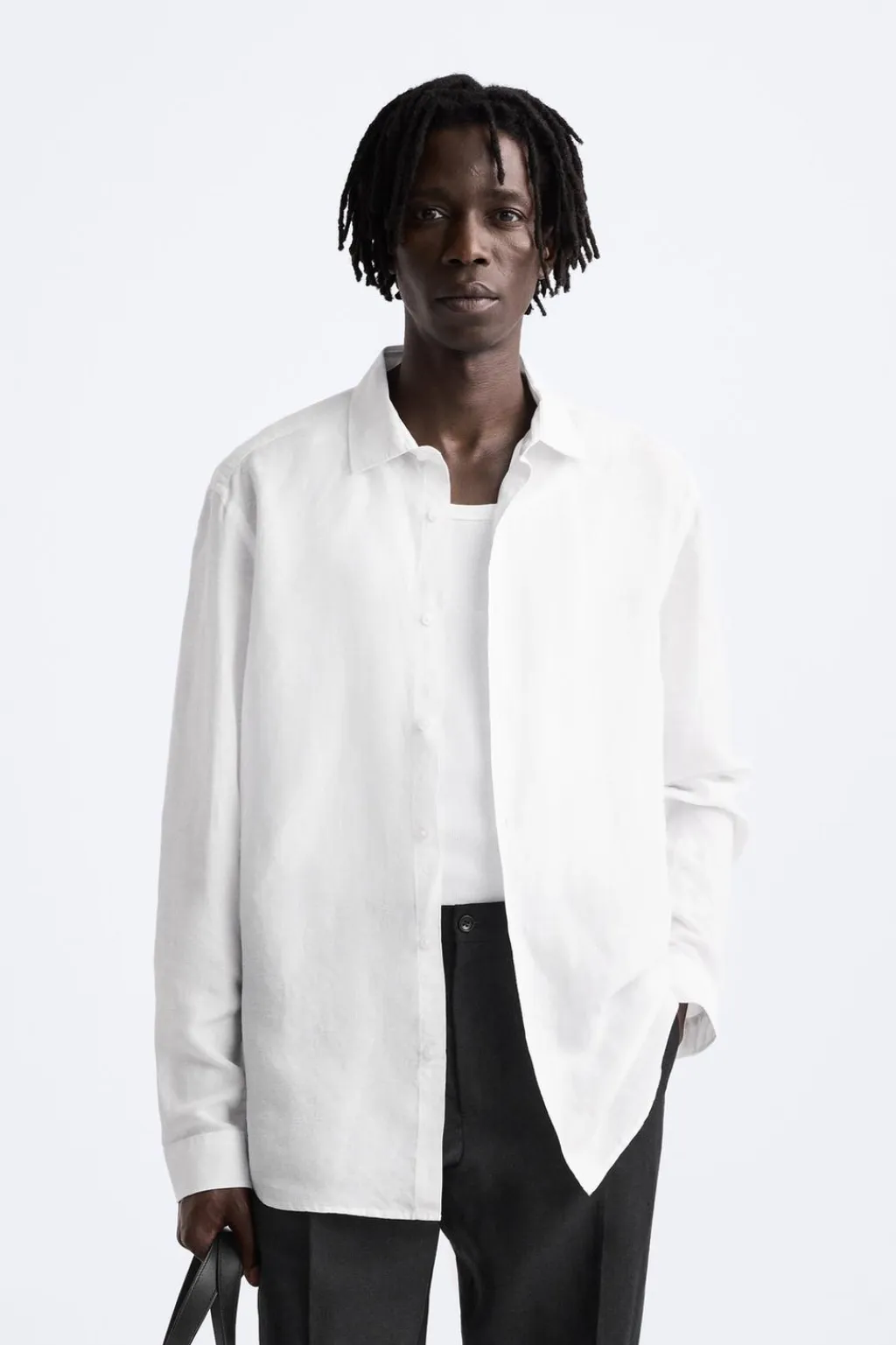 Camisa regular fit confeccionada en tejido con mezcla de lino y lyocell. Cuello italiano y manga larga acabada en puño con botón. Cierre frontal de botonadura.