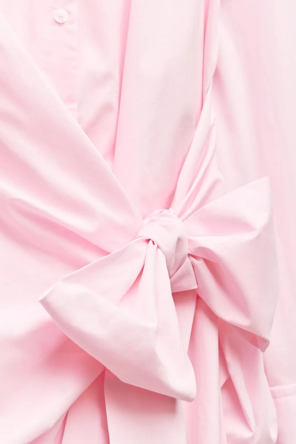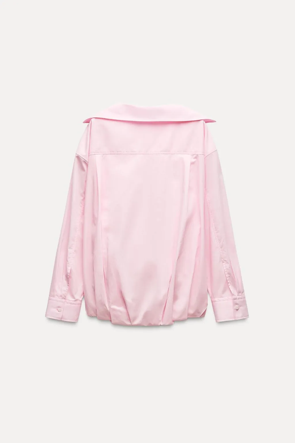 Camisa oversize de cuello solapa y manga larga con hombro caído acabada en puño. Detalle de lazo en delantero. Bajo acabado abullonado con pliegues. Cierre frontal con botones.
