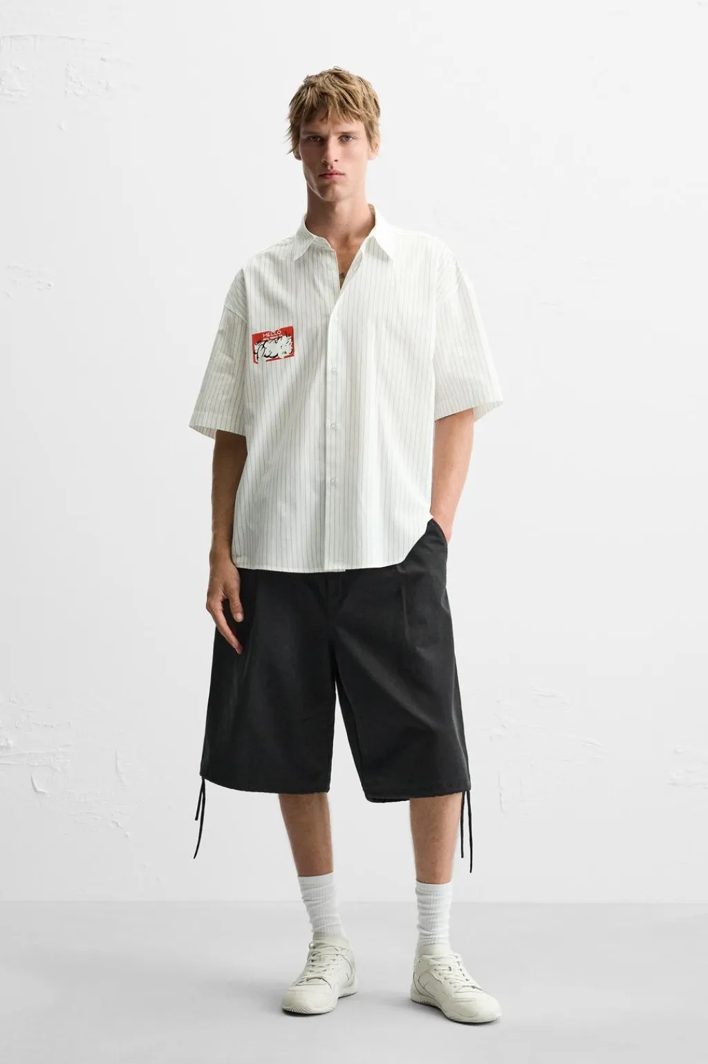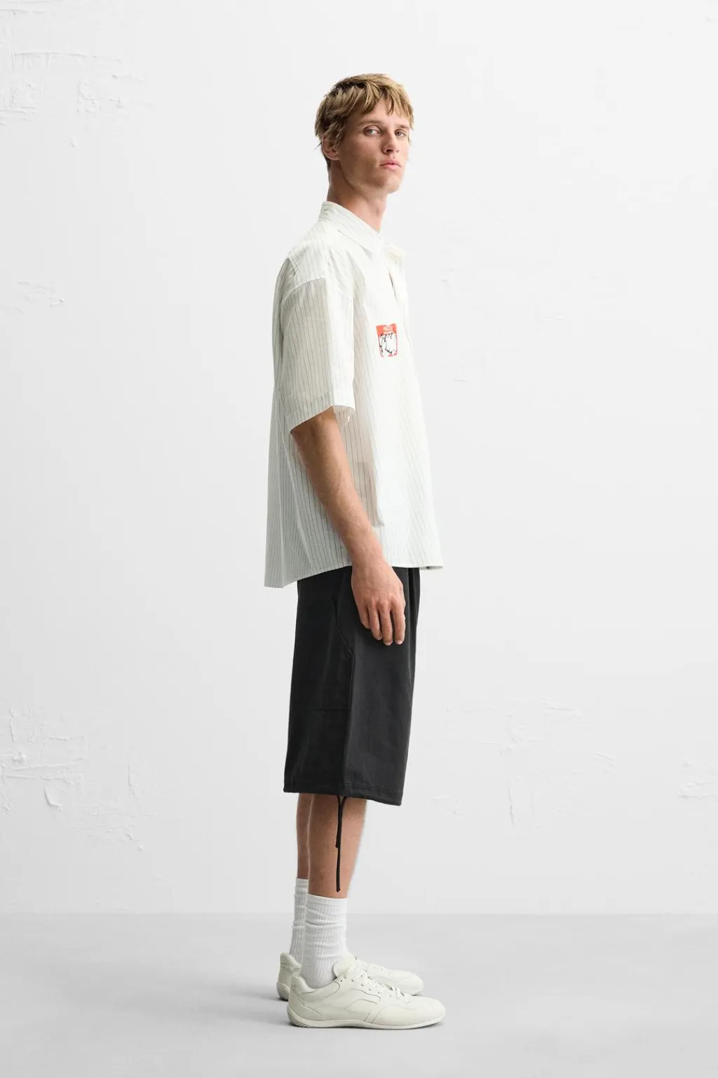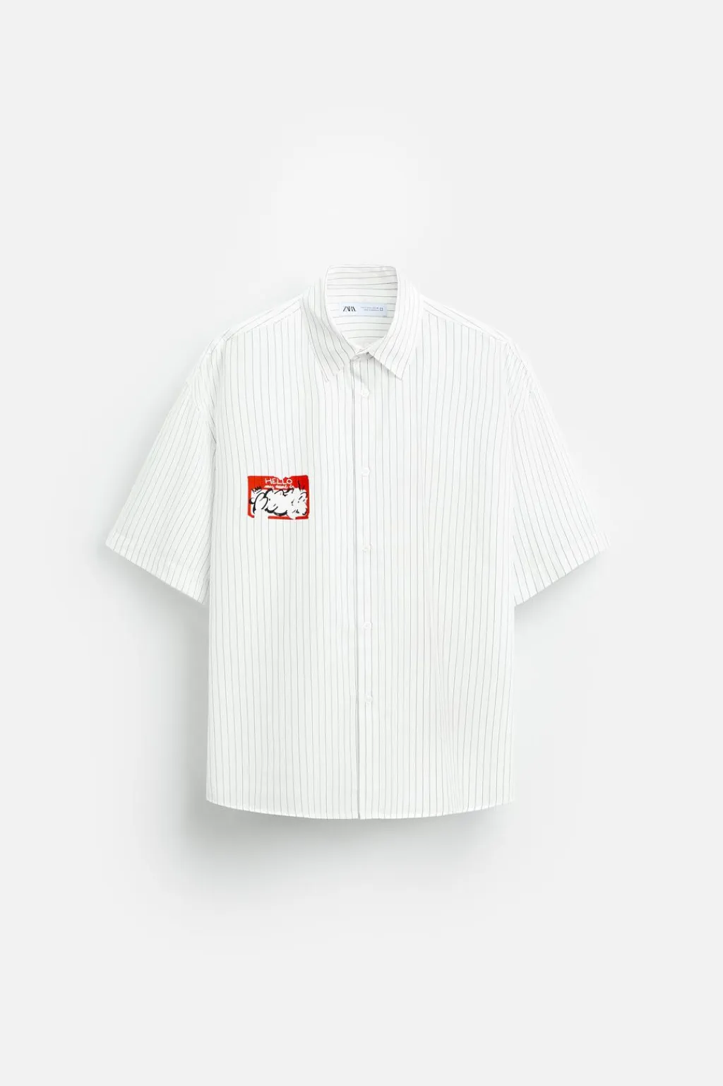Camisa relaxed fit confeccionada en tejido de algodón. Cuello solapa y manga corta. Detalle de estampado combinado a contraste en pecho. Cierre frontal de botonadura.