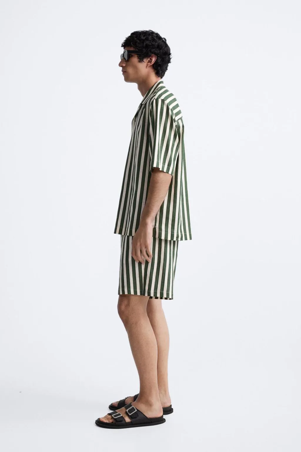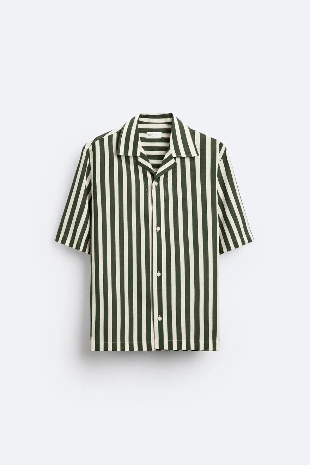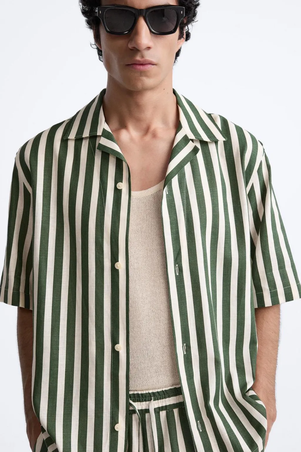 Camisa relaxed fit confeccionada en tejido con mezcla de lino y viscosa. Cuello bowling y manga corta. Bajo con aberturas laterales. Cierre frontal de botonadura.