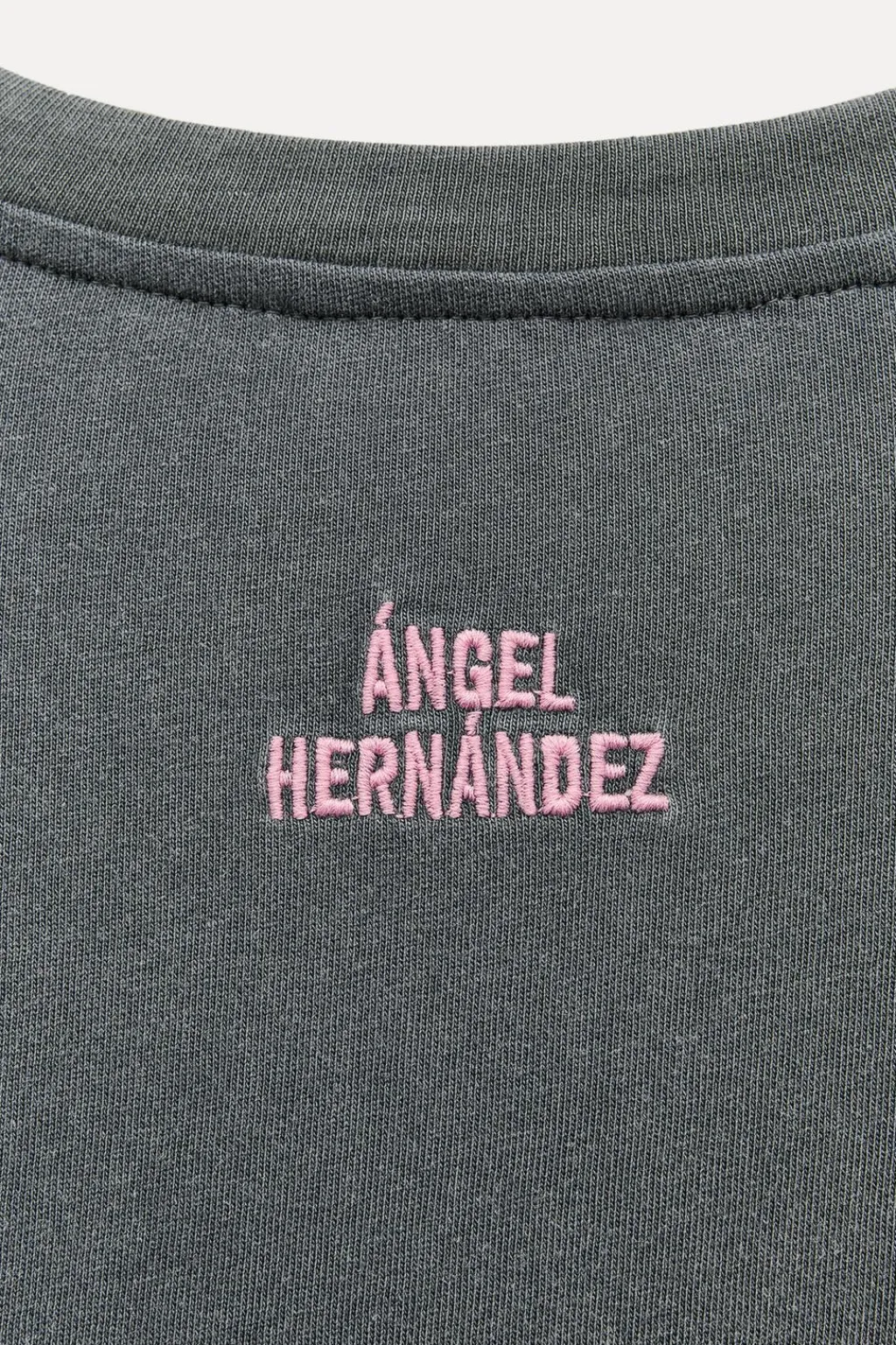 Camiseta confeccionada en hilatura de algodón. Cuello redondo y manga larga. Detalle de estampación Ángel Hernández en delantero.