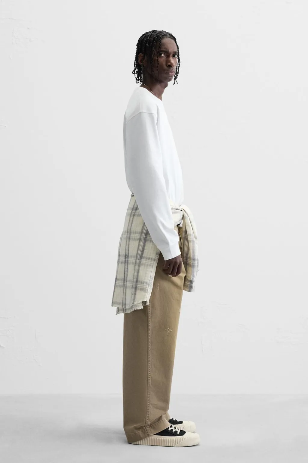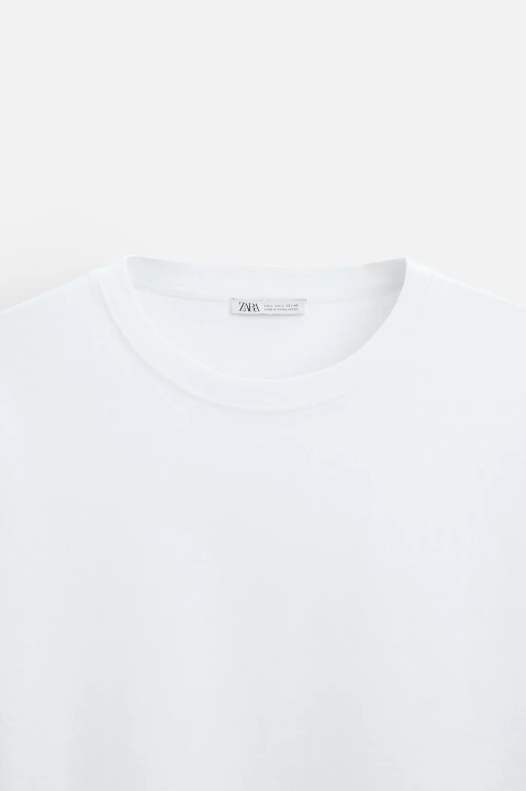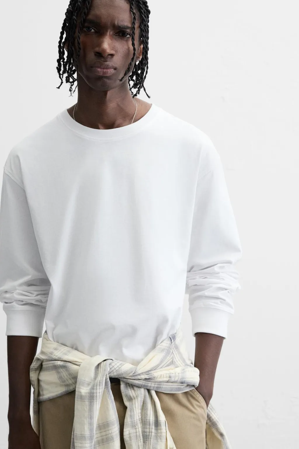 Camiseta relaxed fit confeccionada en tejido de algosón compacto. Cuello redondo y manga larga acabada en puño de rib.