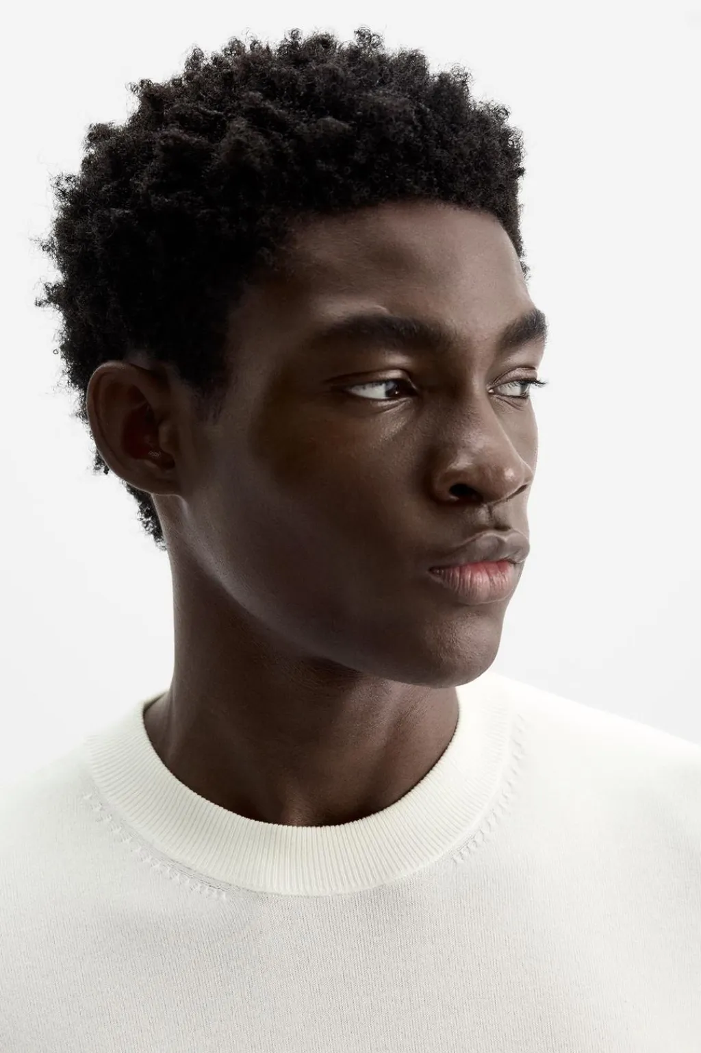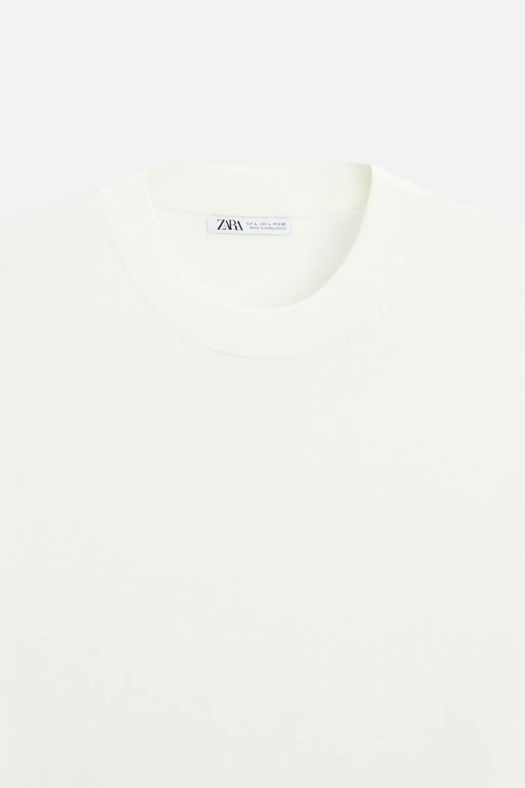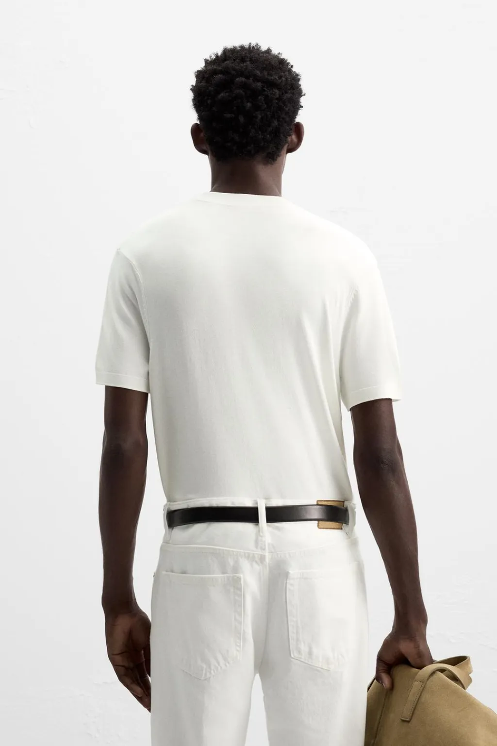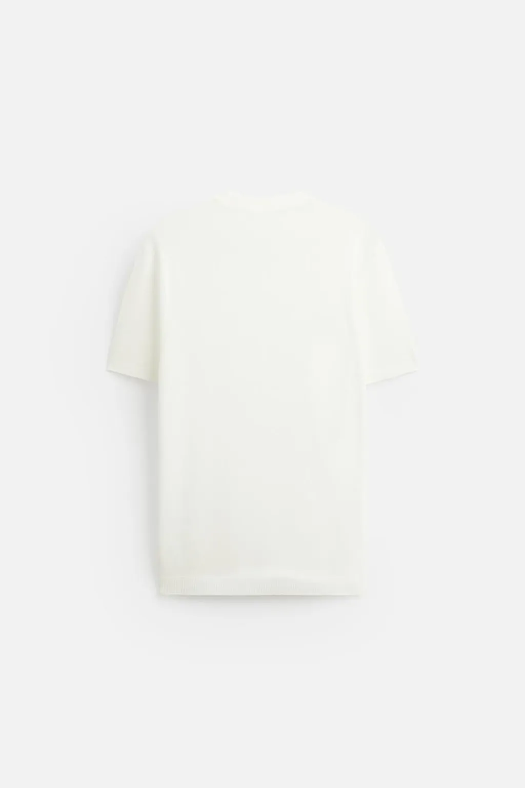 Camiseta relaxed fit de punto tejido en hilatura con mezcla de viscosa. Cuello perkins y manga corta. Acabados en rib.