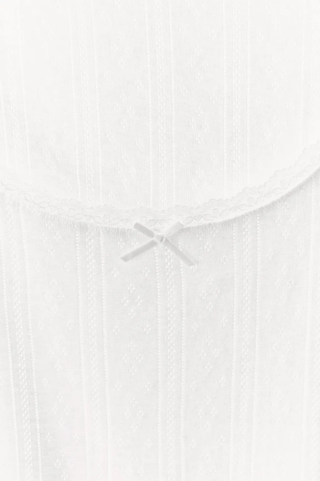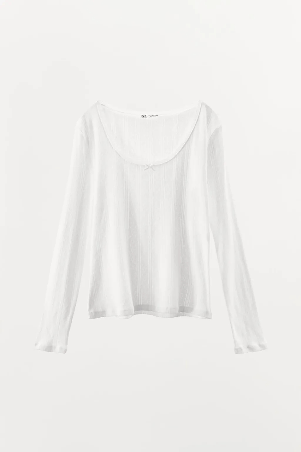 Camiseta confeccionada en hilatura de algodón 100%. Escote redondo y manga larga. Detalle de puntilla a tono y aplicación de lazo satinado en pecho.
